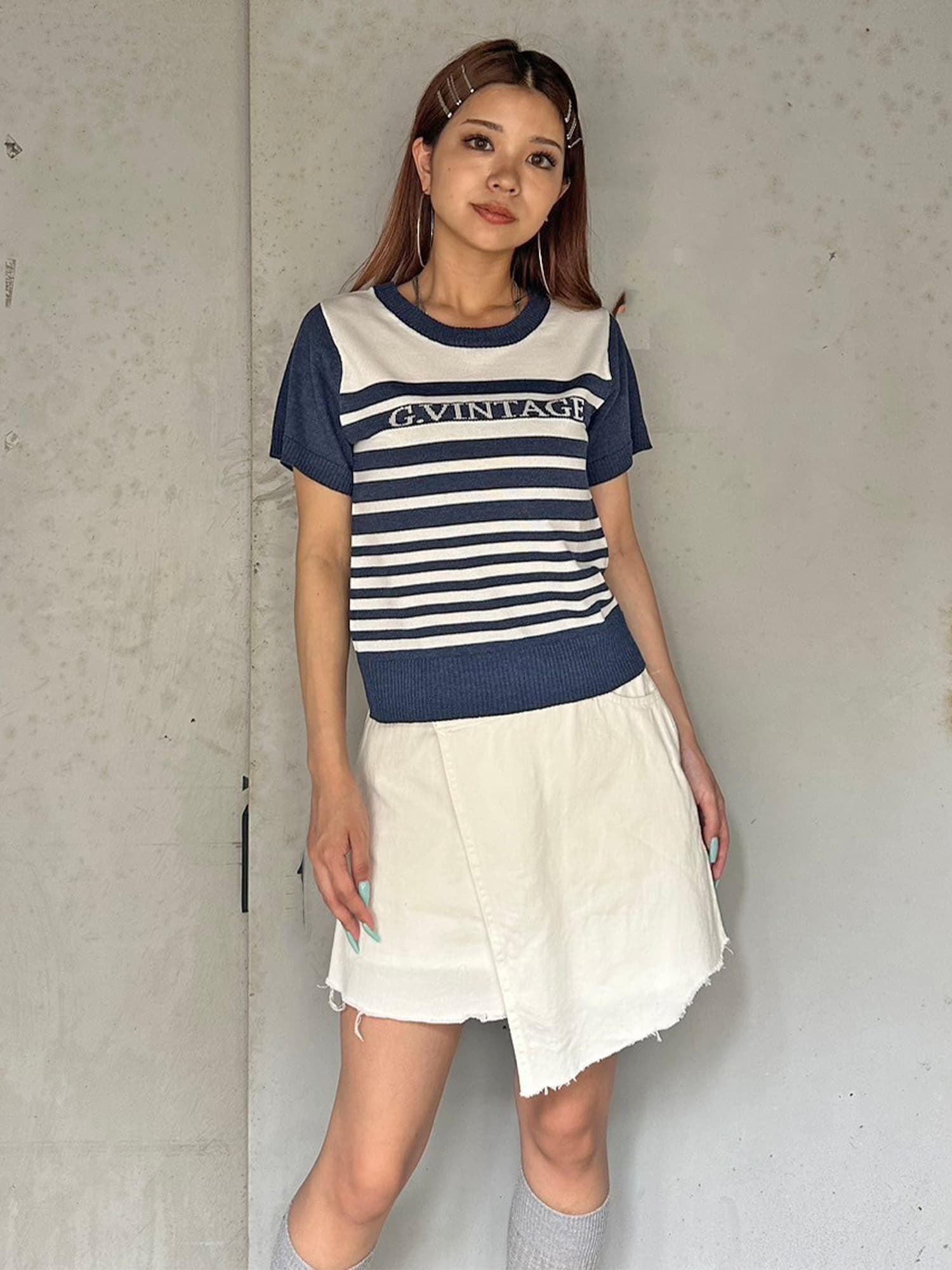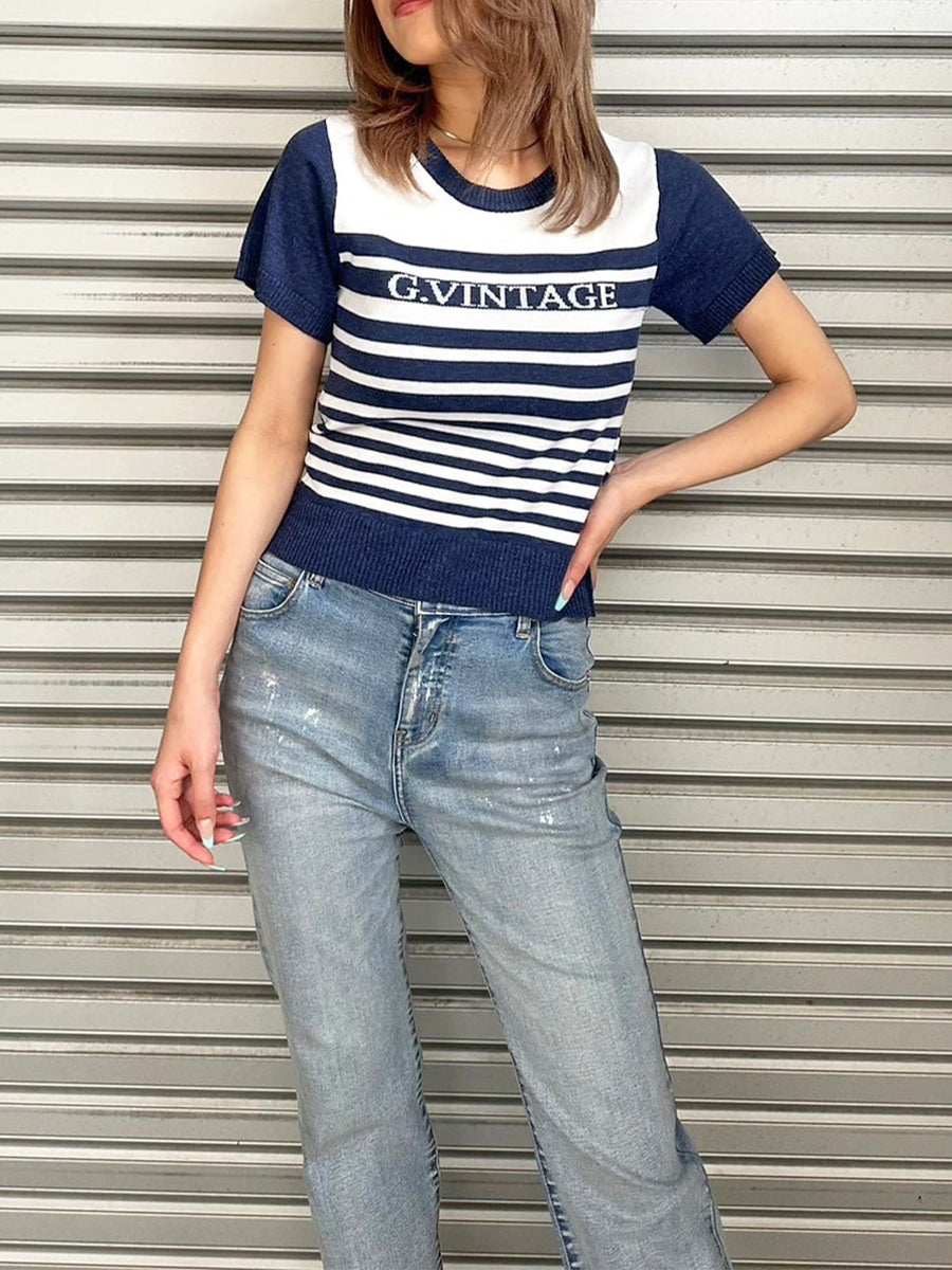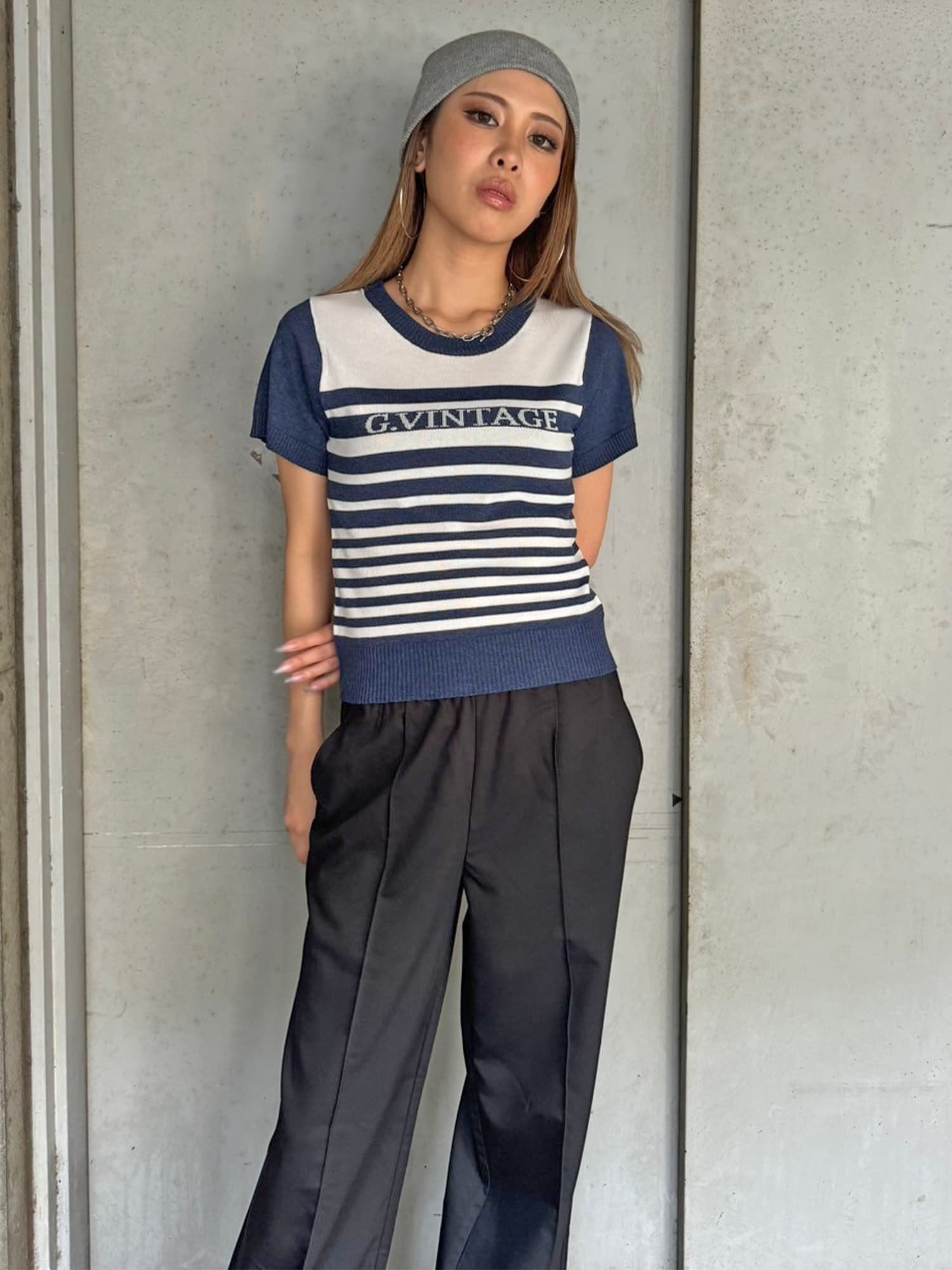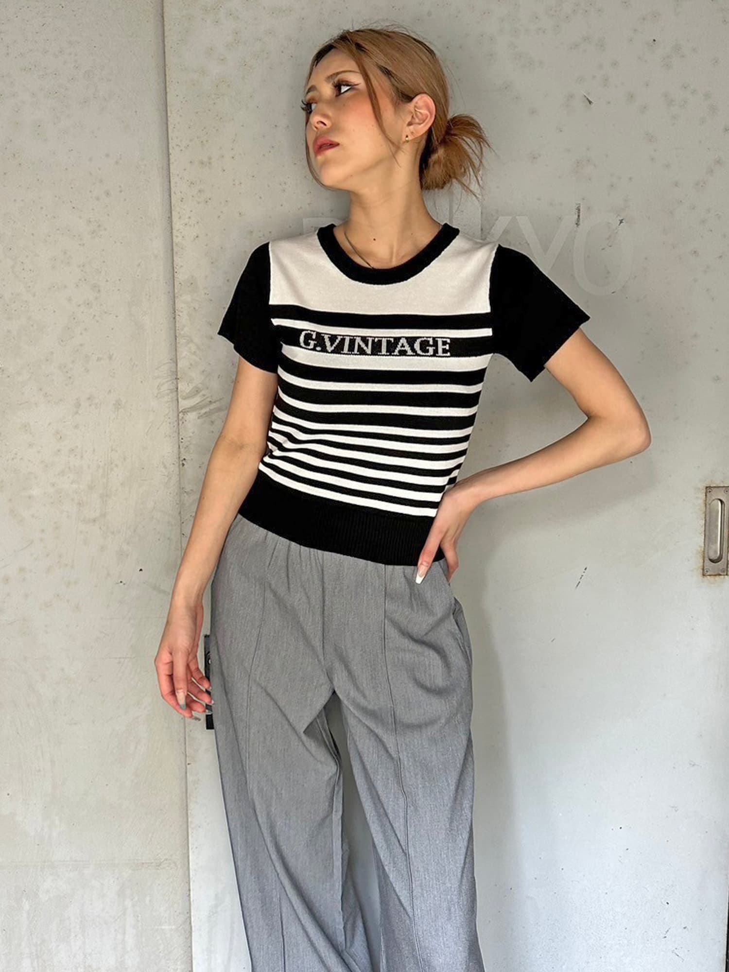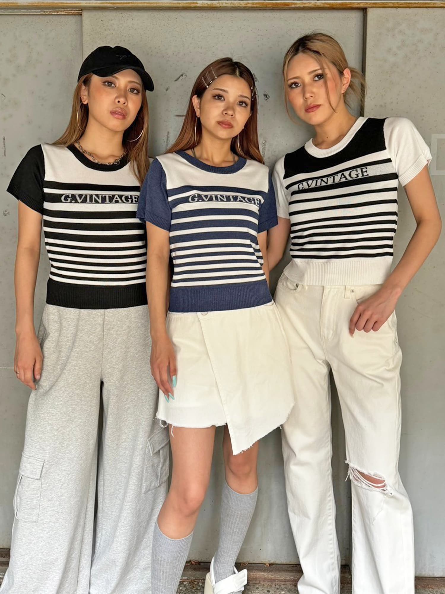 さらっとしたニットで全体的に少しゆとりを持たせているので締め付け感が無く、スッキリとした着心地です。クルーネックのランダムボーダーでカジュアル感を演出しつつコンパクトなシルエットで女っぽさも感じられるMIXアイテム。ボトムスや小物合わせ次第でコーデの雰囲気も変わります。ロゴはシーズンテーマのglam vintage。綺麗めなフォントにしています。