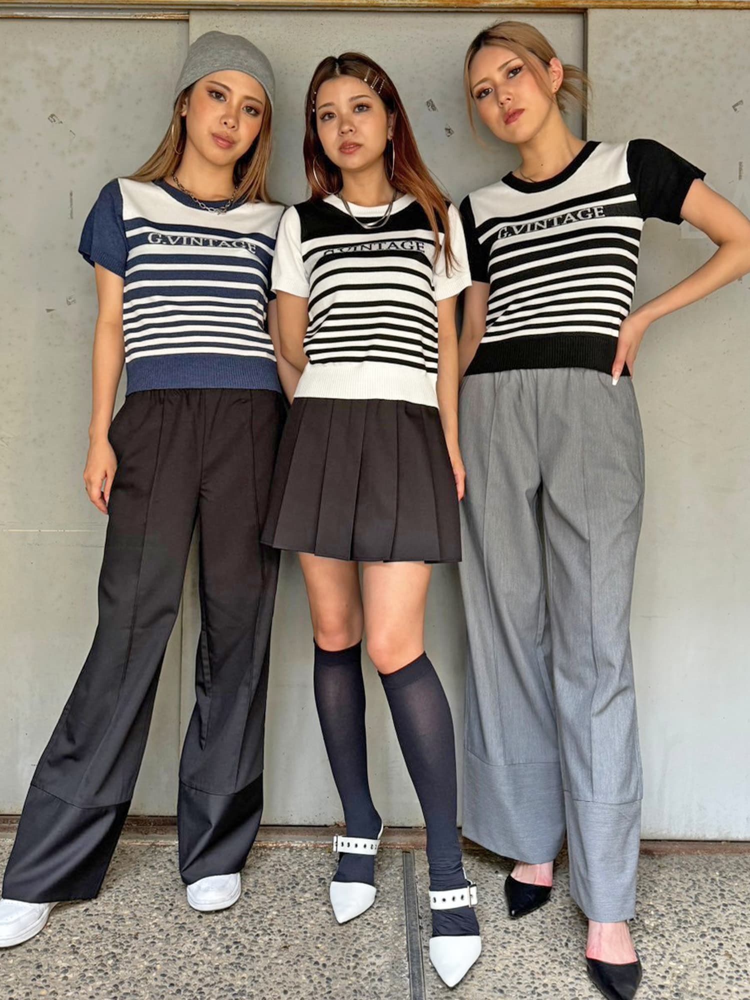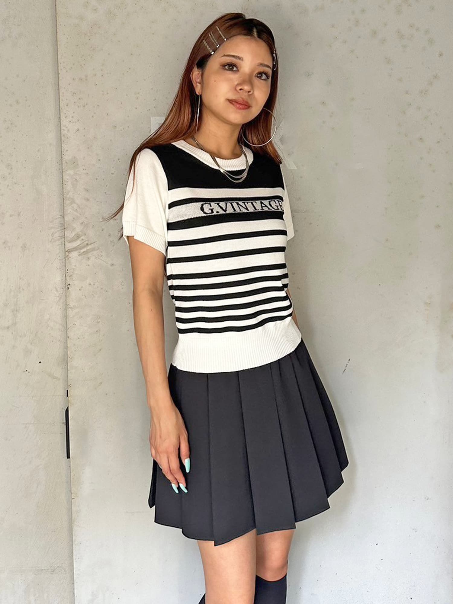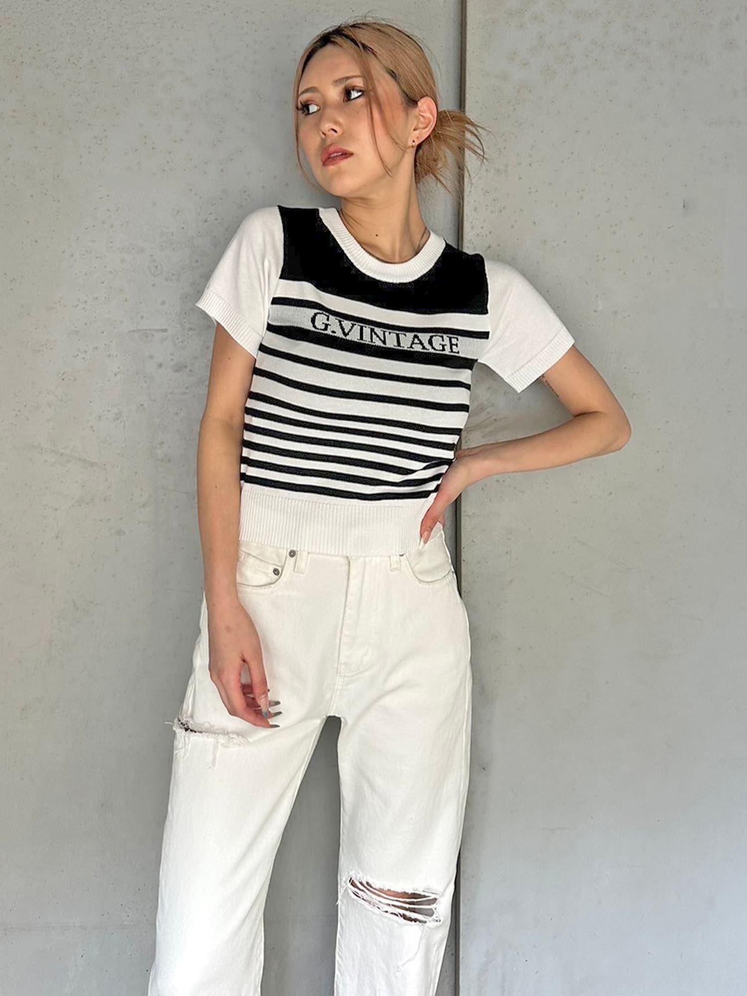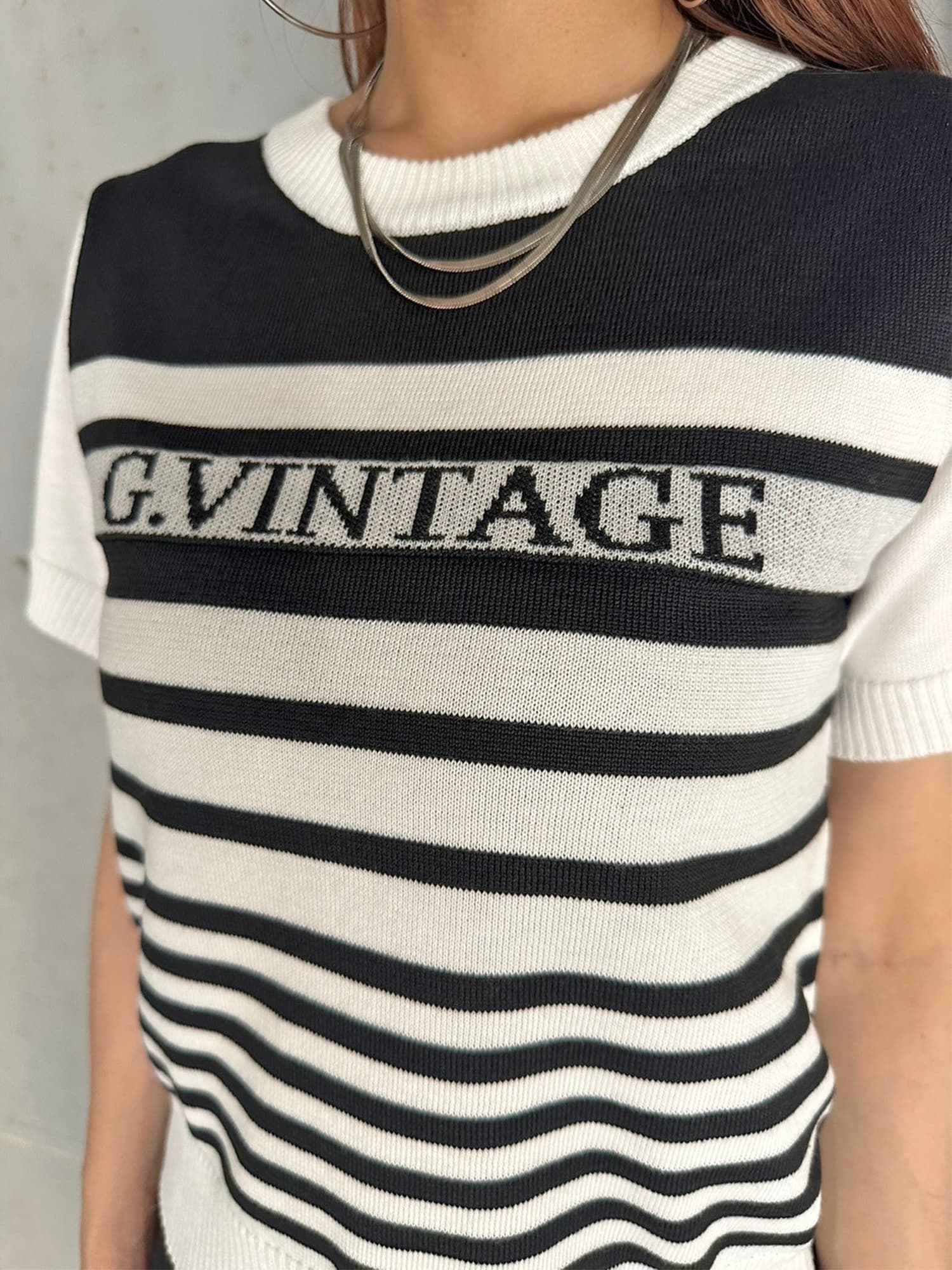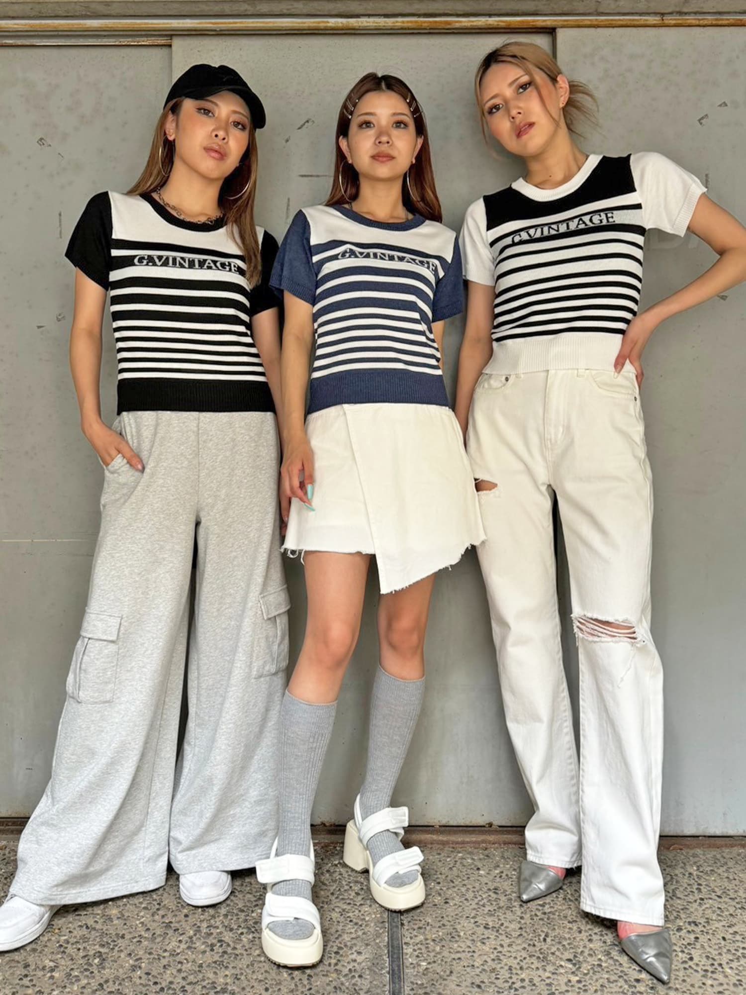 さらっとしたニットで全体的に少しゆとりを持たせているので締め付け感が無く、スッキリとした着心地です。クルーネックのランダムボーダーでカジュアル感を演出しつつコンパクトなシルエットで女っぽさも感じられるMIXアイテム。ボトムスや小物合わせ次第でコーデの雰囲気も変わります。ロゴはシーズンテーマのglam vintage。綺麗めなフォントにしています。