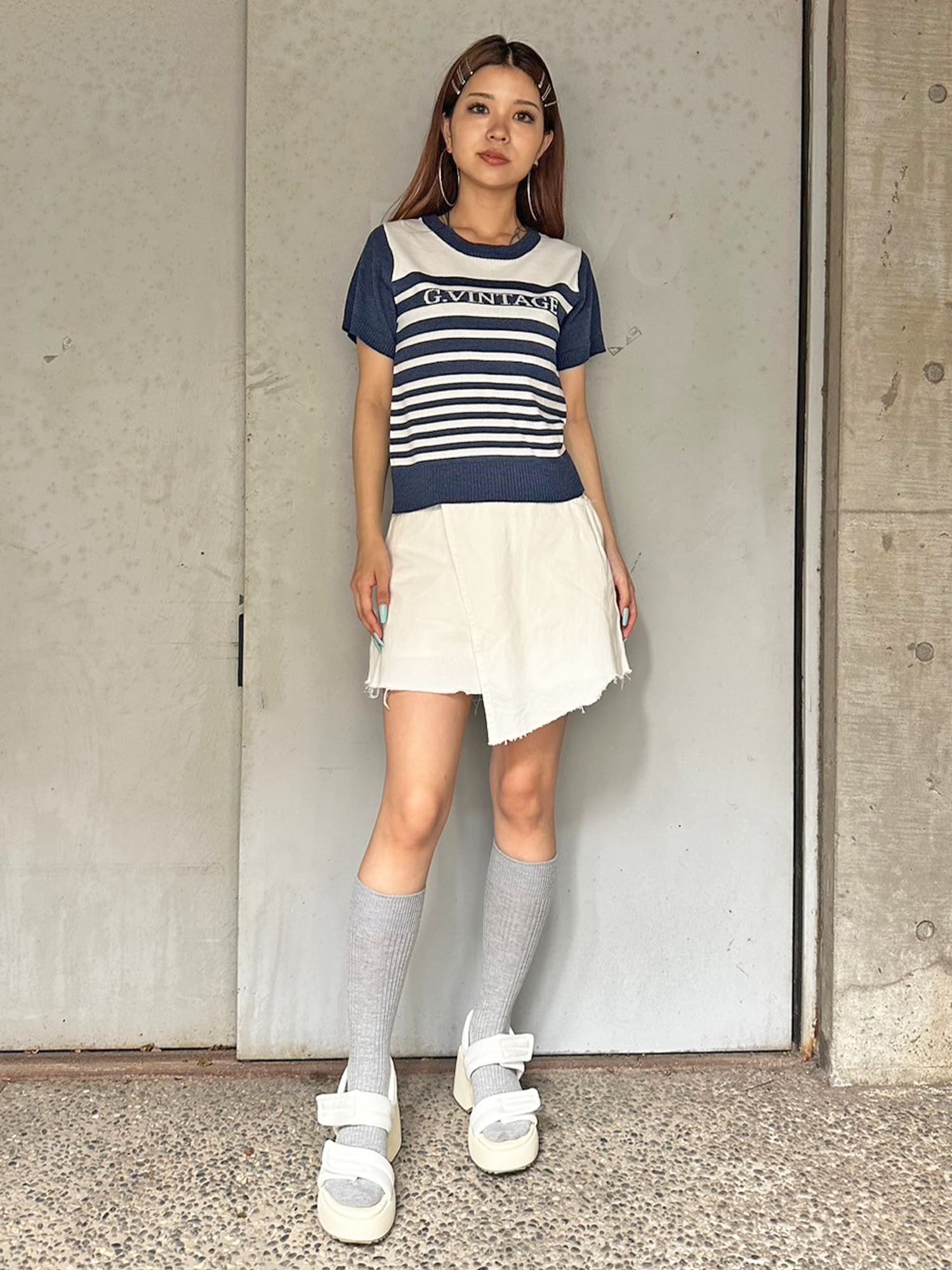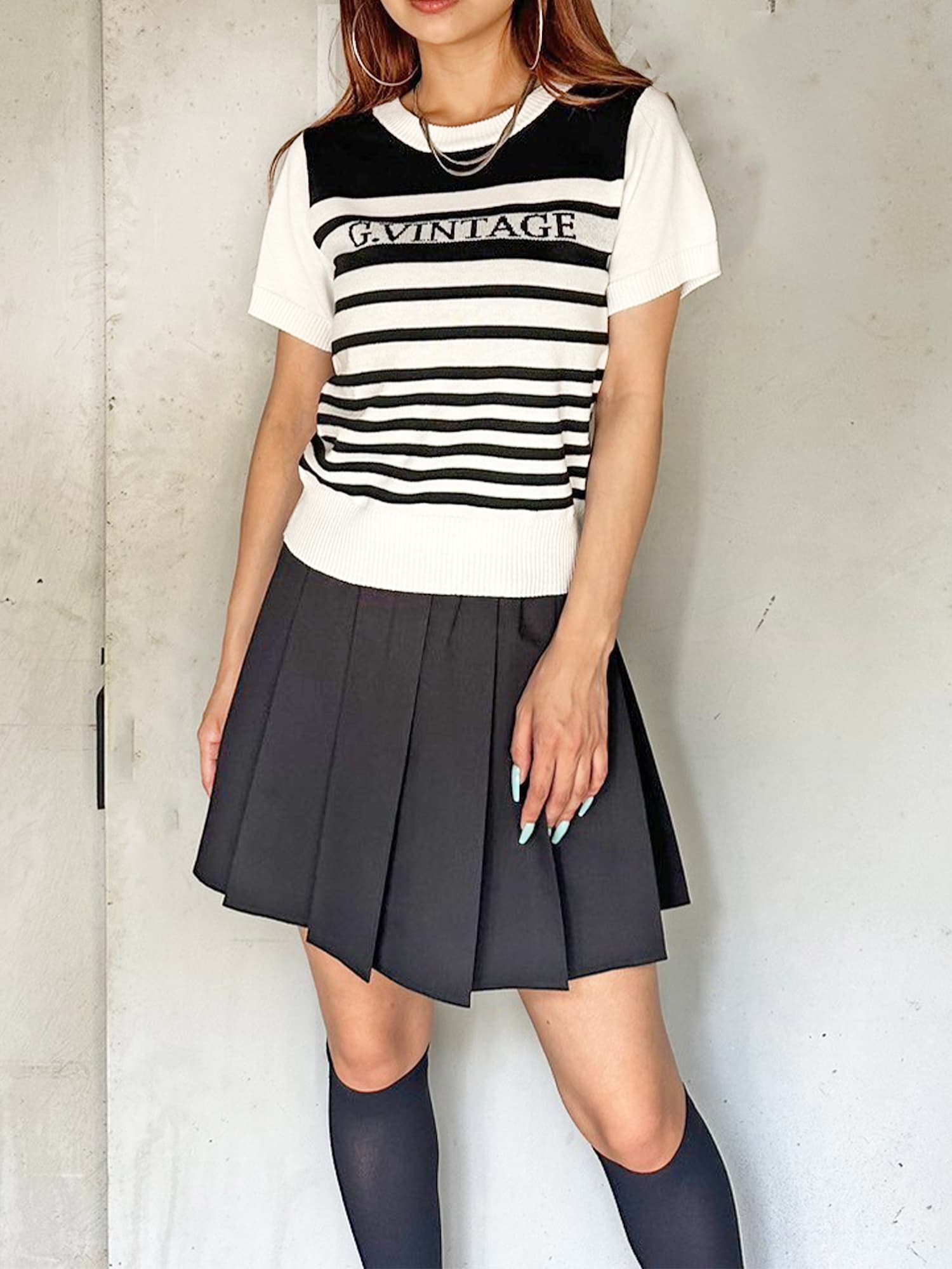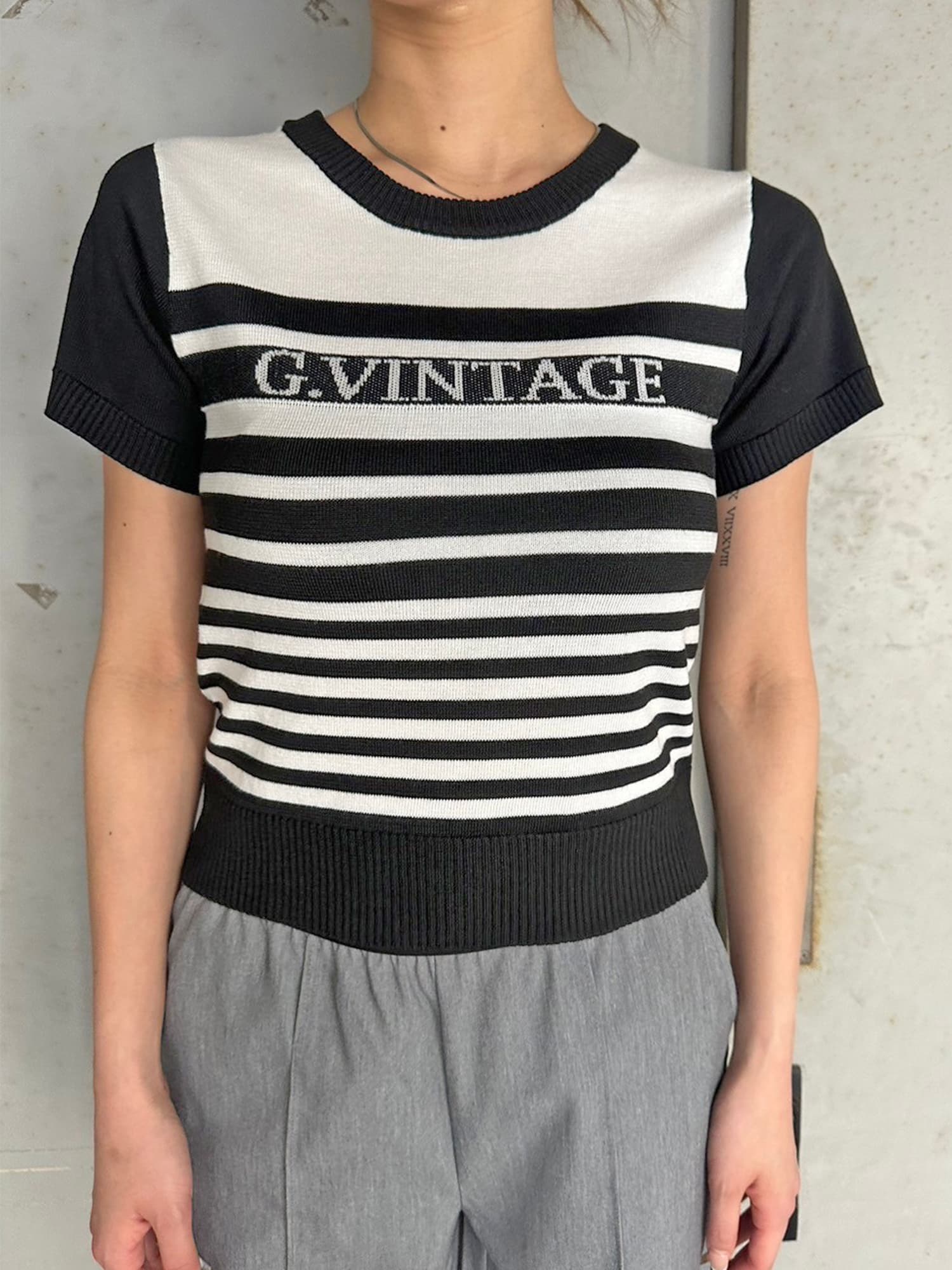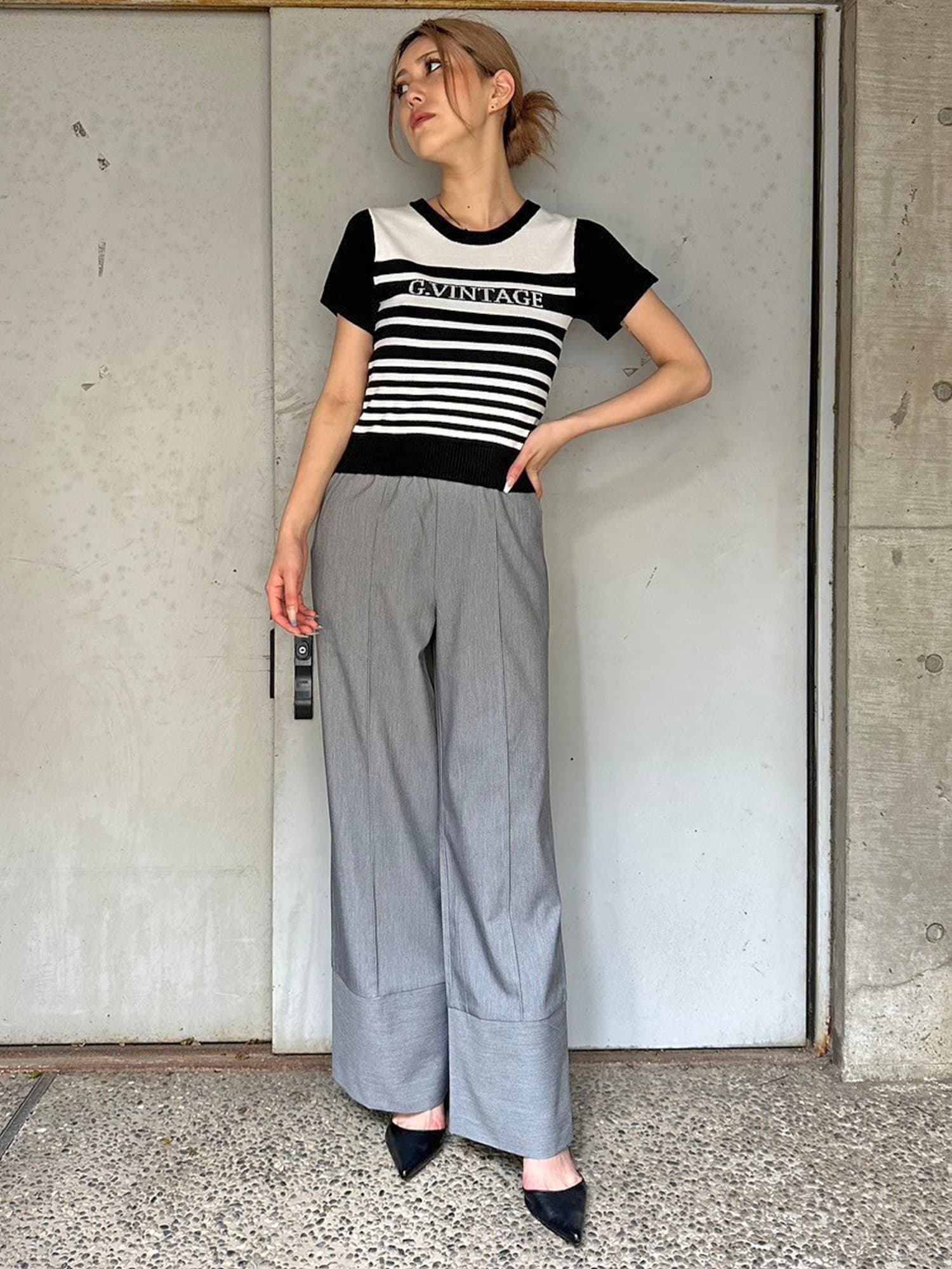 さらっとしたニットで全体的に少しゆとりを持たせているので締め付け感が無く、スッキリとした着心地です。クルーネックのランダムボーダーでカジュアル感を演出しつつコンパクトなシルエットで女っぽさも感じられるMIXアイテム。ボトムスや小物合わせ次第でコーデの雰囲気も変わります。ロゴはシーズンテーマのglam vintage。綺麗めなフォントにしています。