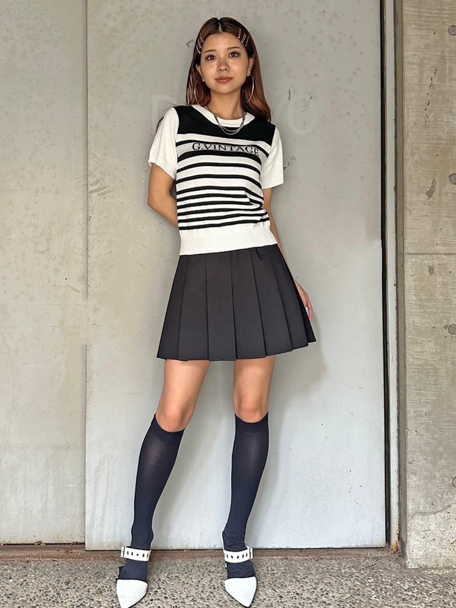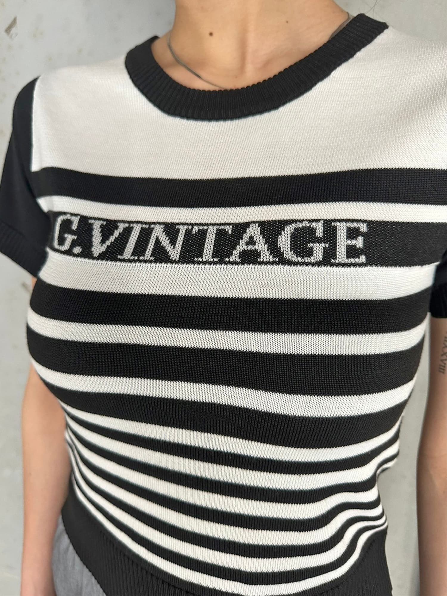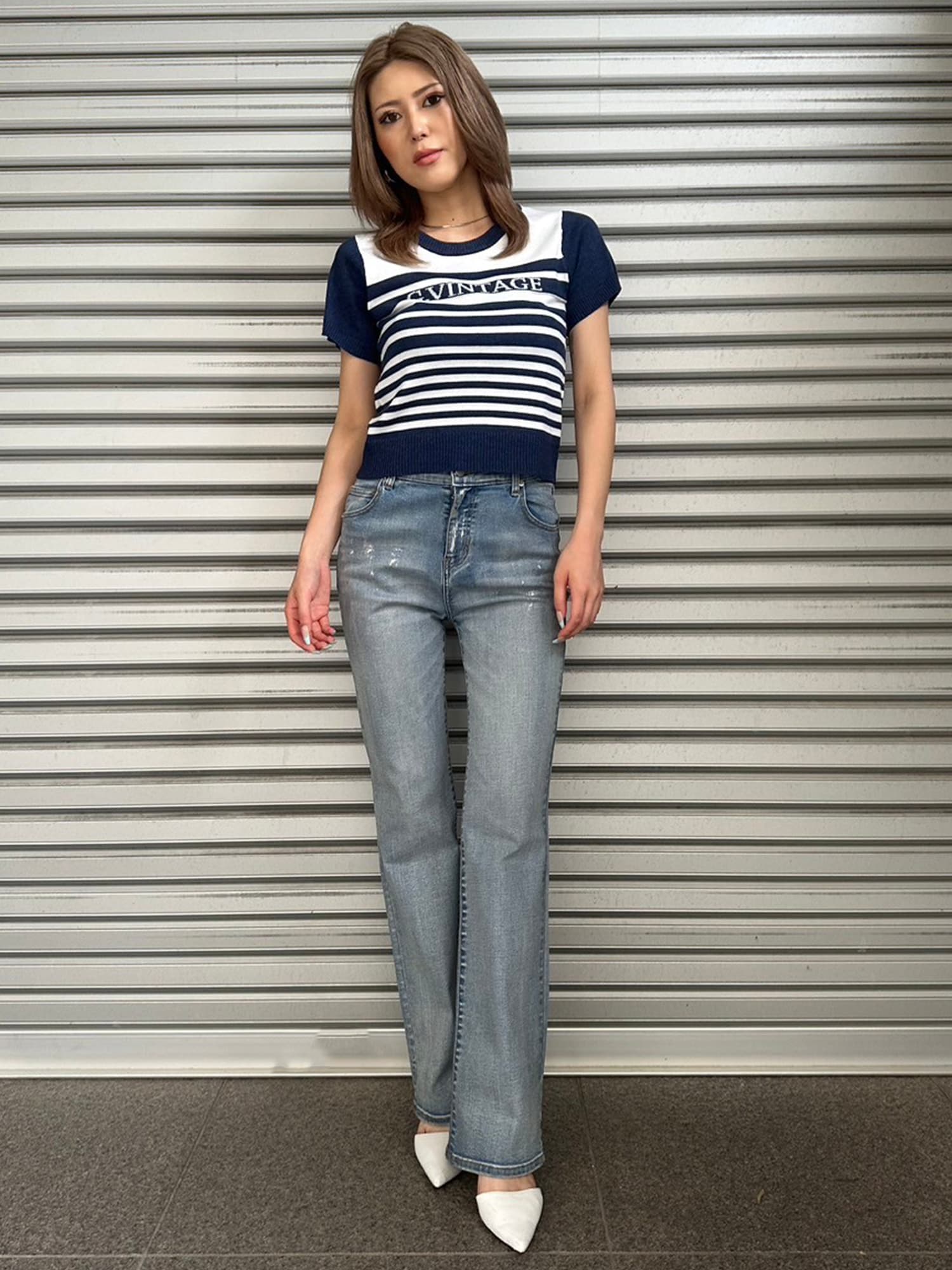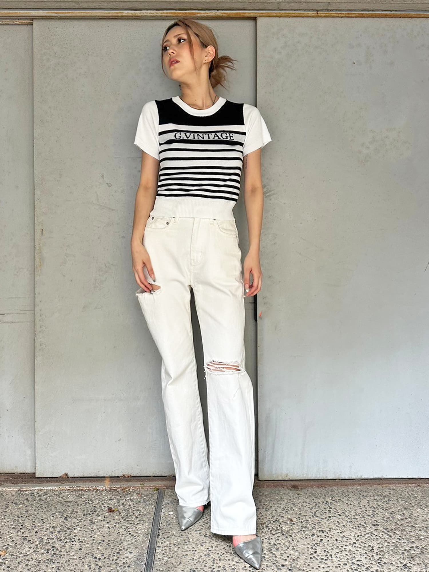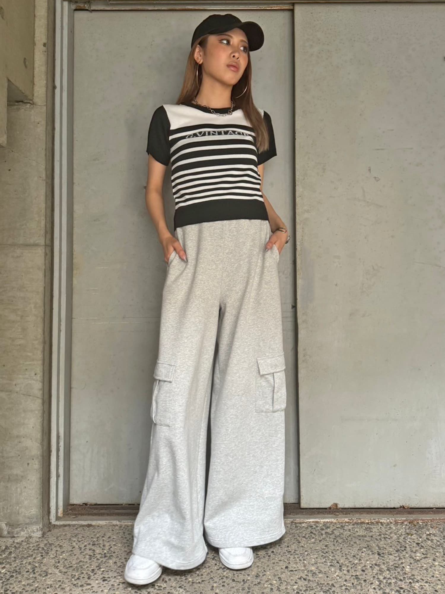さらっとしたニットで全体的に少しゆとりを持たせているので締め付け感が無く、スッキリとした着心地です。クルーネックのランダムボーダーでカジュアル感を演出しつつコンパクトなシルエットで女っぽさも感じられるMIXアイテム。ボトムスや小物合わせ次第でコーデの雰囲気も変わります。ロゴはシーズンテーマのglam vintage。綺麗めなフォントにしています。