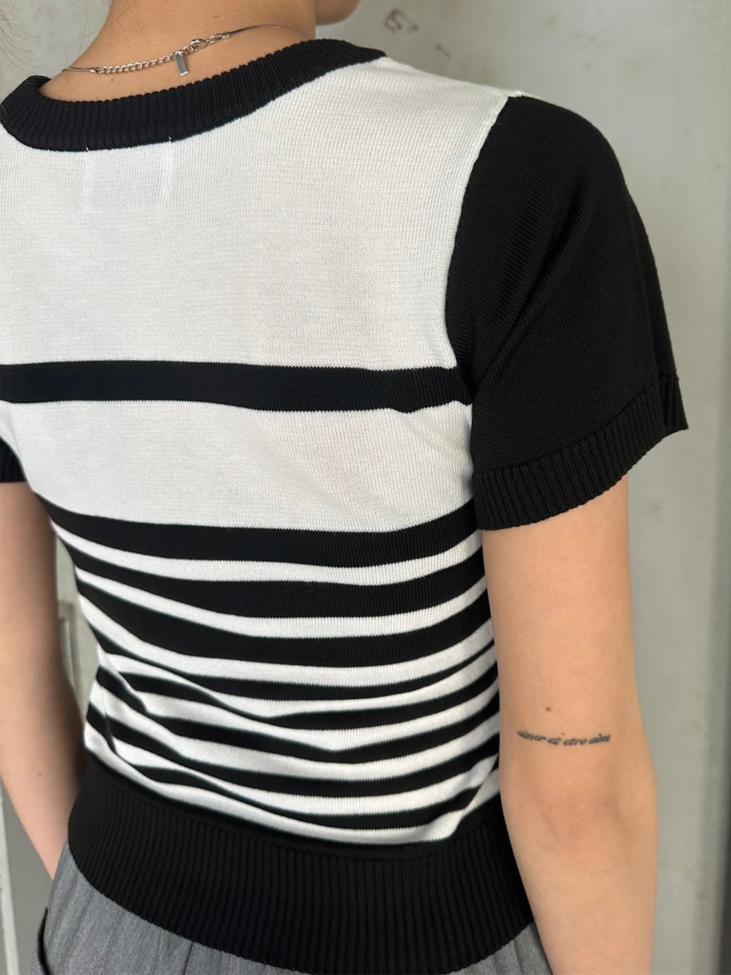 衿?袖?裾はワンカラー、身頃をランダムボーダーにした薄手の半袖サマーニットトップス。
