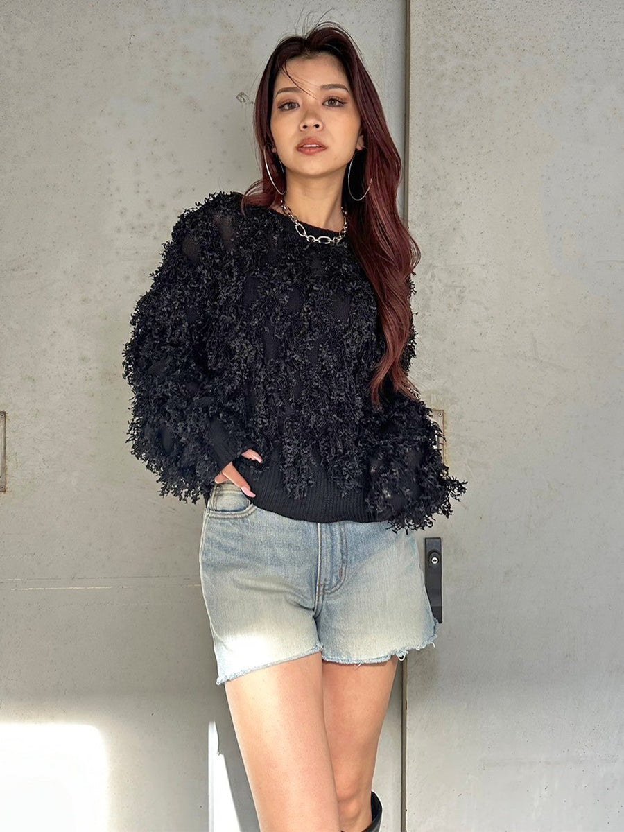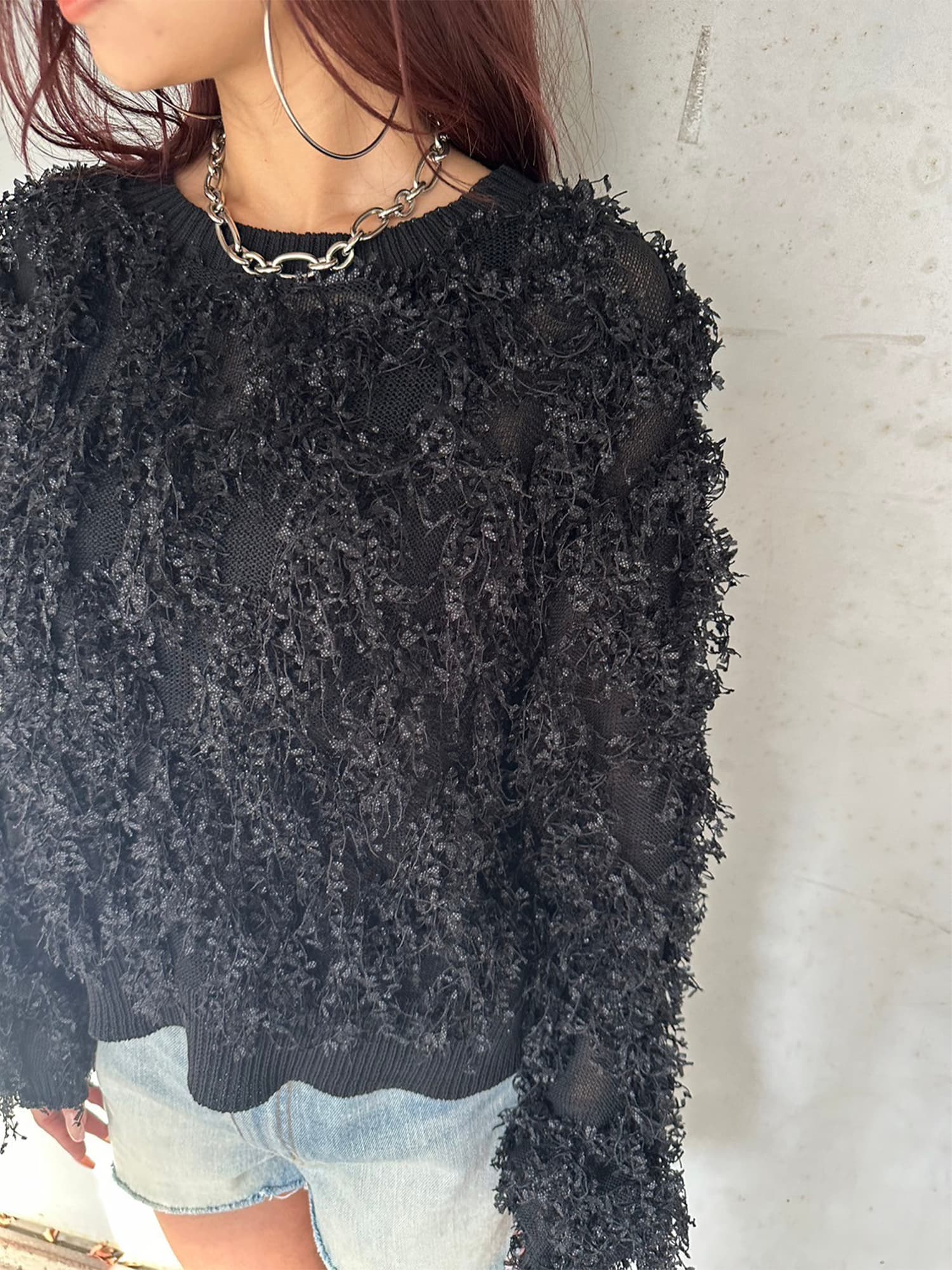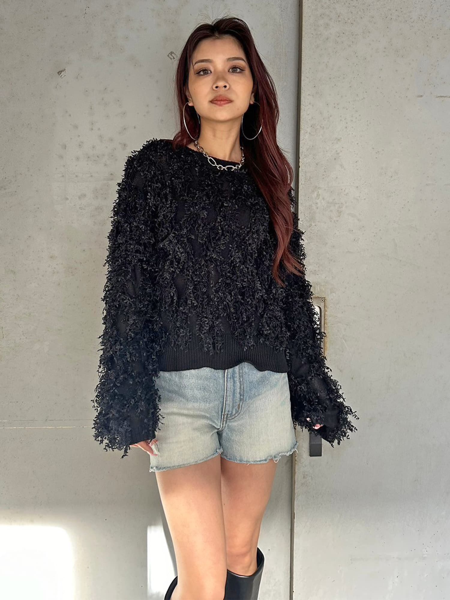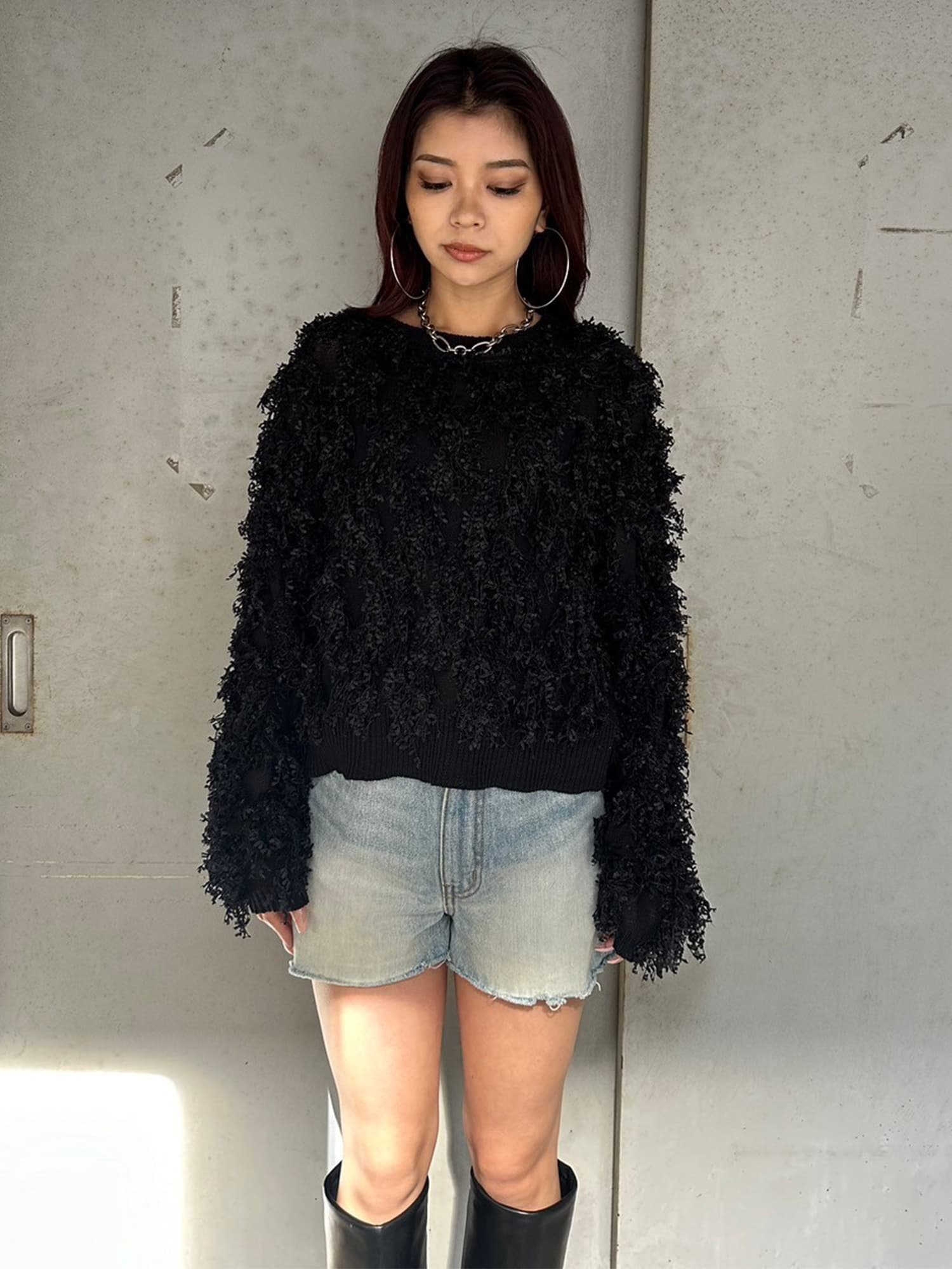 ふわふわとした独特な質感が特徴のフラッグヤーンを使用したニットトップス。