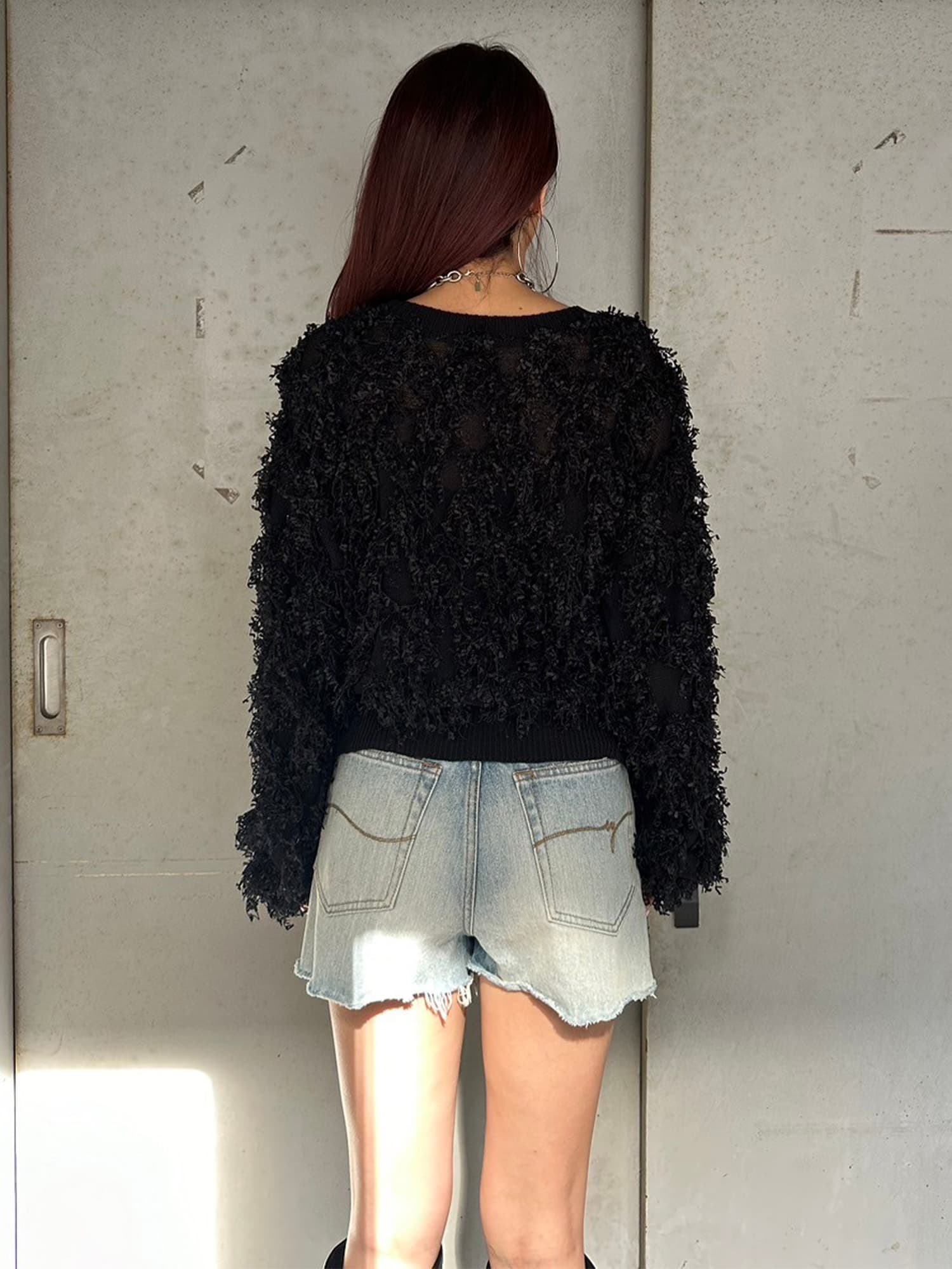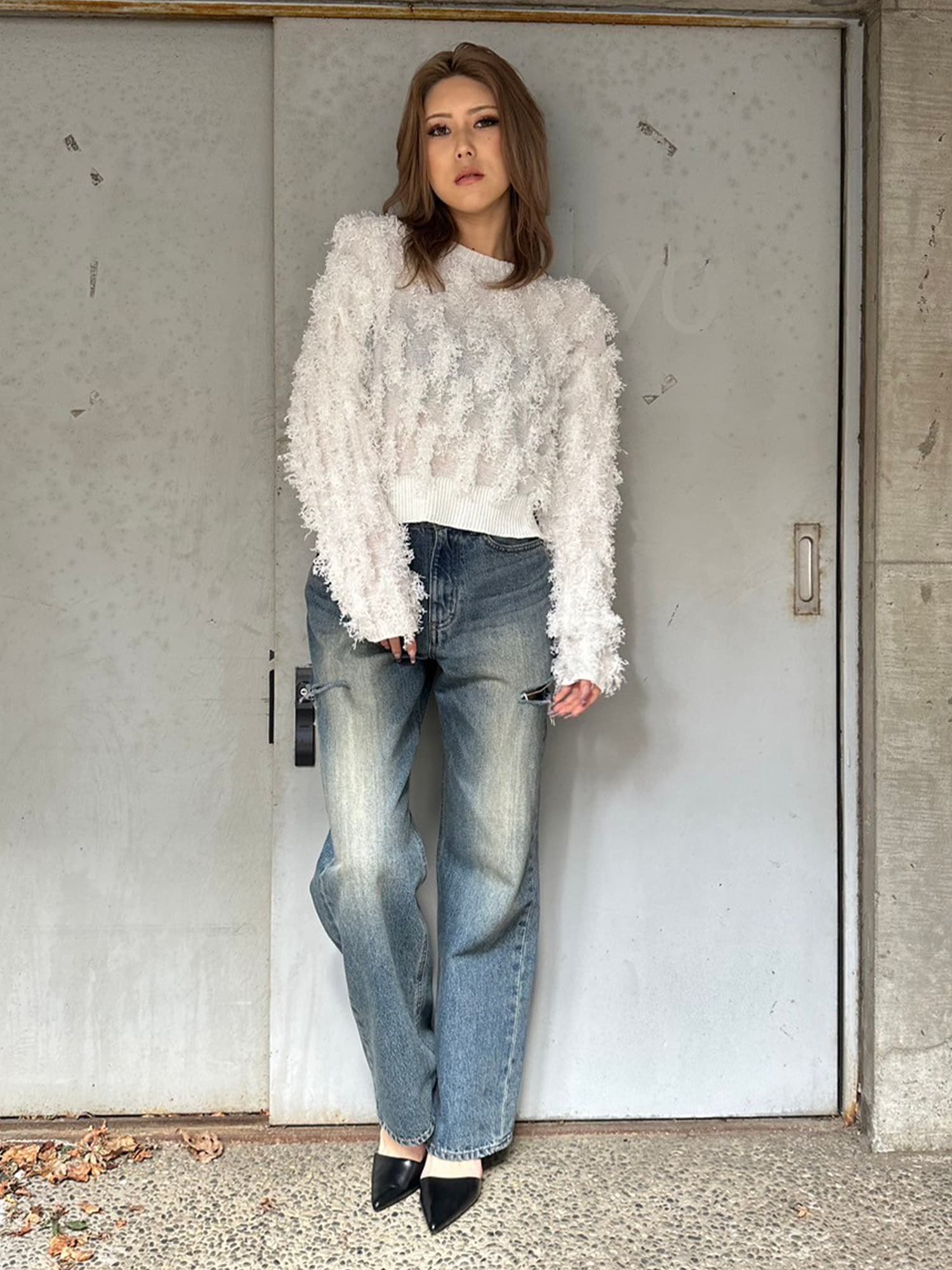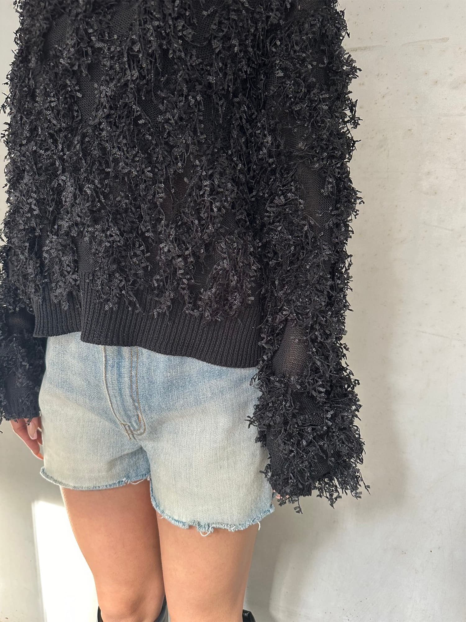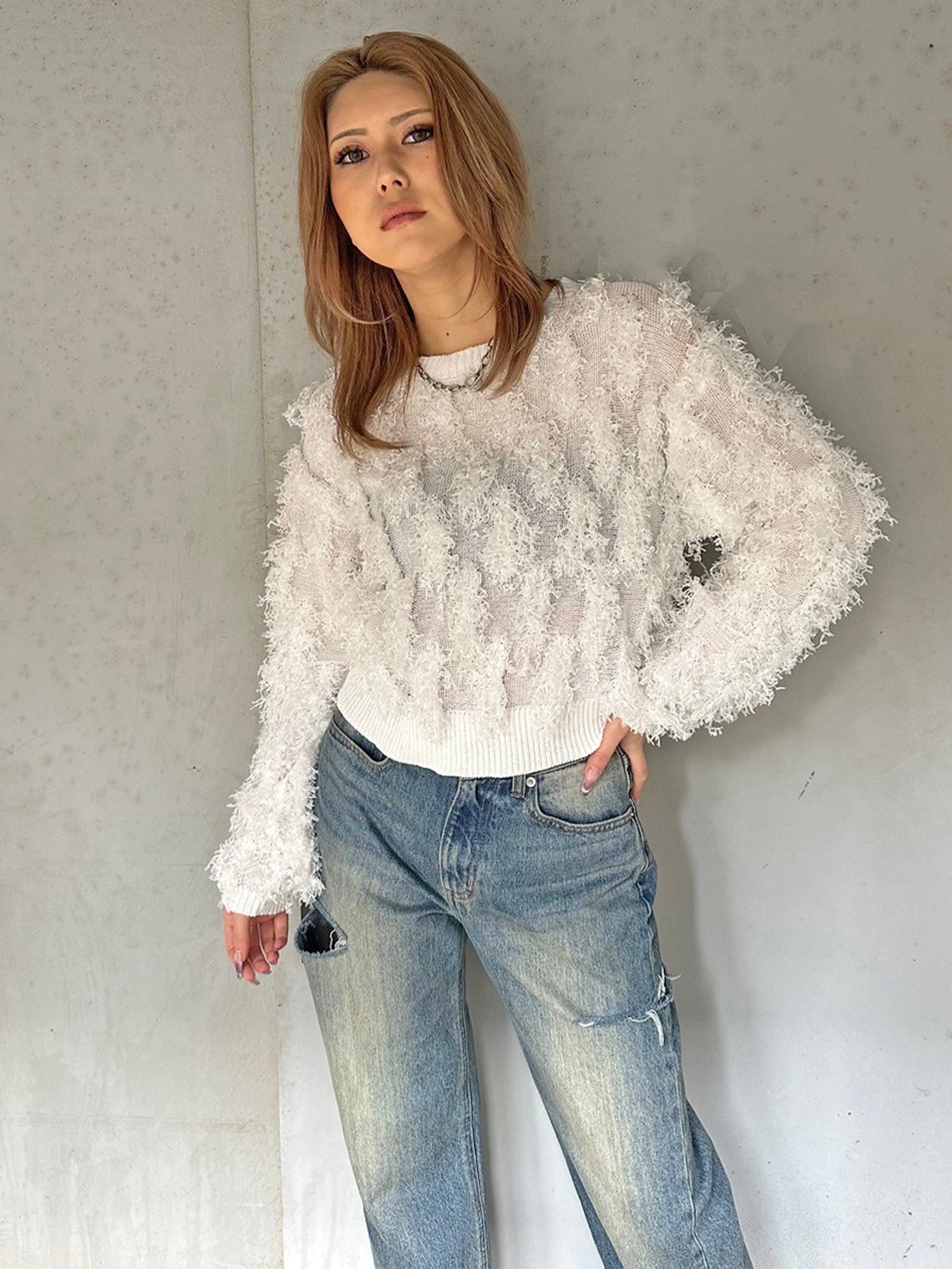 ふわふわとした独特な質感が特徴のフラッグヤーンを使用したニットトップス。