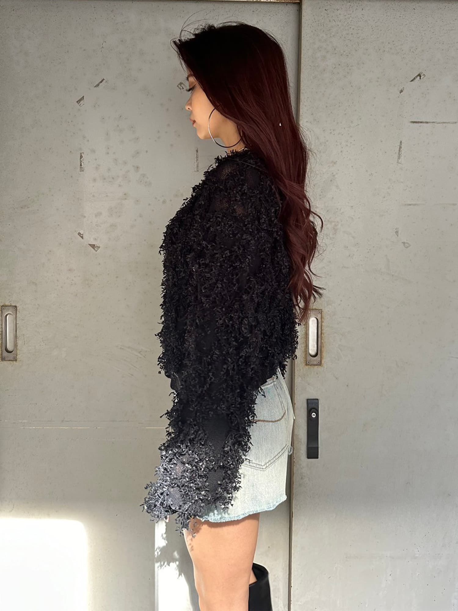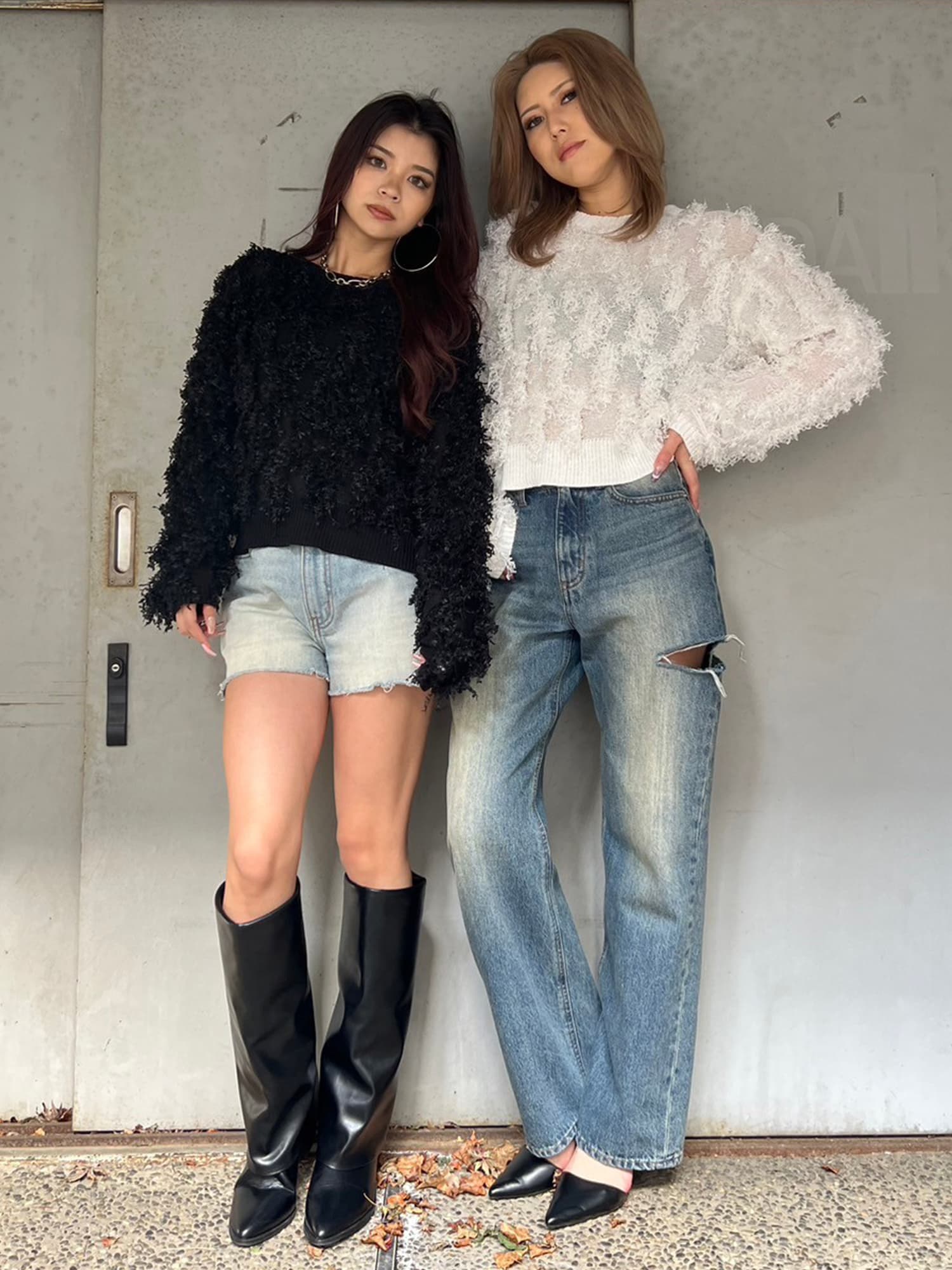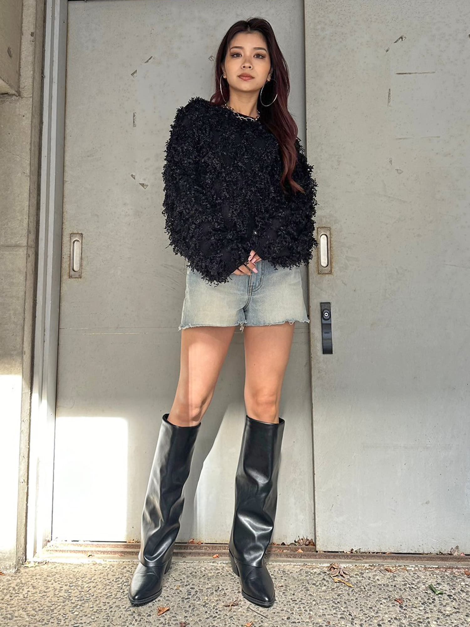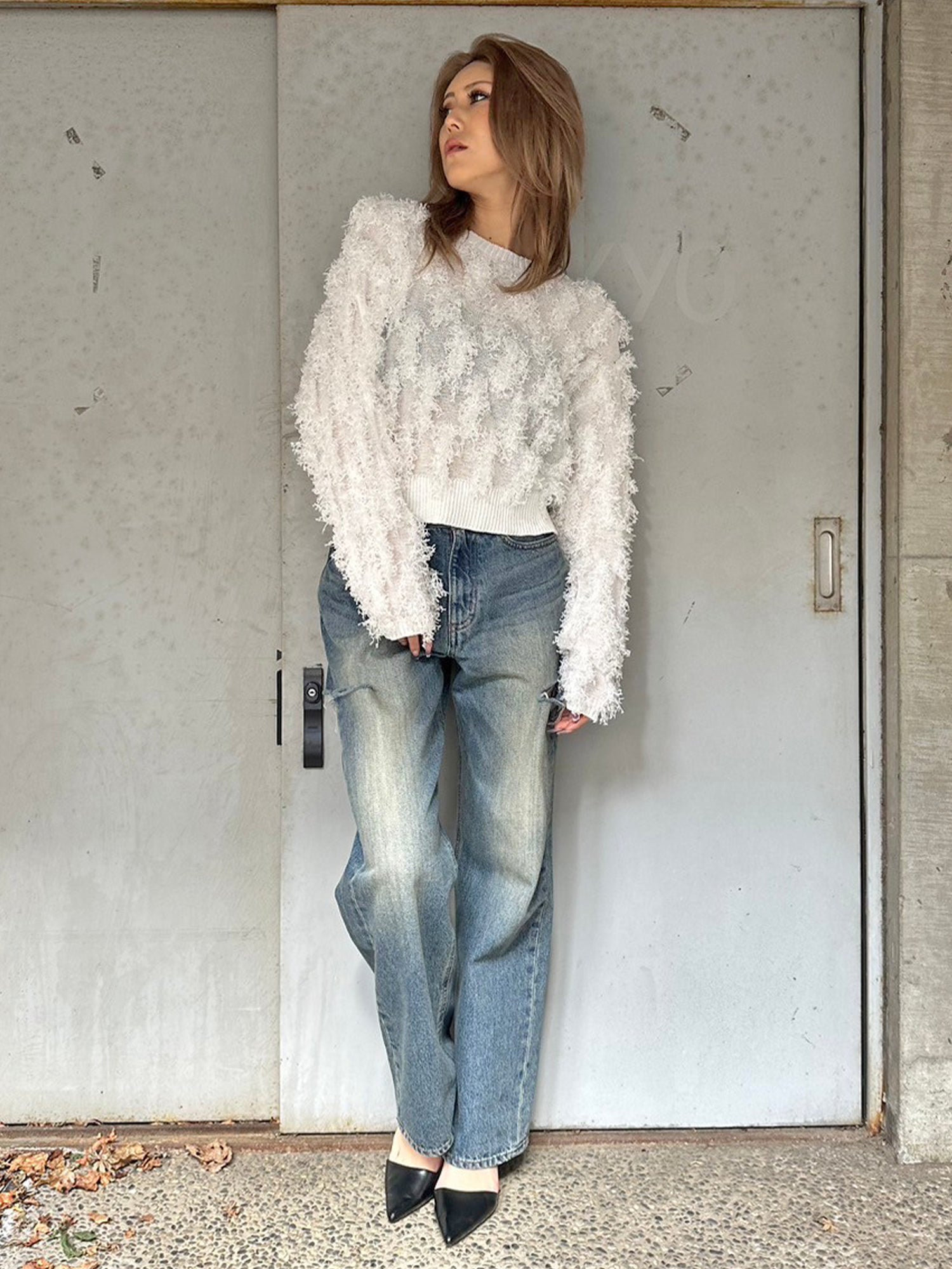 ふわふわとした独特な質感が特徴のフラッグヤーンを使用したニットトップス。