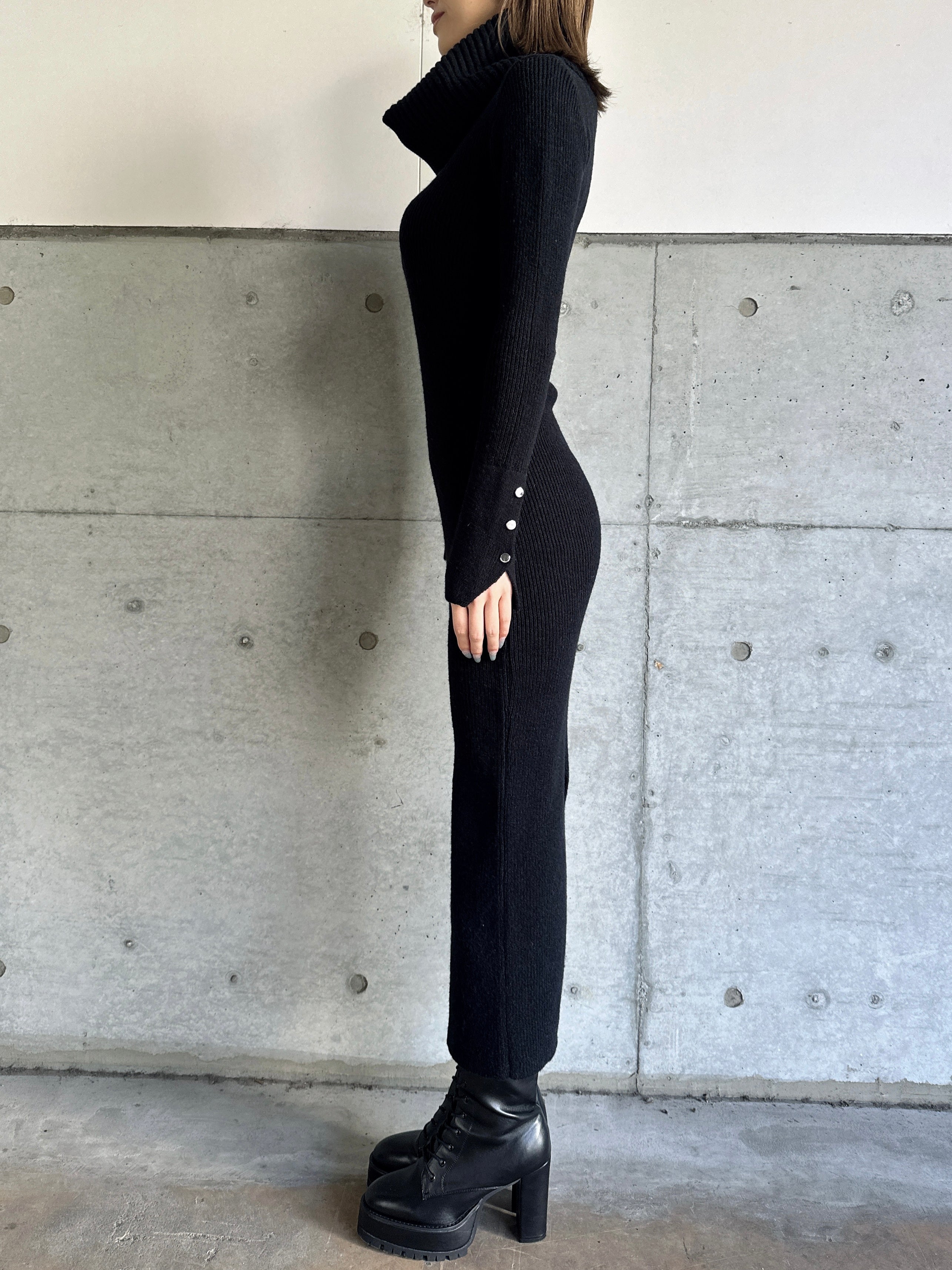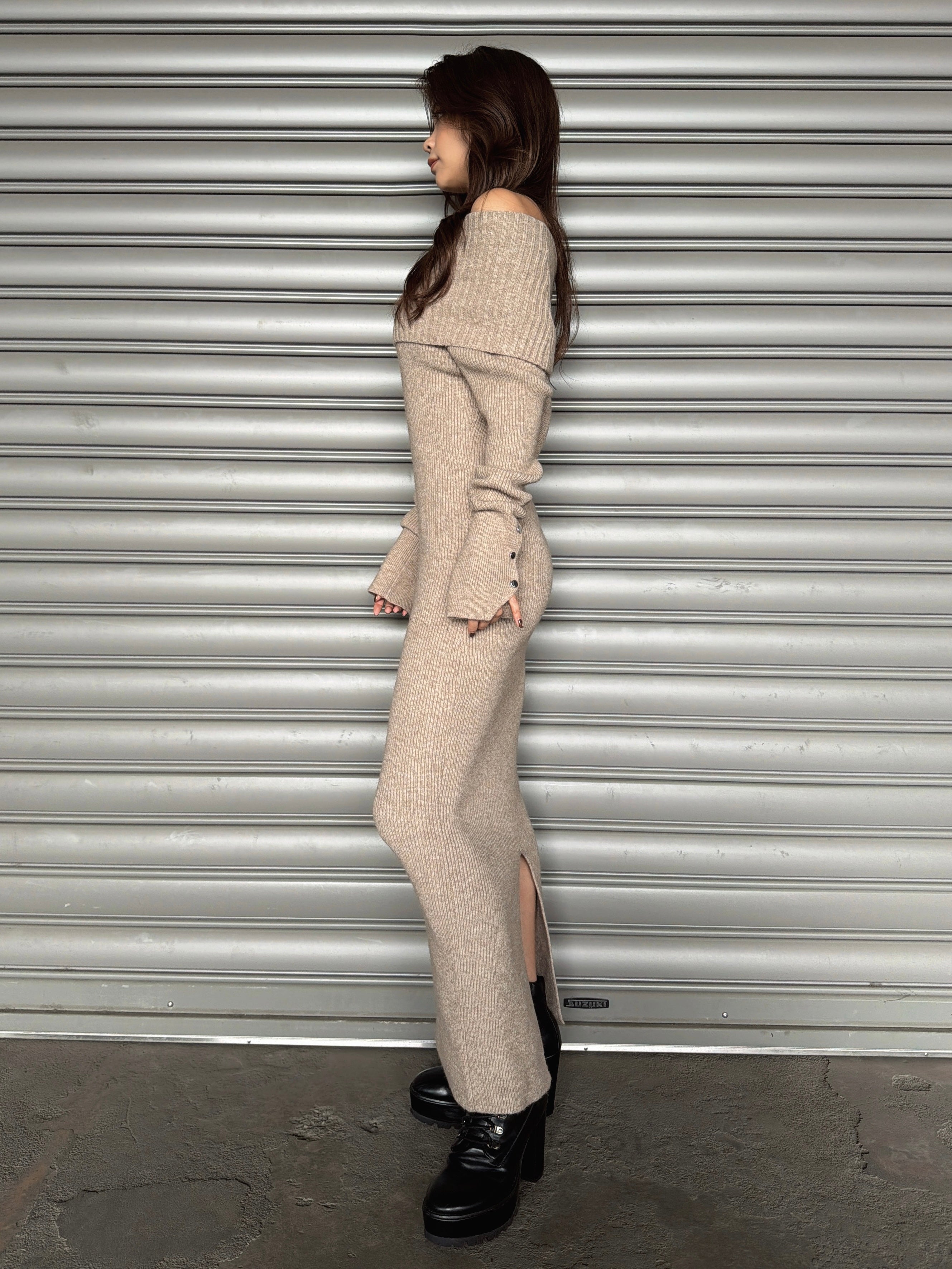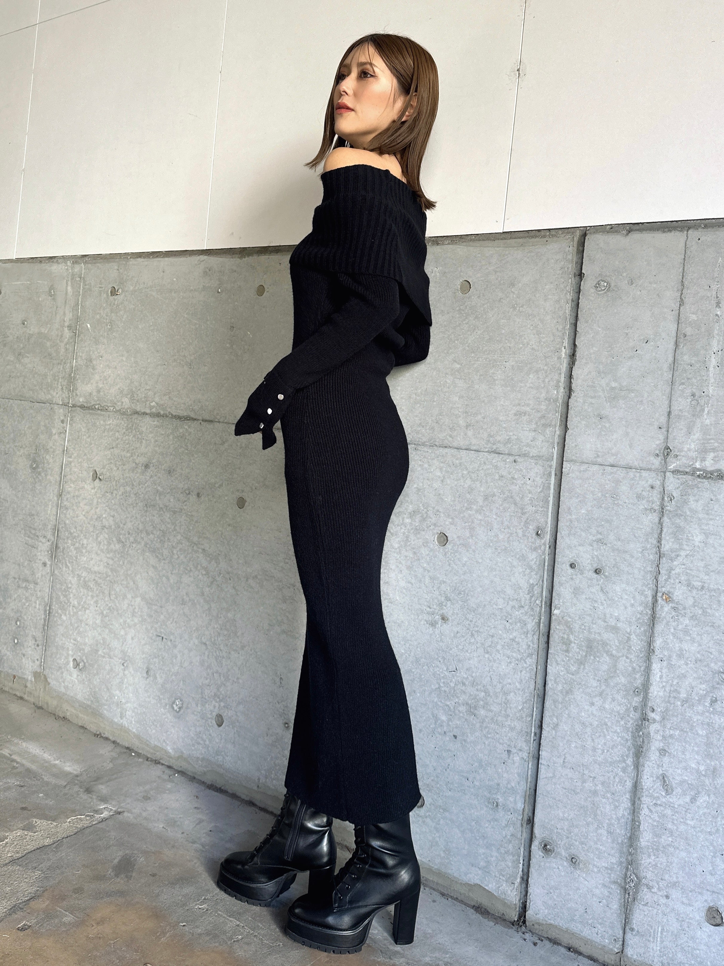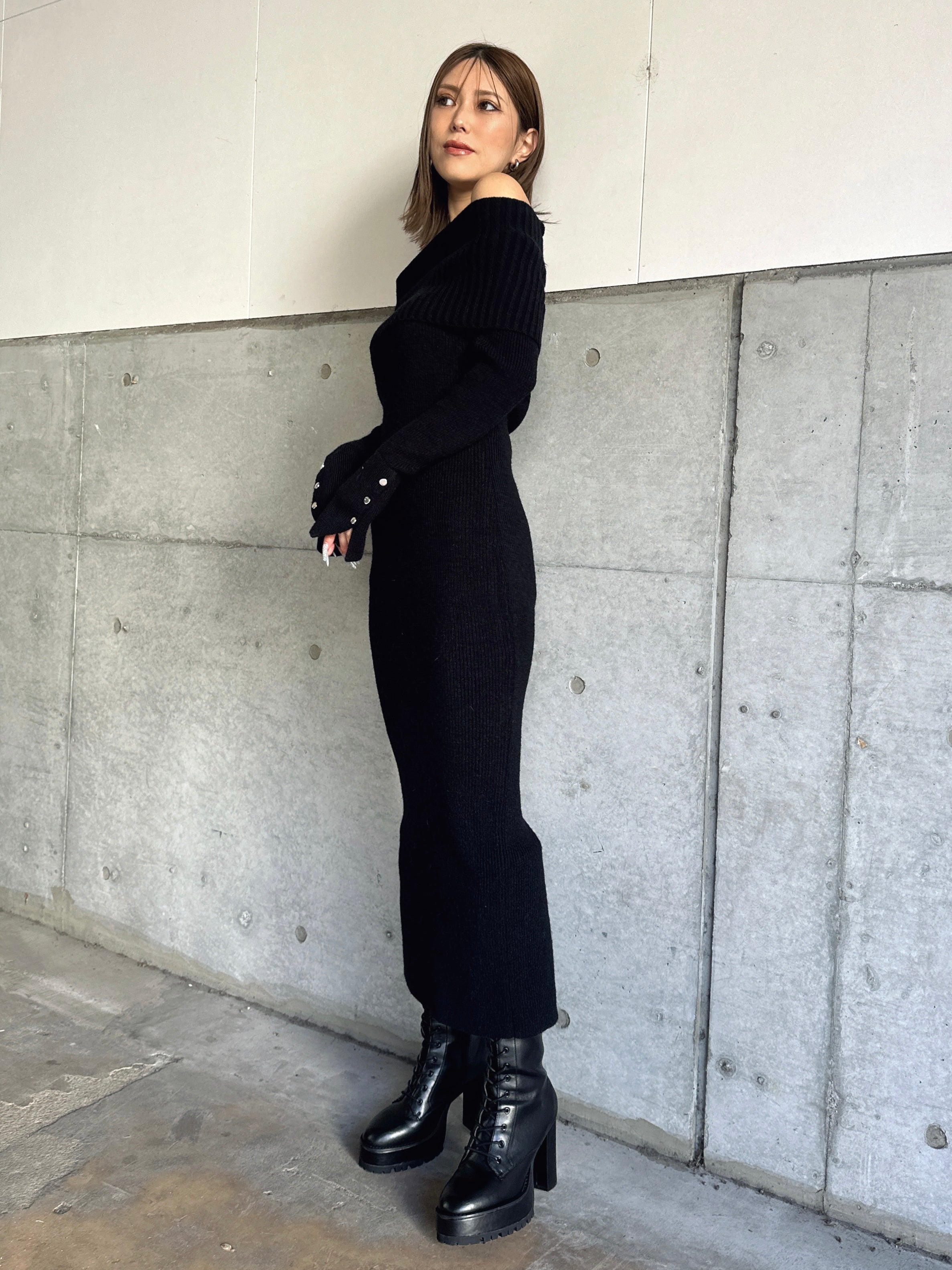 オフショルダーとしてもオフタートルとしても着用できる2WAY仕様のニットワンピース。シーンやアウターに合わせてアレンジ可能なのが嬉しいポイント。スリットを入れた袖口には艶ありSILVERの釦を施し、手首まで美しく見えるようにデザインしました。程よい厚みのある生地感なので暖かみがあります。伸縮性抜群なのでストレスフリーな着心地を叶えつつ、深めのバックスリットを入れることで動きやすさと抜け感をプラス。オフショルダーで着用すればデコルテを綺麗に魅せることができ、アクセサリーを合わせれば顔回りも華やかに。足元はロングブーツでスタイリッシュに。ミュールやヒールで女性らしく仕上げるのもオススメです。