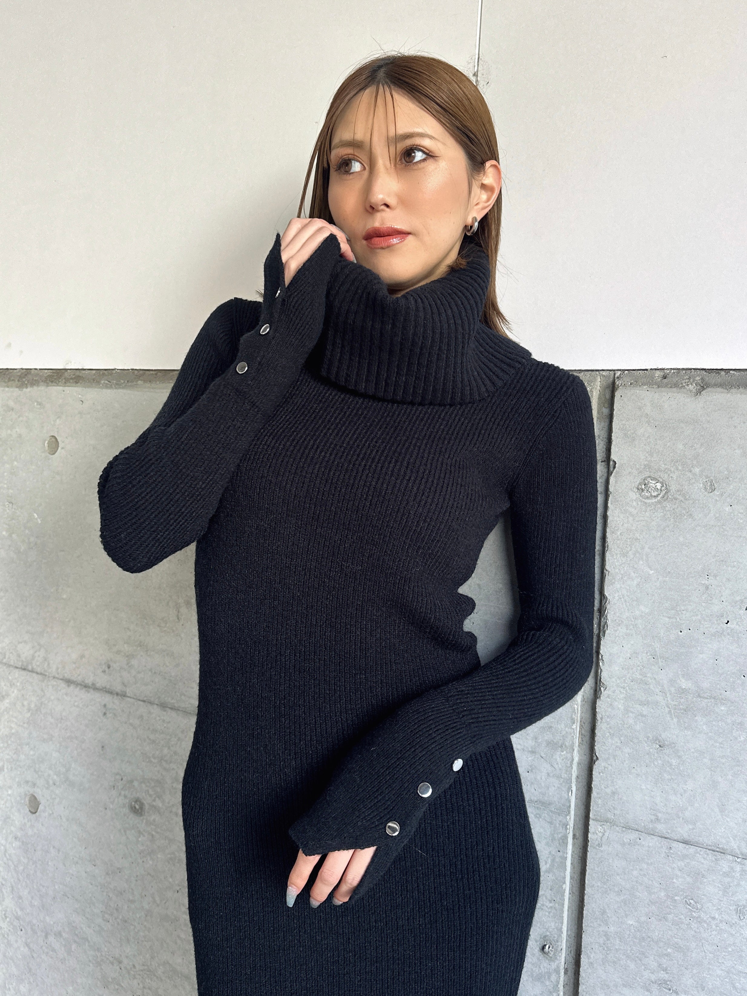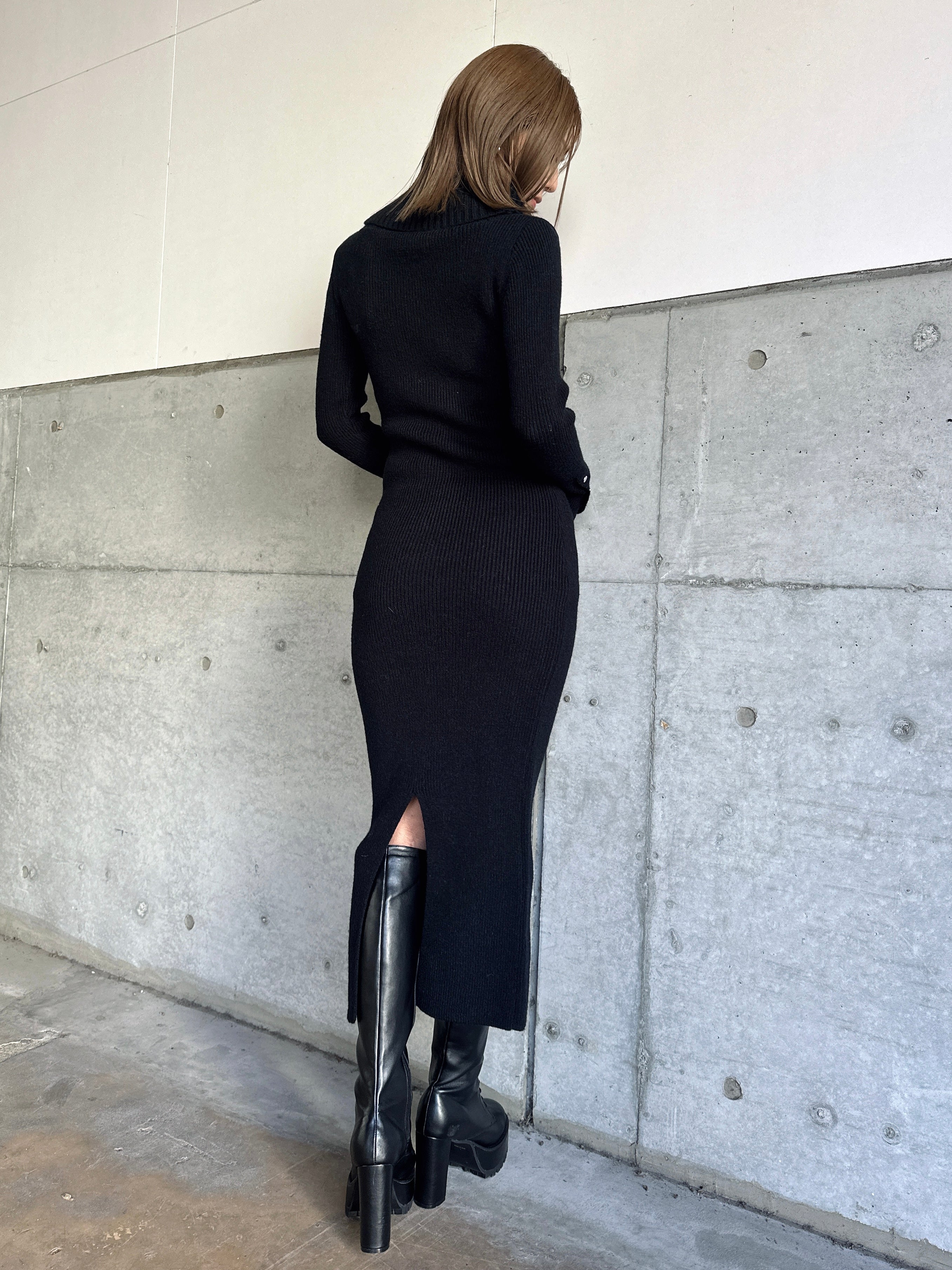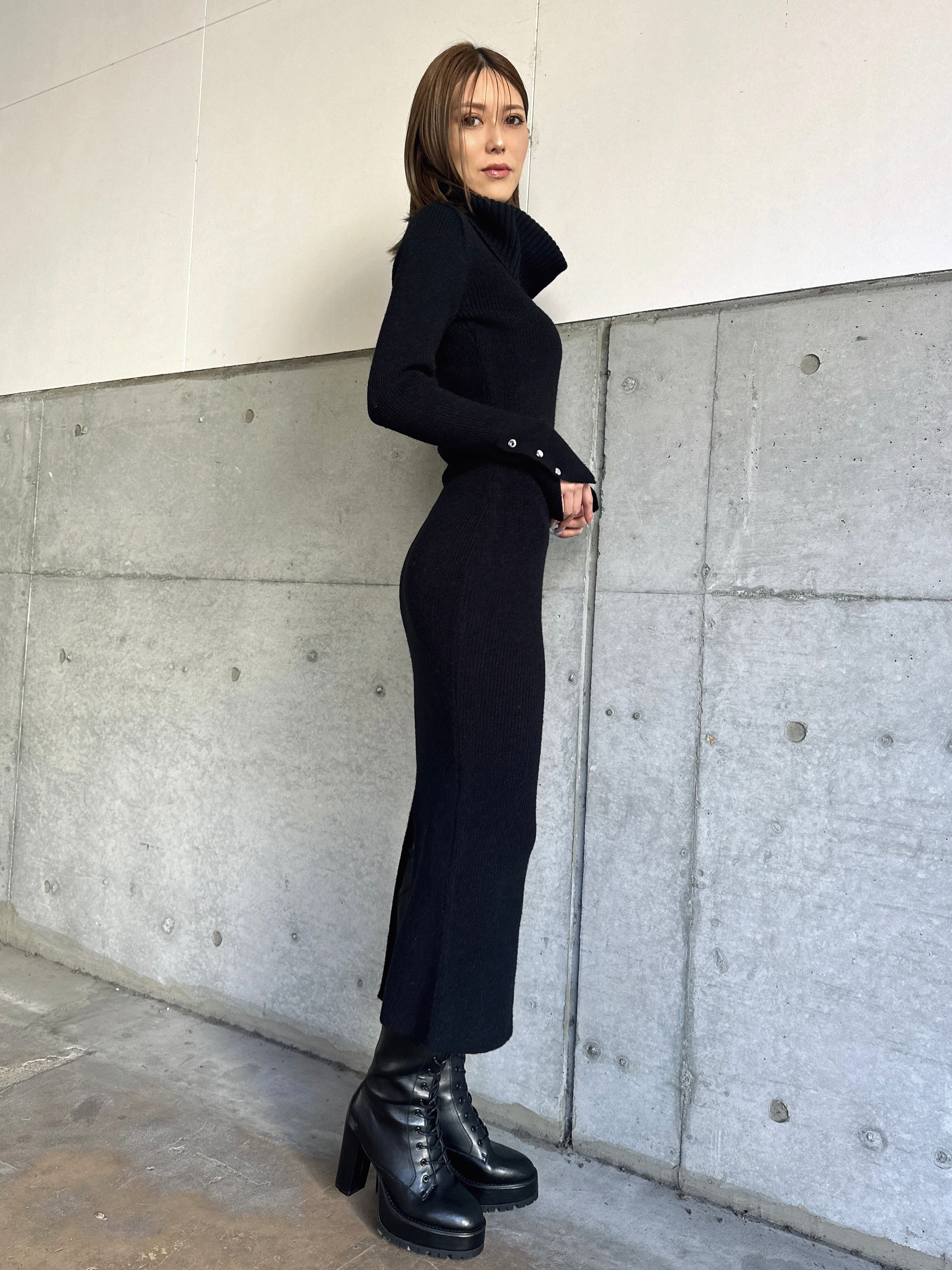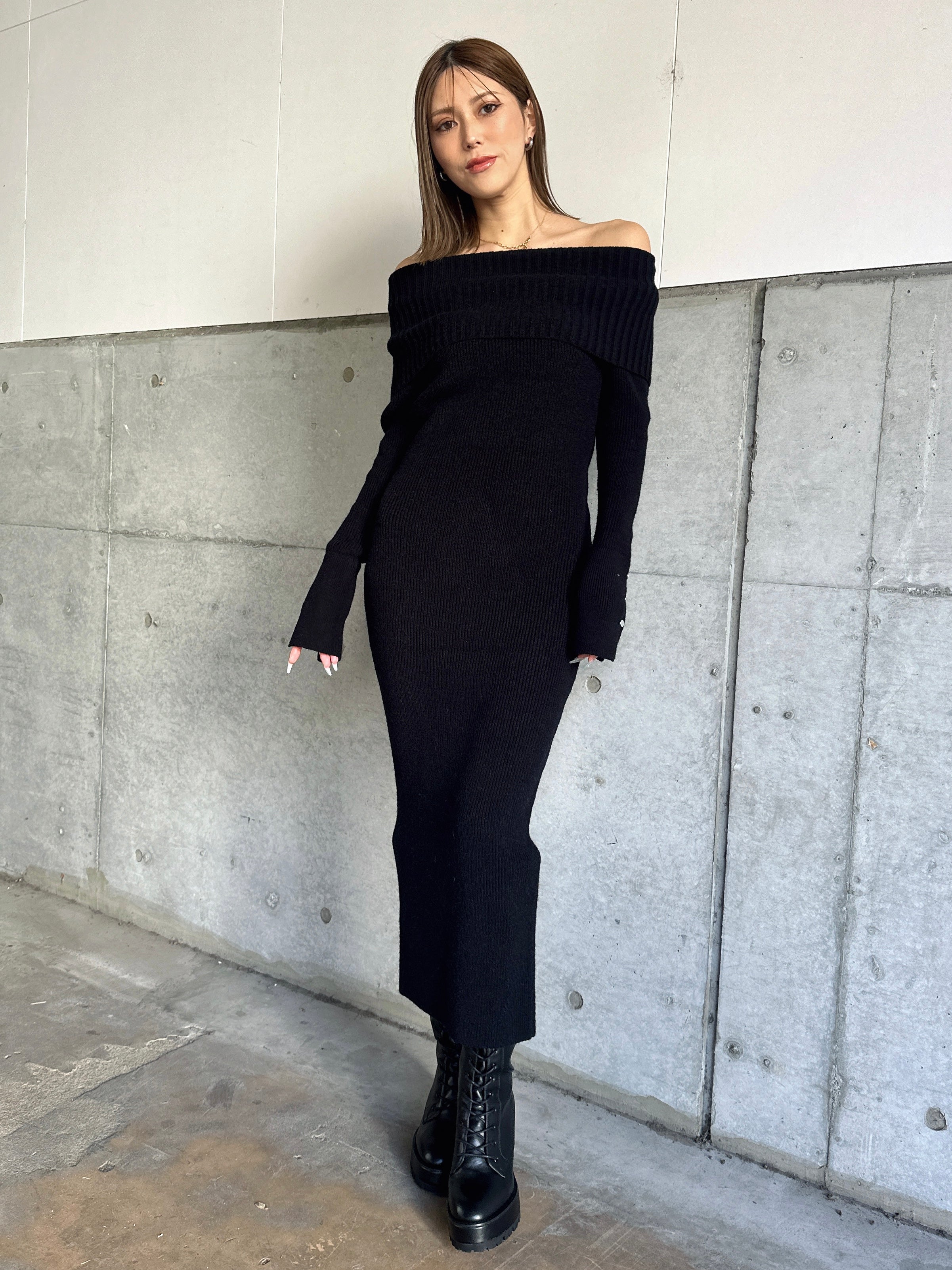 オフショルダーとしてもオフタートルとしても着用できる2WAY仕様のニットワンピース。シーンやアウターに合わせてアレンジ可能なのが嬉しいポイント。スリットを入れた袖口には艶ありSILVERの釦を施し、手首まで美しく見えるようにデザインしました。程よい厚みのある生地感なので暖かみがあります。伸縮性抜群なのでストレスフリーな着心地を叶えつつ、深めのバックスリットを入れることで動きやすさと抜け感をプラス。オフショルダーで着用すればデコルテを綺麗に魅せることができ、アクセサリーを合わせれば顔回りも華やかに。足元はロングブーツでスタイリッシュに。ミュールやヒールで女性らしく仕上げるのもオススメです。
