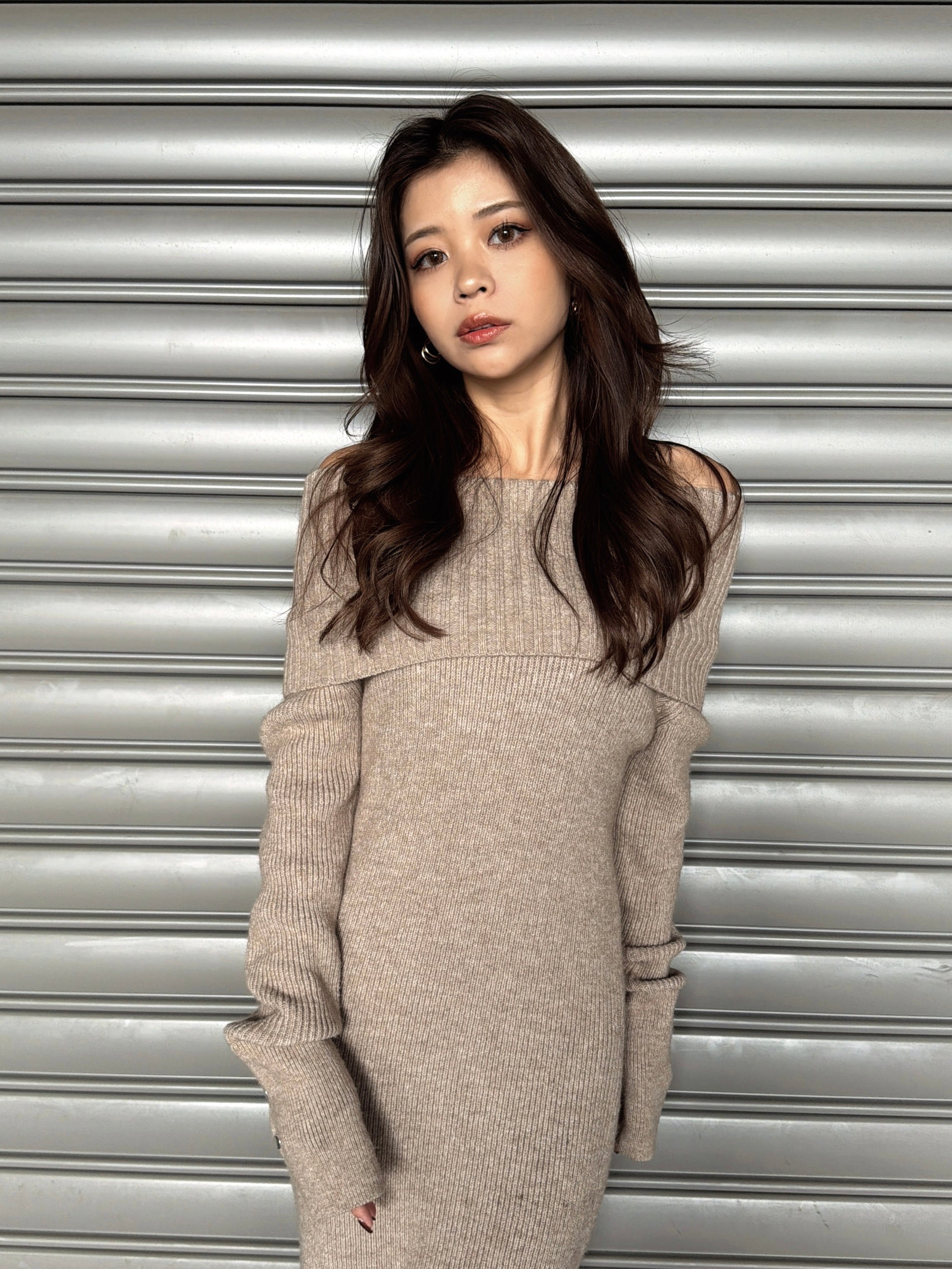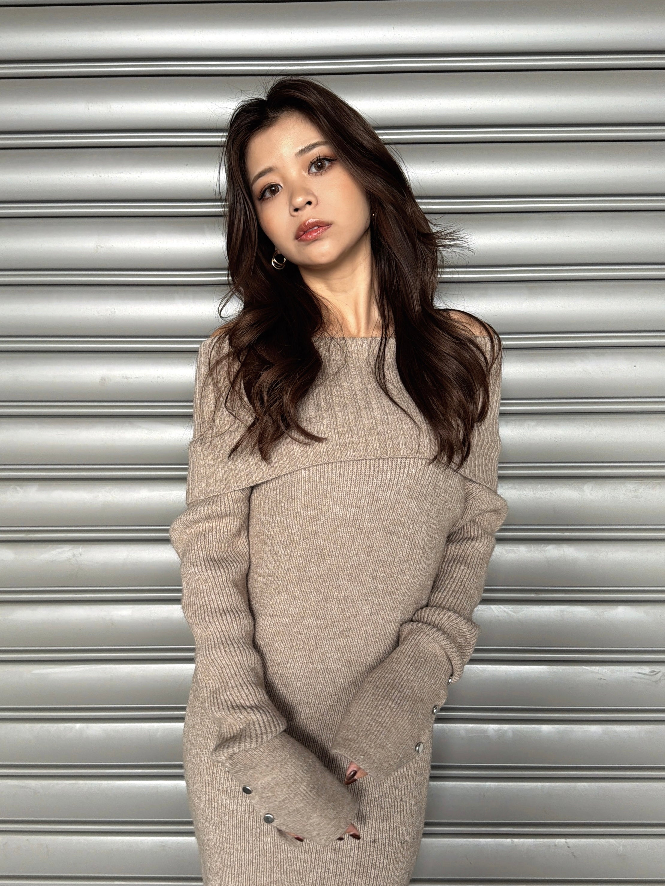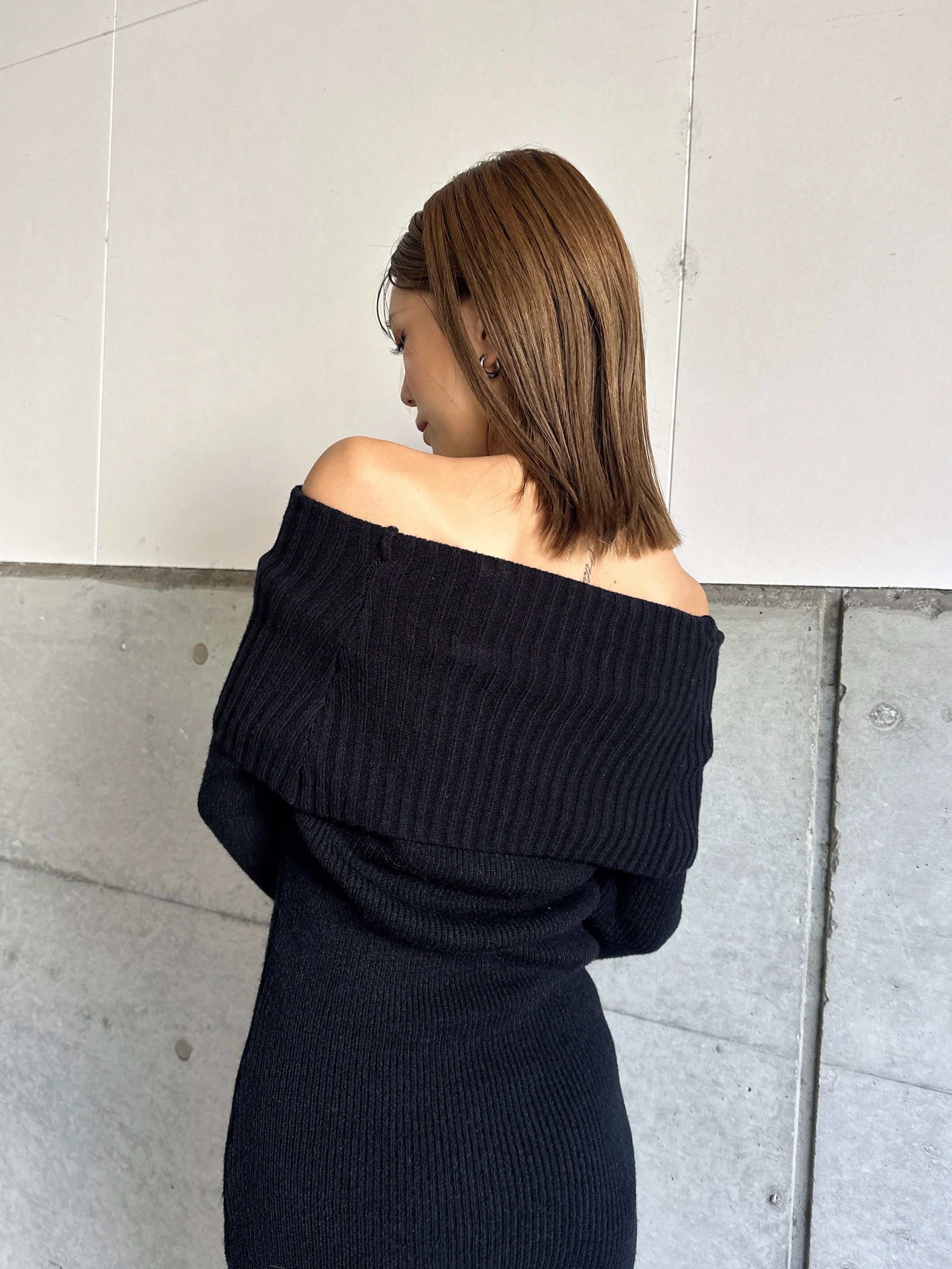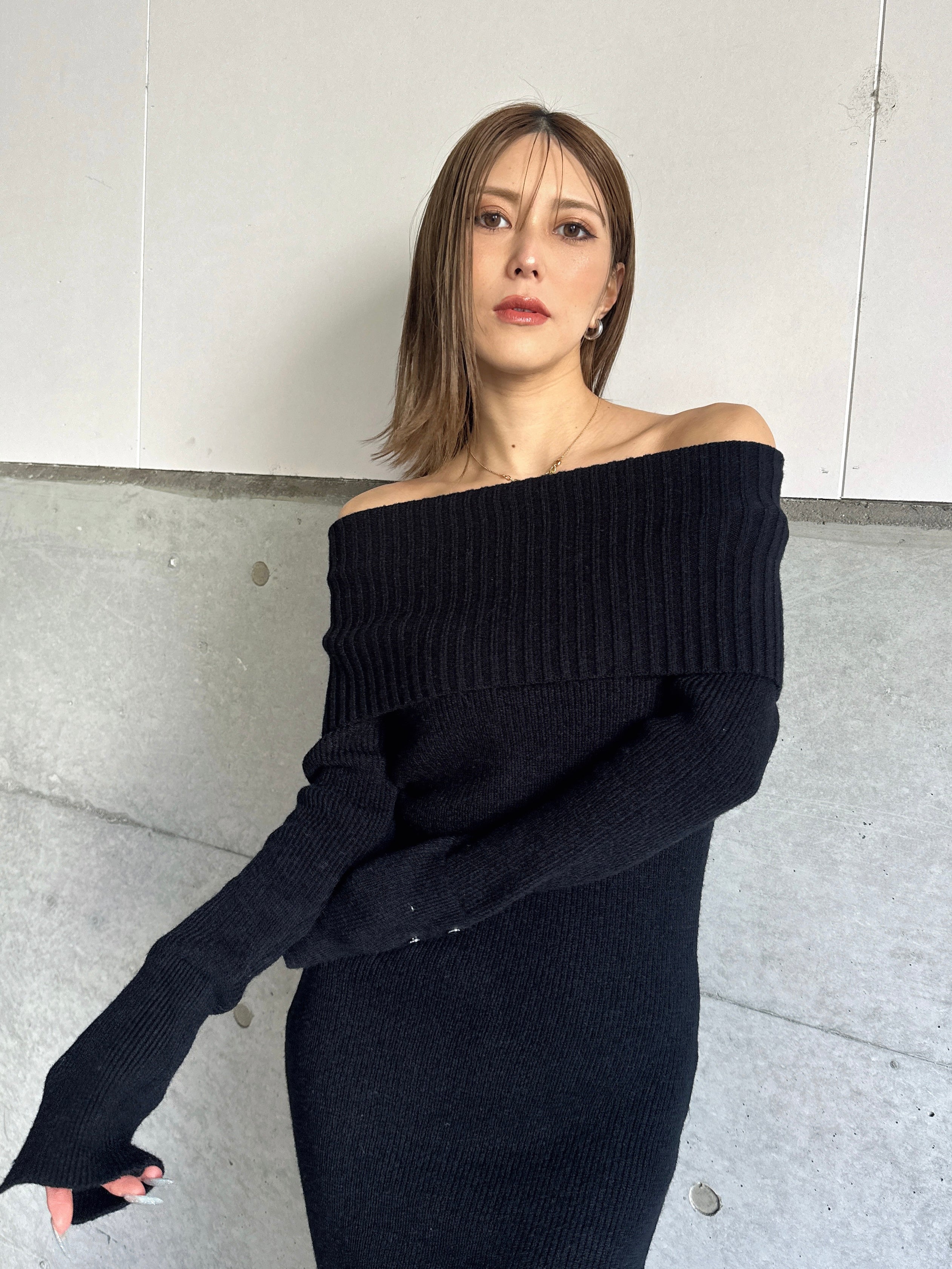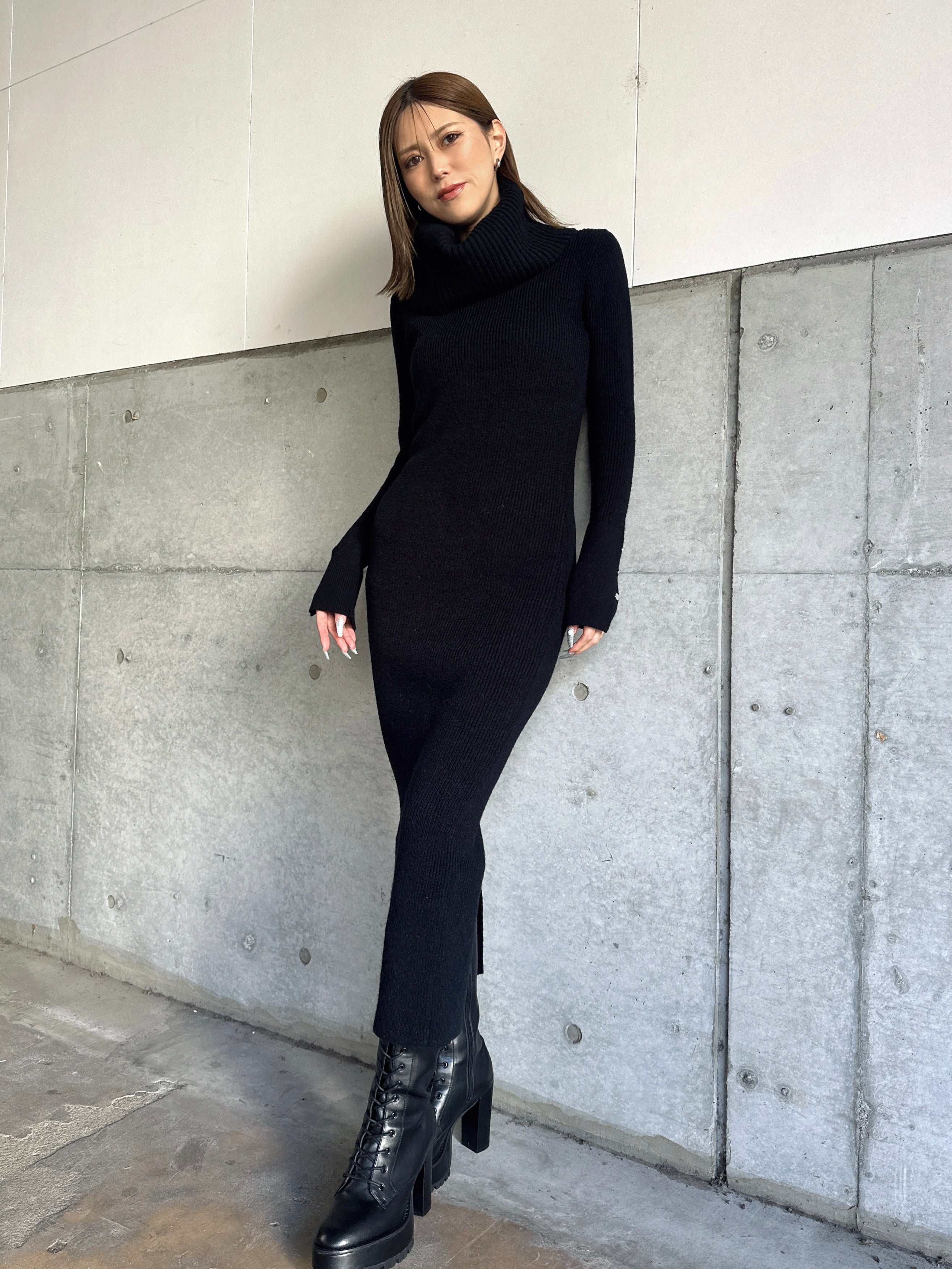 オフショルダーとしてもオフタートルとしても着用できる2WAY仕様のニットワンピース。シーンやアウターに合わせてアレンジ可能なのが嬉しいポイント。スリットを入れた袖口には艶ありSILVERの釦を施し、手首まで美しく見えるようにデザインしました。程よい厚みのある生地感なので暖かみがあります。伸縮性抜群なのでストレスフリーな着心地を叶えつつ、深めのバックスリットを入れることで動きやすさと抜け感をプラス。オフショルダーで着用すればデコルテを綺麗に魅せることができ、アクセサリーを合わせれば顔回りも華やかに。足元はロングブーツでスタイリッシュに。ミュールやヒールで女性らしく仕上げるのもオススメです。