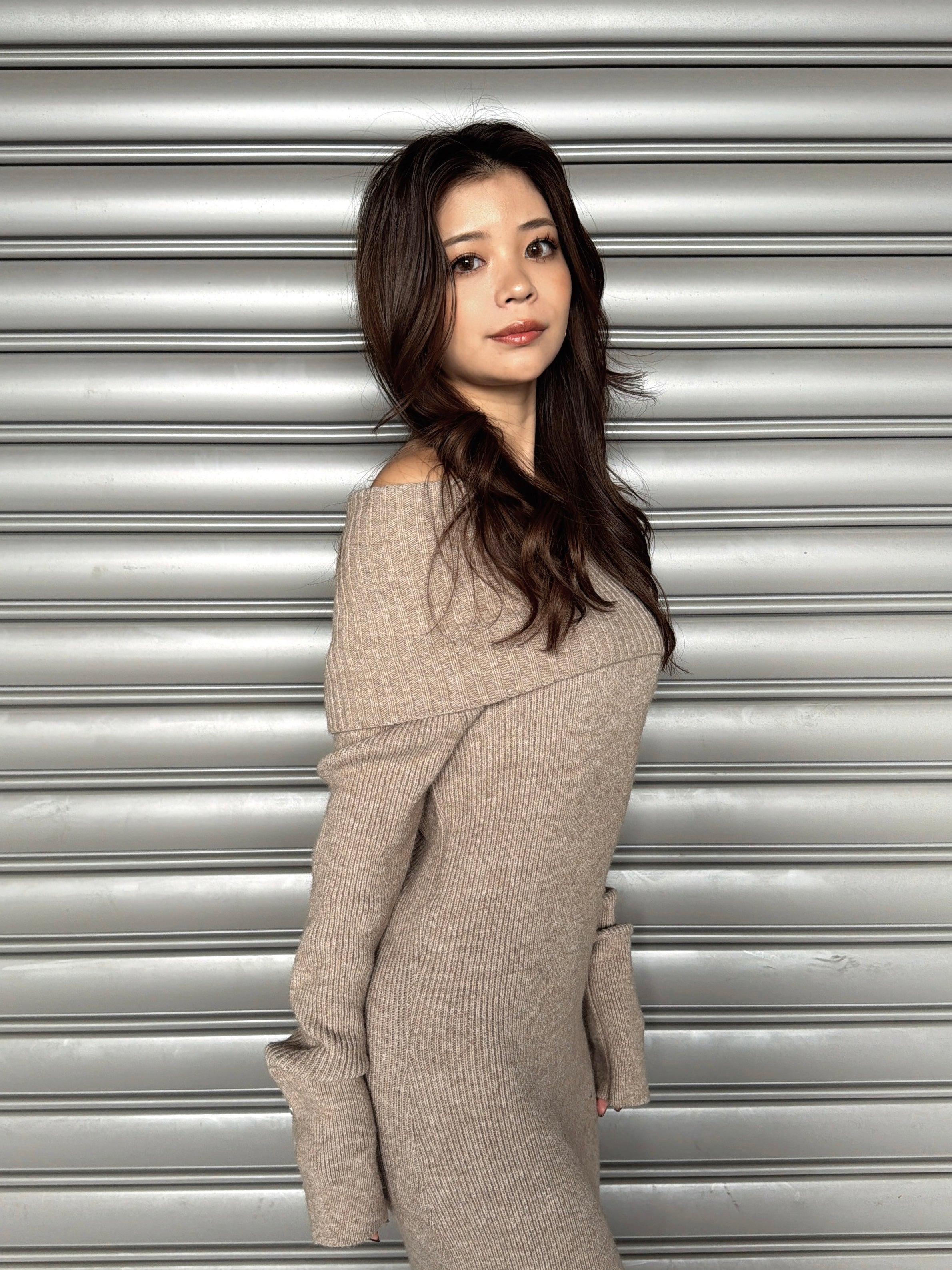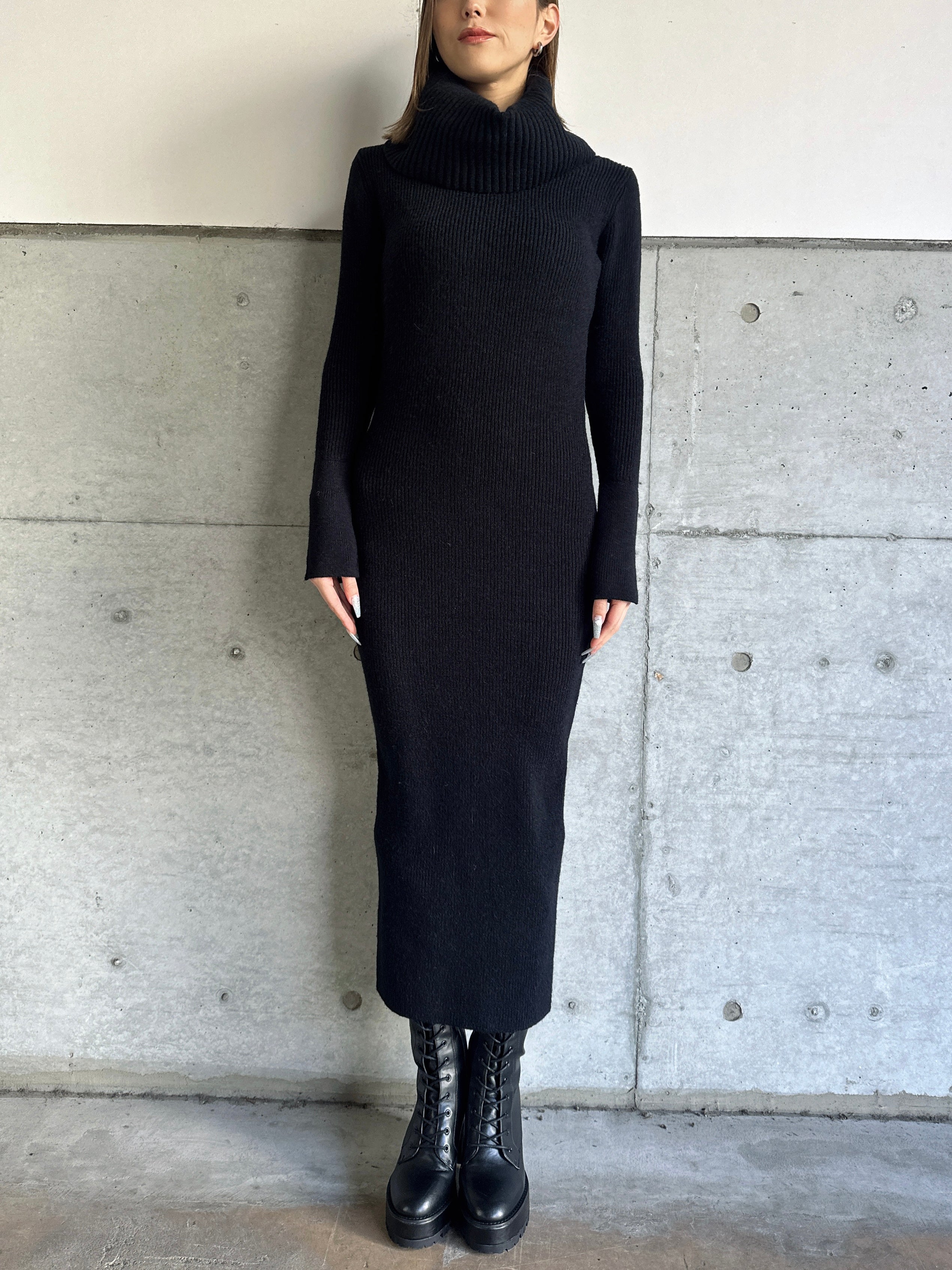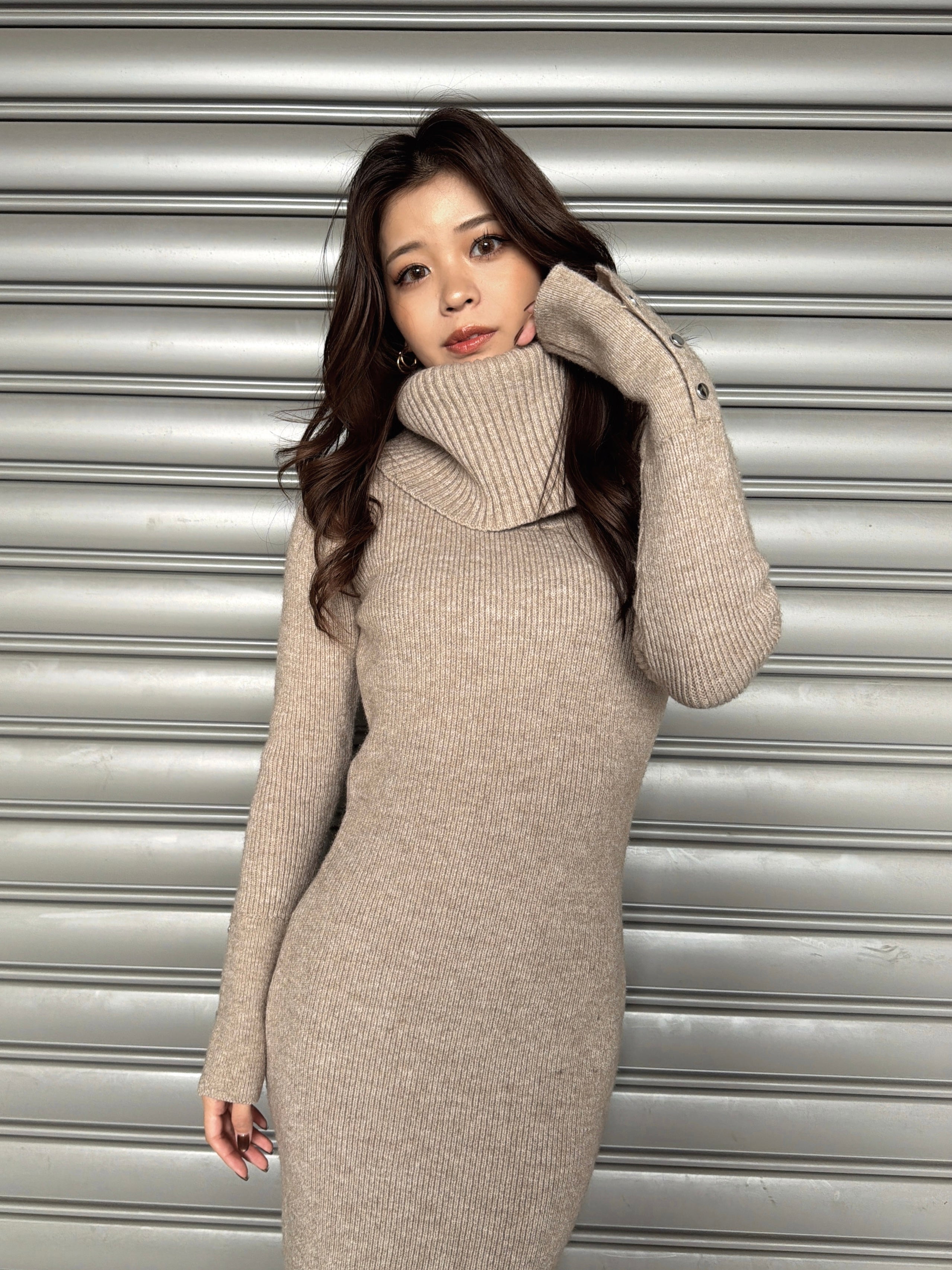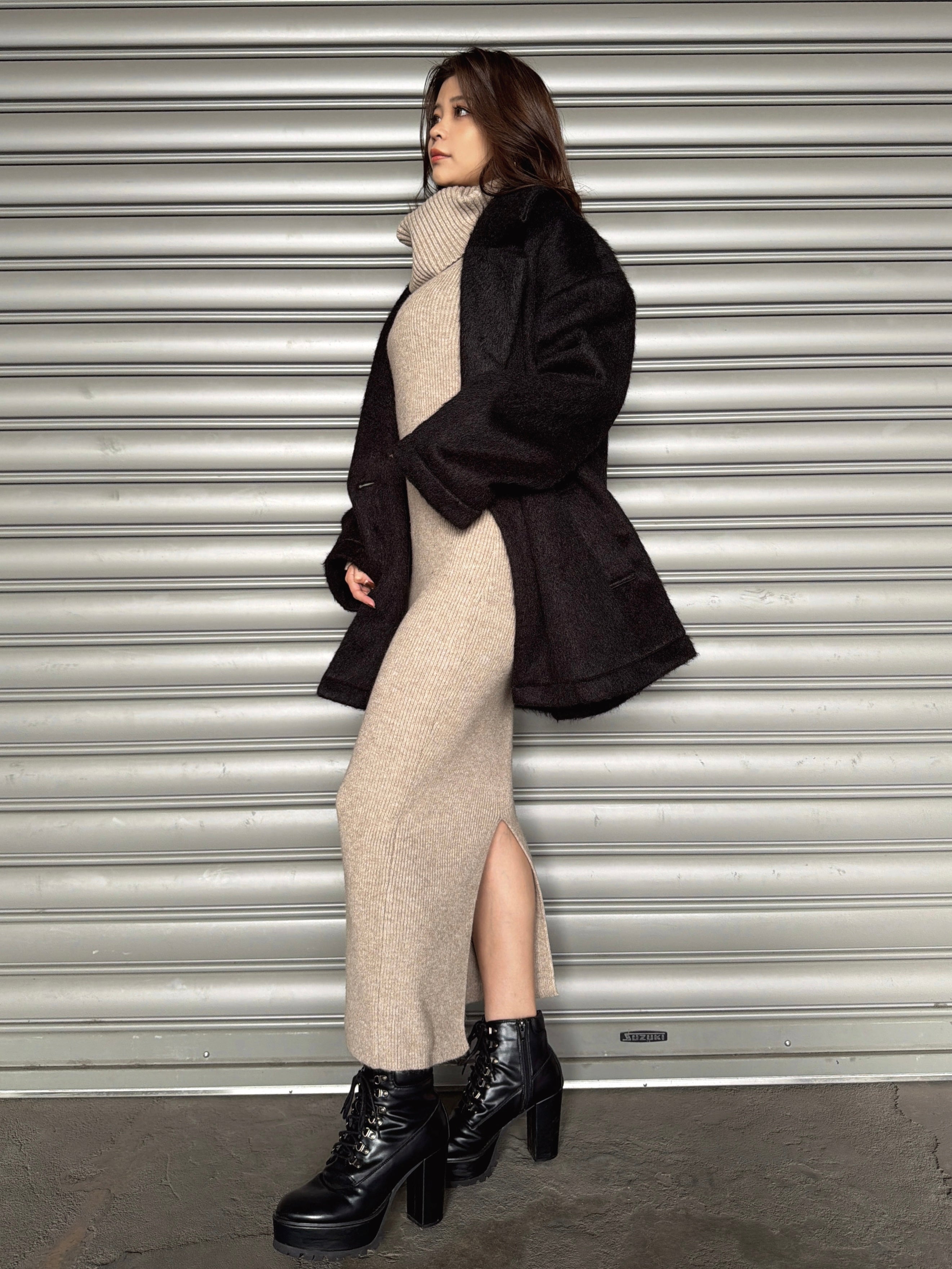 オフショルダーとしてもオフタートルとしても着用できる2WAY仕様のニットワンピース。シーンやアウターに合わせてアレンジ可能なのが嬉しいポイント。スリットを入れた袖口には艶ありSILVERの釦を施し、手首まで美しく見えるようにデザインしました。程よい厚みのある生地感なので暖かみがあります。伸縮性抜群なのでストレスフリーな着心地を叶えつつ、深めのバックスリットを入れることで動きやすさと抜け感をプラス。オフショルダーで着用すればデコルテを綺麗に魅せることができ、アクセサリーを合わせれば顔回りも華やかに。足元はロングブーツでスタイリッシュに。ミュールやヒールで女性らしく仕上げるのもオススメです。