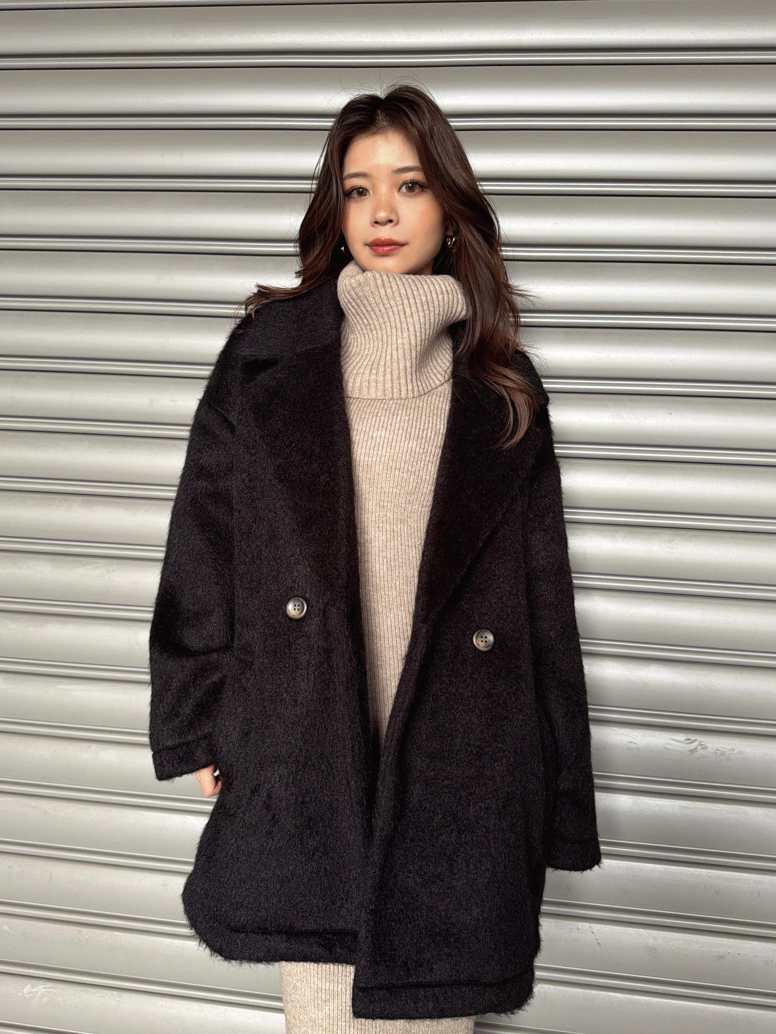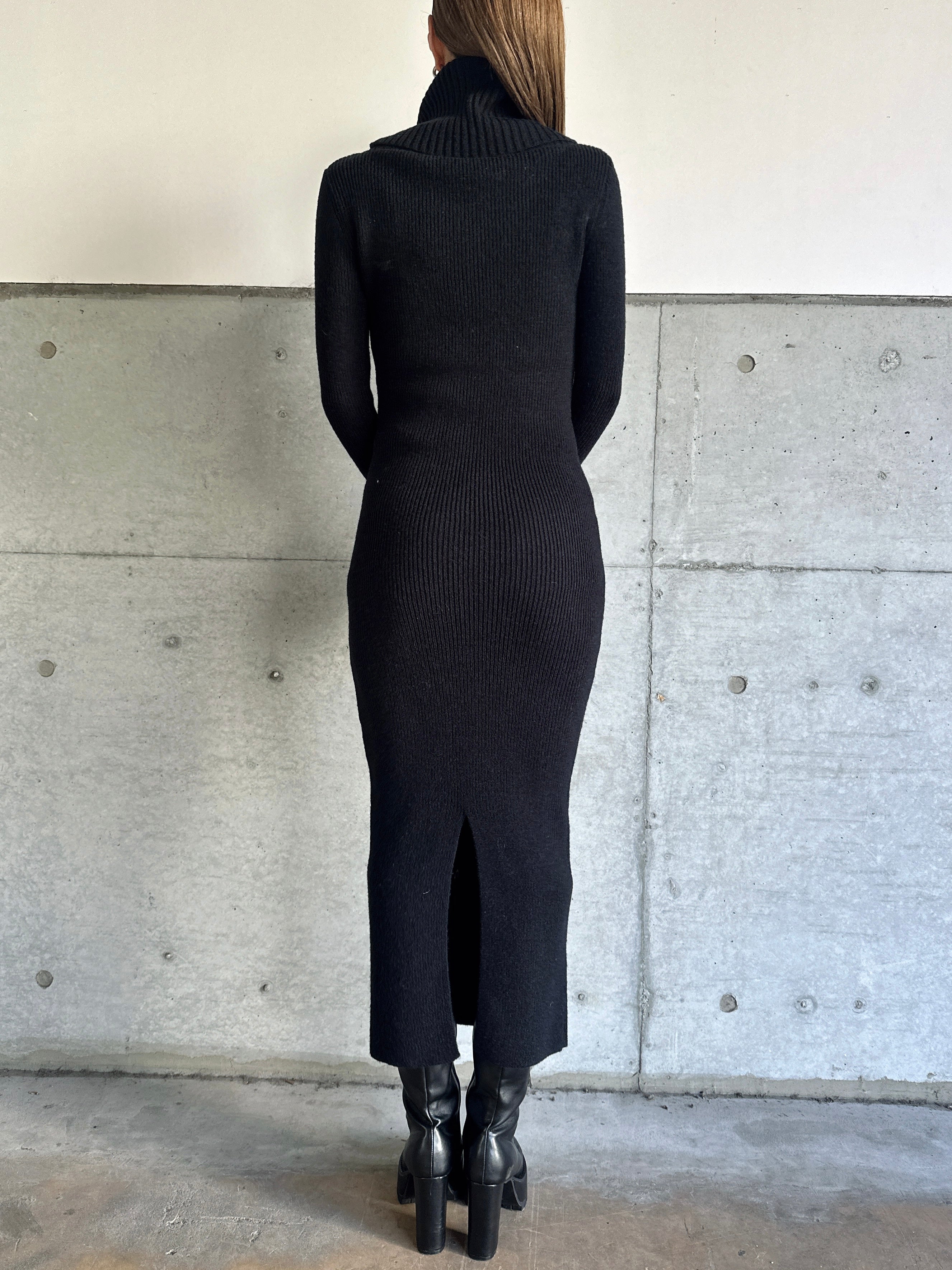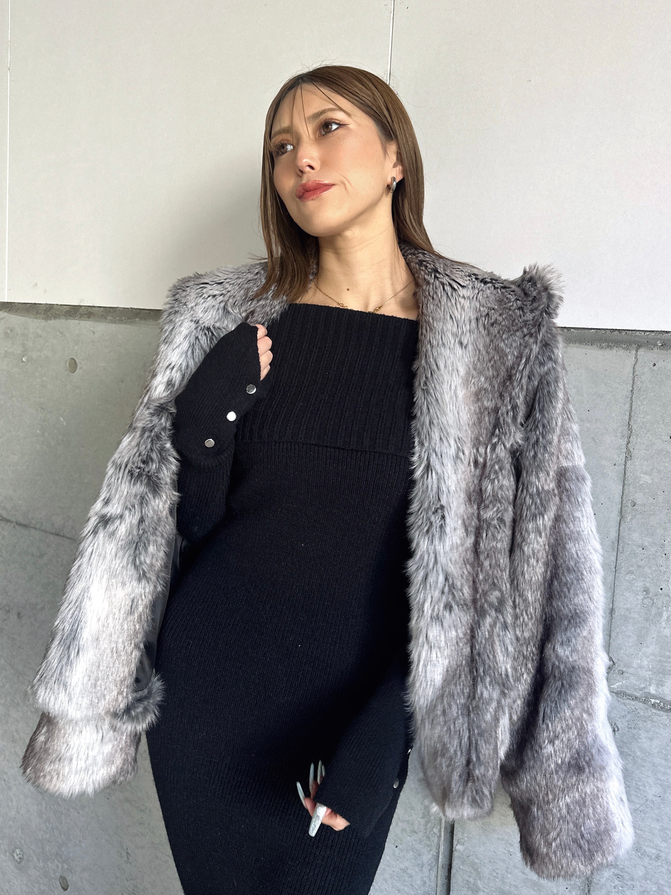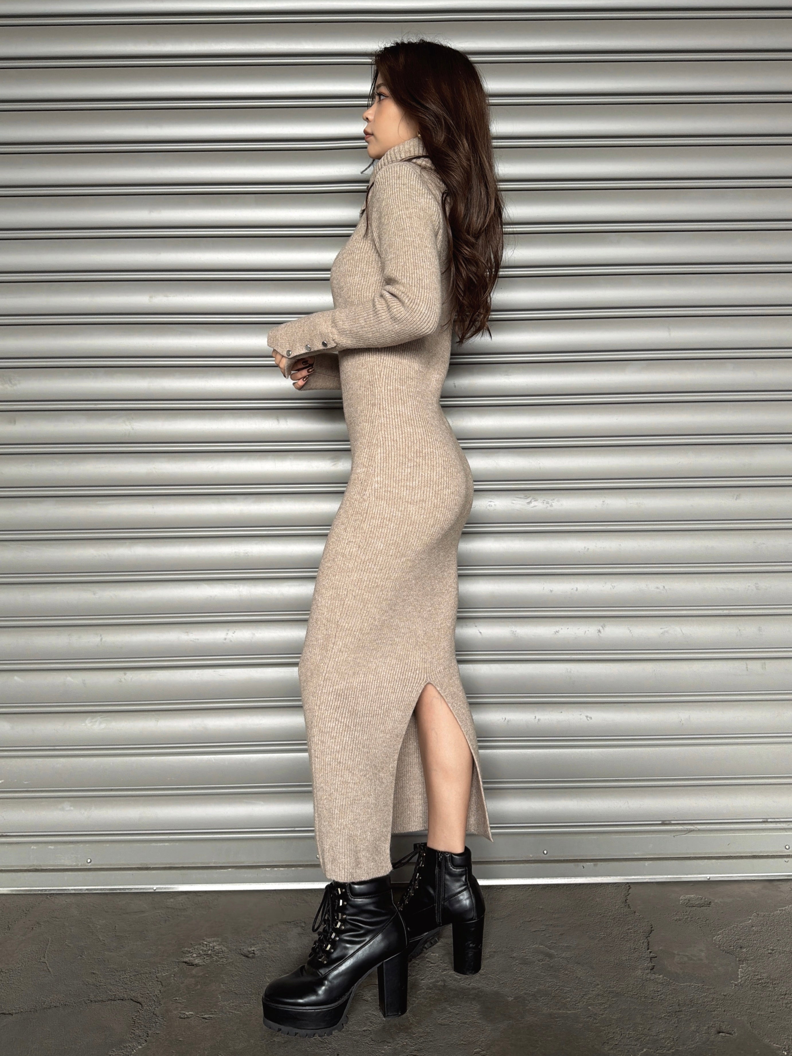 オフショルダーとしてもオフタートルとしても着用できる2WAY仕様のニットワンピース。シーンやアウターに合わせてアレンジ可能なのが嬉しいポイント。スリットを入れた袖口には艶ありSILVERの釦を施し、手首まで美しく見えるようにデザインしました。程よい厚みのある生地感なので暖かみがあります。伸縮性抜群なのでストレスフリーな着心地を叶えつつ、深めのバックスリットを入れることで動きやすさと抜け感をプラス。オフショルダーで着用すればデコルテを綺麗に魅せることができ、アクセサリーを合わせれば顔回りも華やかに。足元はロングブーツでスタイリッシュに。ミュールやヒールで女性らしく仕上げるのもオススメです。