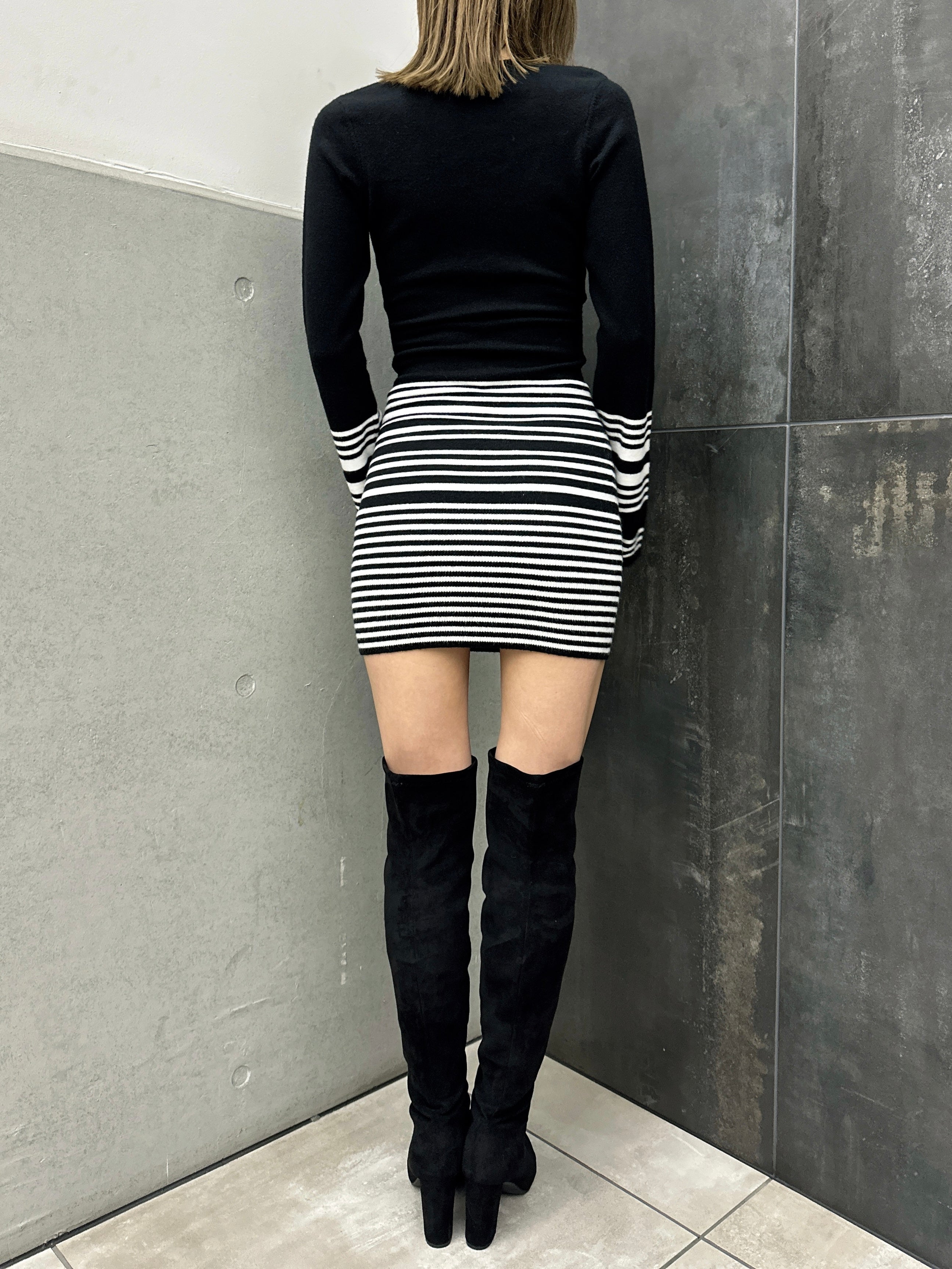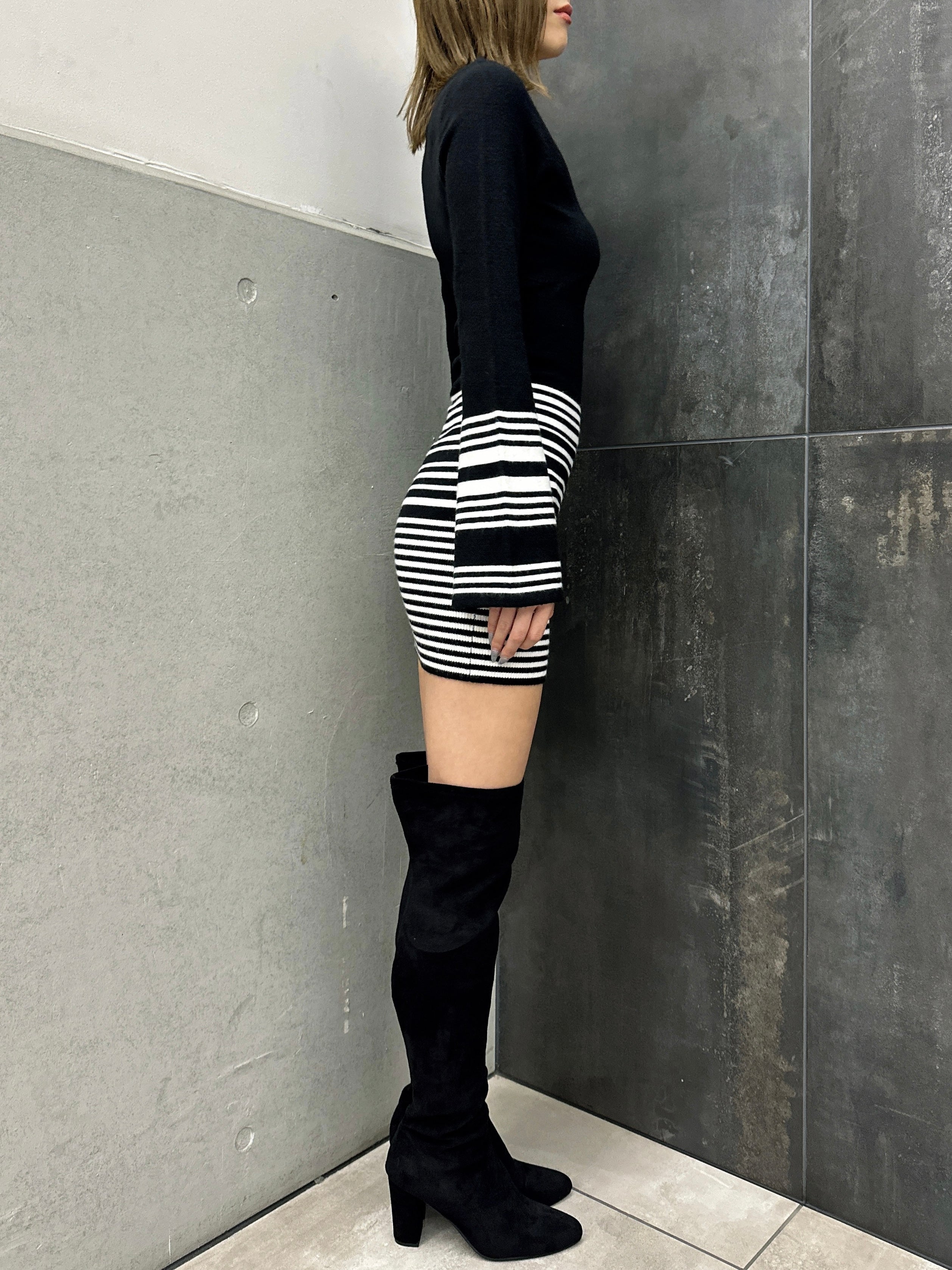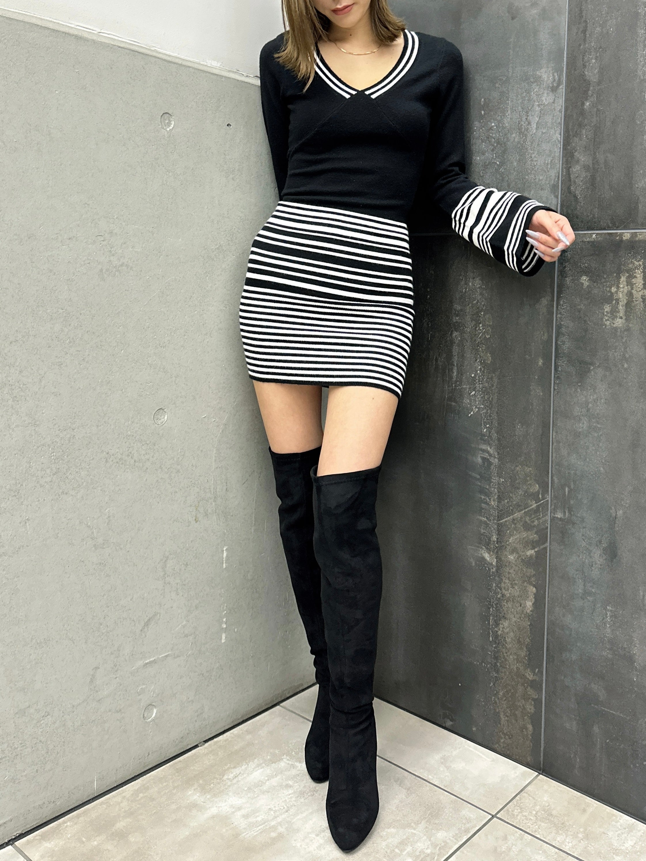 商品説明 EGOIST27周年を記念し、2003年~2008年のSEXY&GLAMAOROUS時代のHIT商品を復刻版として再現しました。思わず引き込まれる深Vネックで視線クギづけのニットミニワンピース。気になるウエスト~ヒップラインは細めボーダーでカモフラージュ。セクシーさを引き立てるピタっとタイトな身頃に対し、袖は袖口フレアにしてメリハリを付けました。ボディラインを引き締めてくれるよう、キックバックが強めな糸を選んでいるのでスタイルアップ効果も抜群。ショートブーツやニーハイブーツで脚の露出度をお好みで調整すれば雰囲気もガラッと変わります。コートを脱いだ時の上品な色気が群を抜くタイトミニワンピースは男女問わず魅了すること間違いなし。モノトーンベースなのでカラーもののBAGを合わせてアクセントを効かせるのも◎