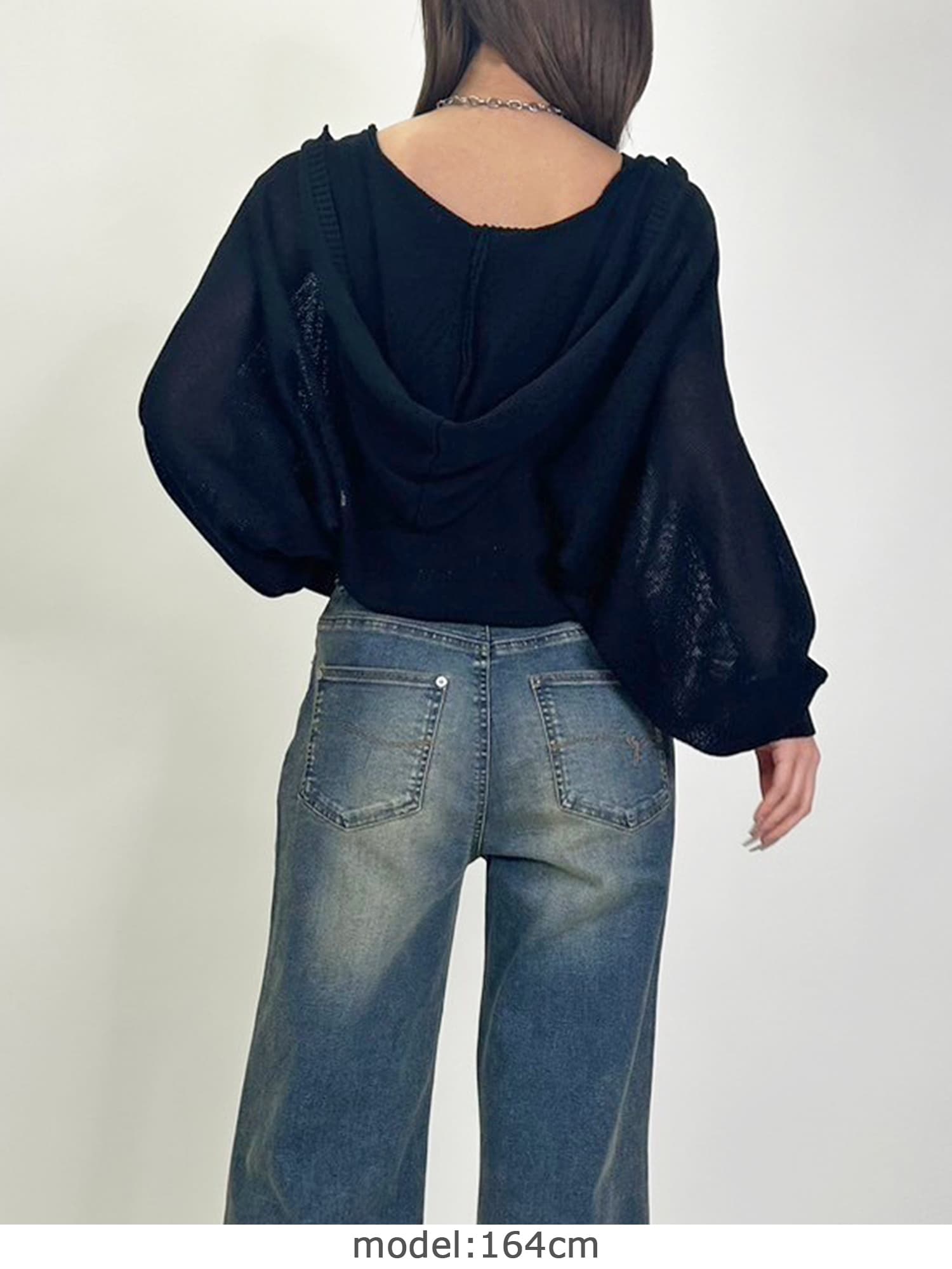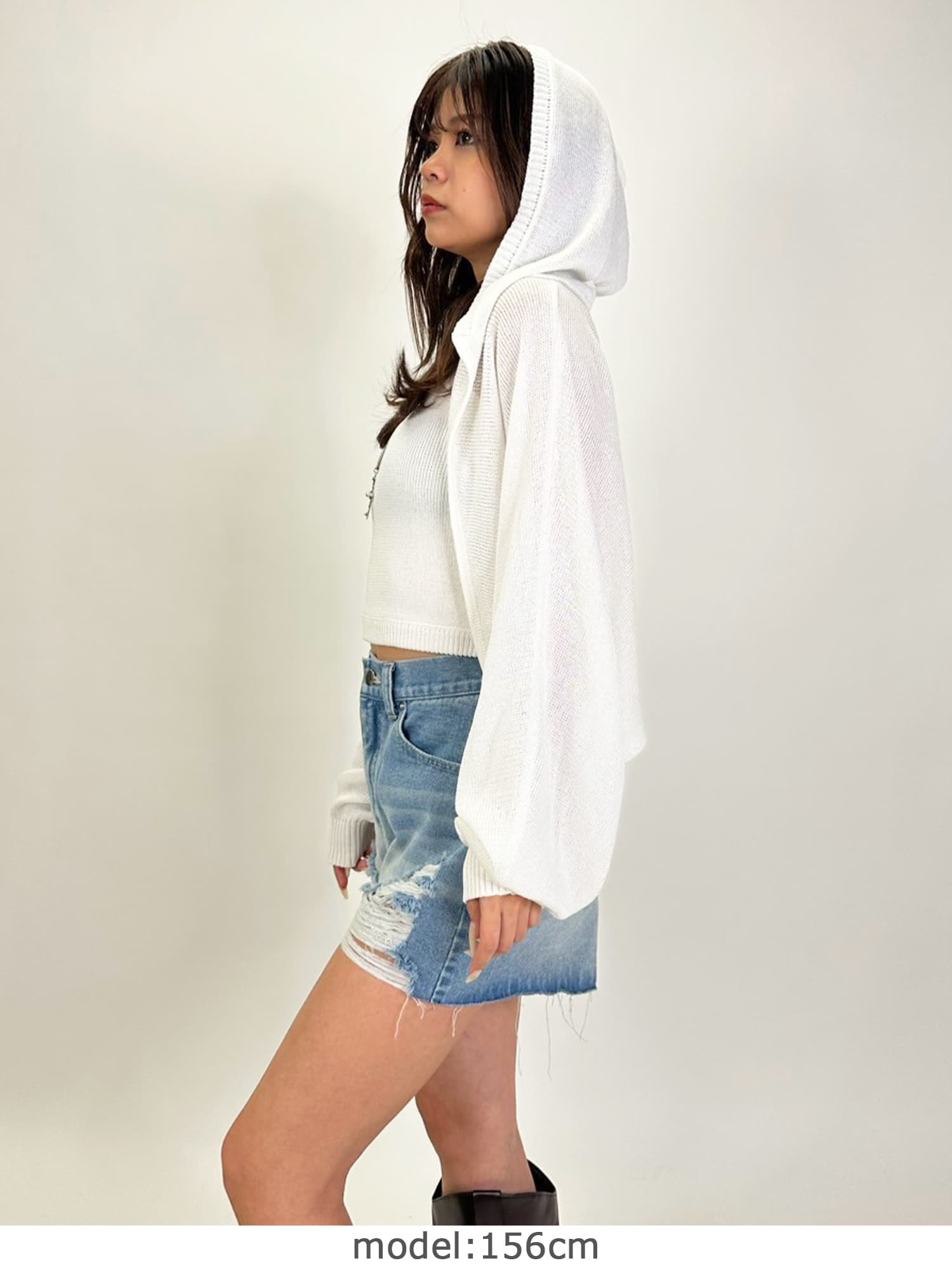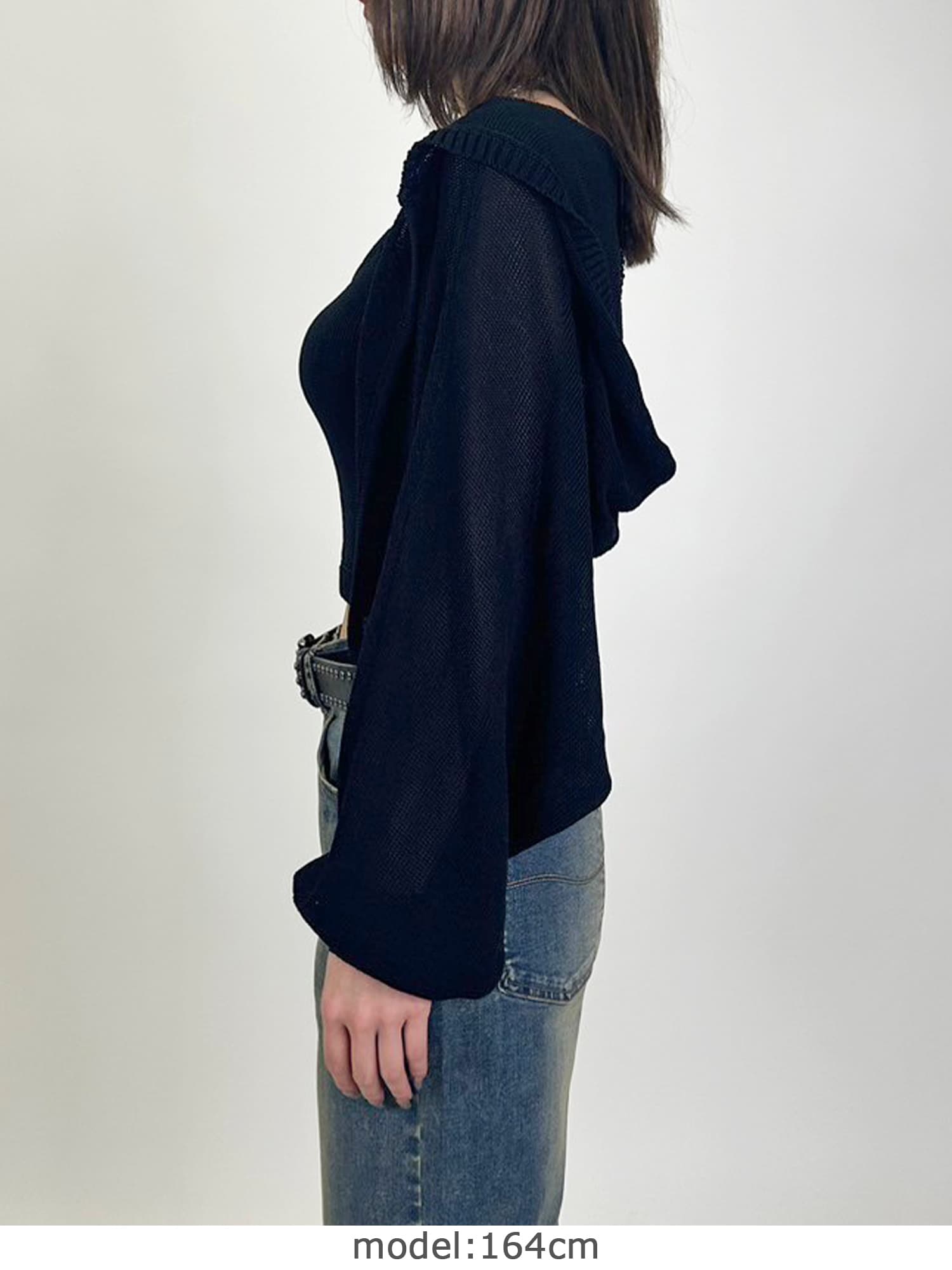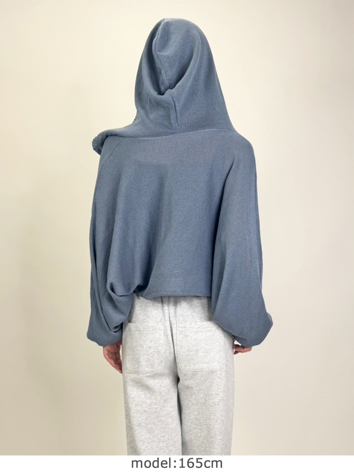 シャリ感のある薄手で通気性の良い糸を使用しています。フード付なのでカジュアルなイメージですが、ボリュームのある袖で女性らしさもプラス。ジャスト丈なので、ミニボトムからフルレングスまで様々なシルエットのボトムと相性抜群です。