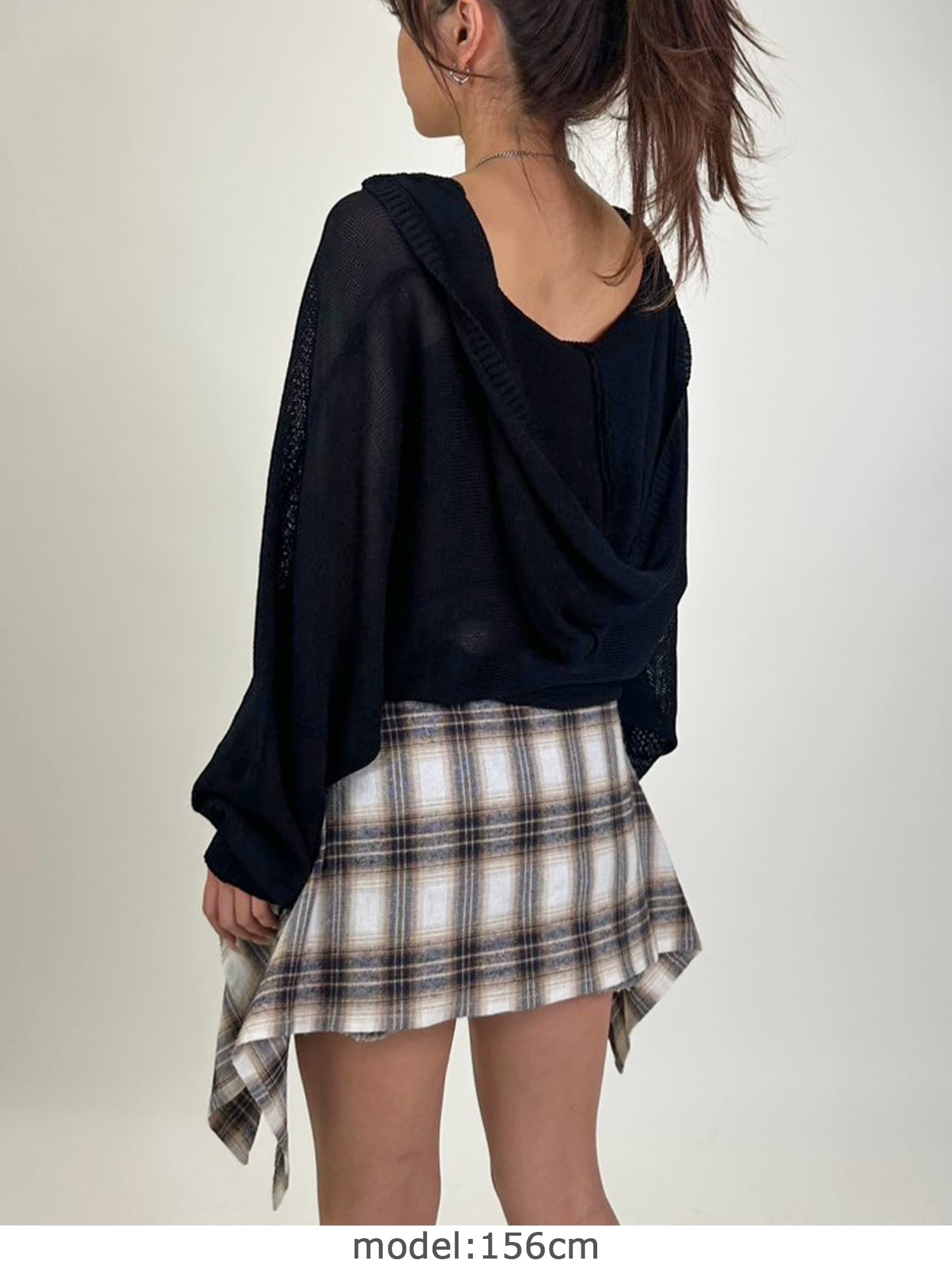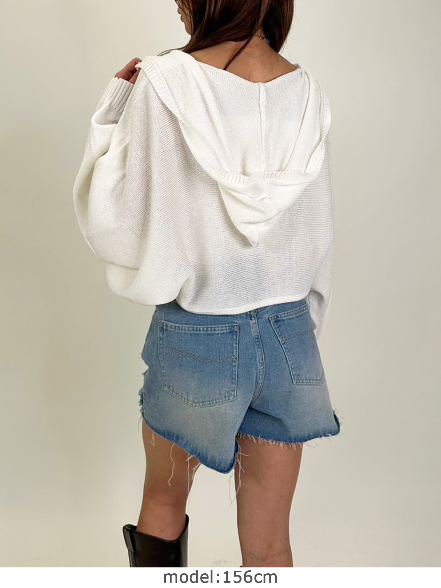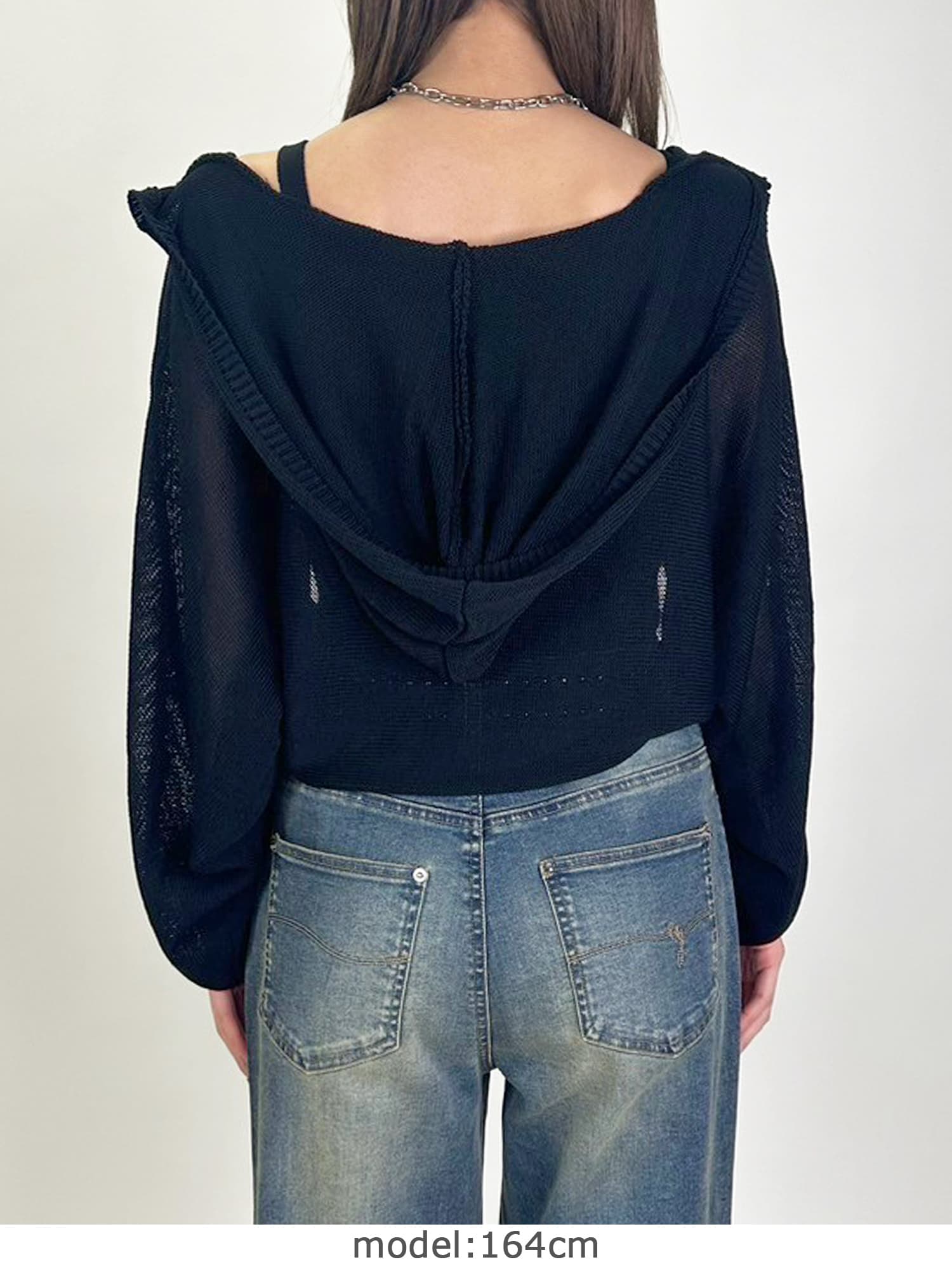シャリ感のある薄手で通気性の良い糸を使用しています。フード付なのでカジュアルなイメージですが、ボリュームのある袖で女性らしさもプラス。ジャスト丈なので、ミニボトムからフルレングスまで様々なシルエットのボトムと相性抜群です。