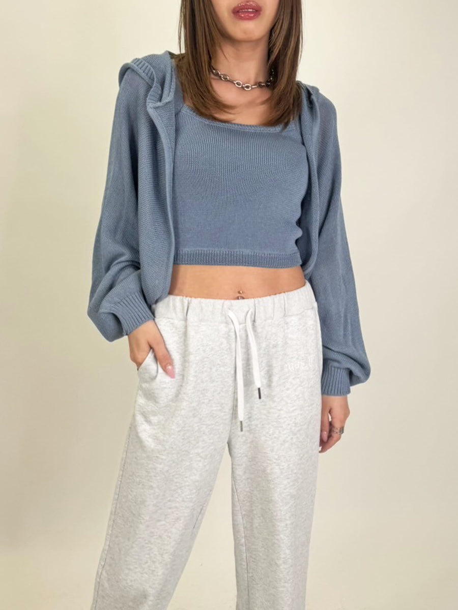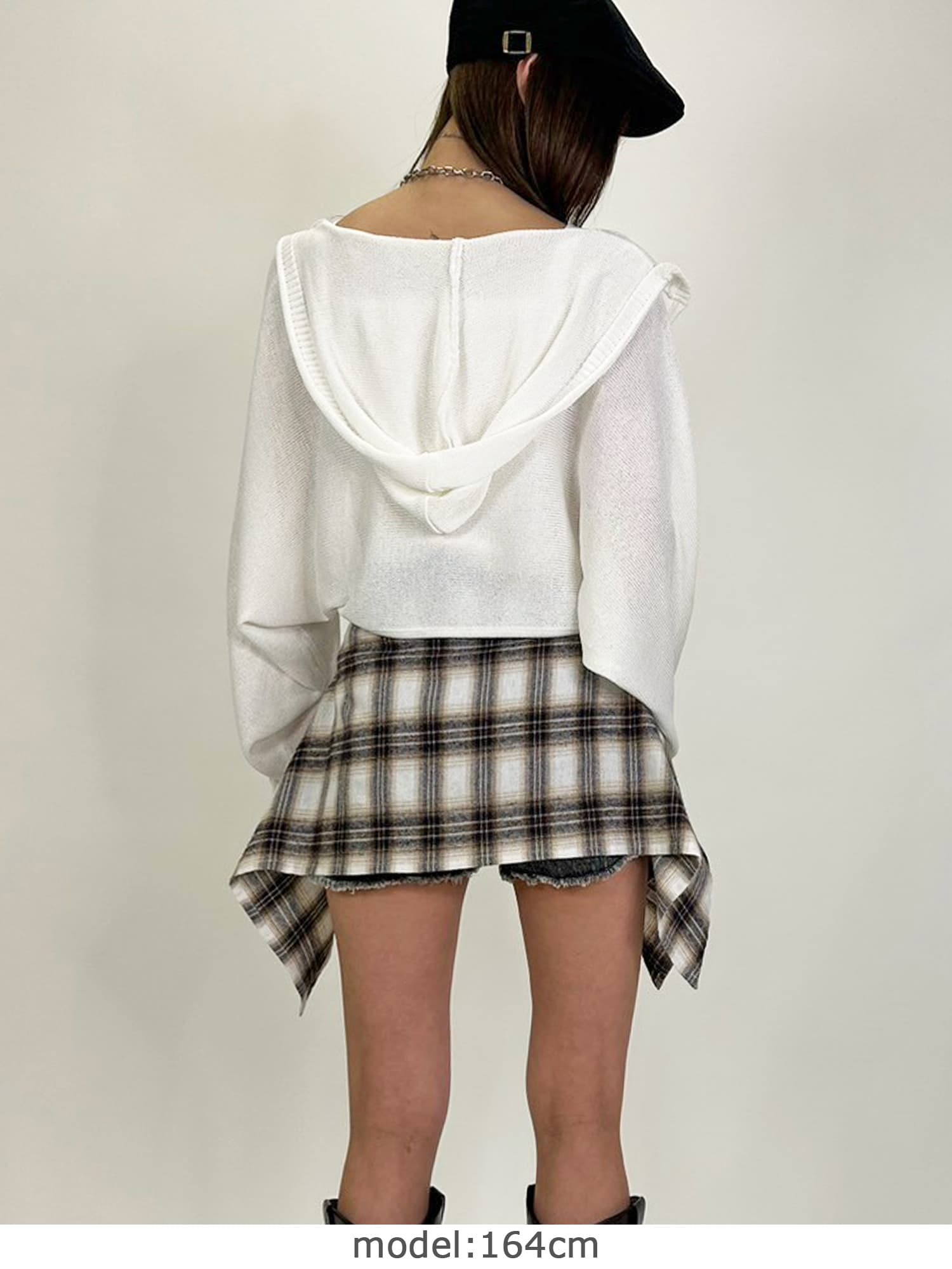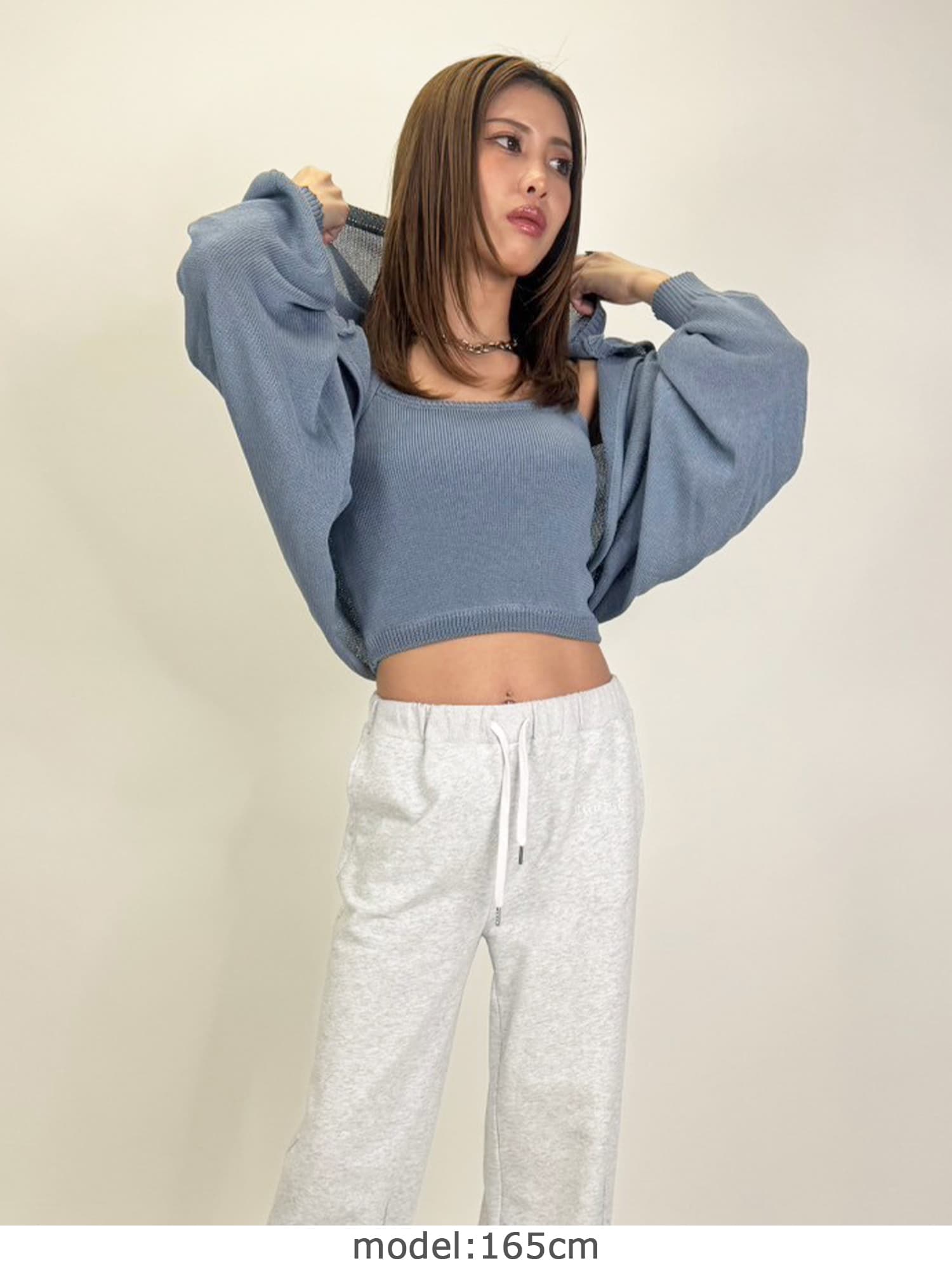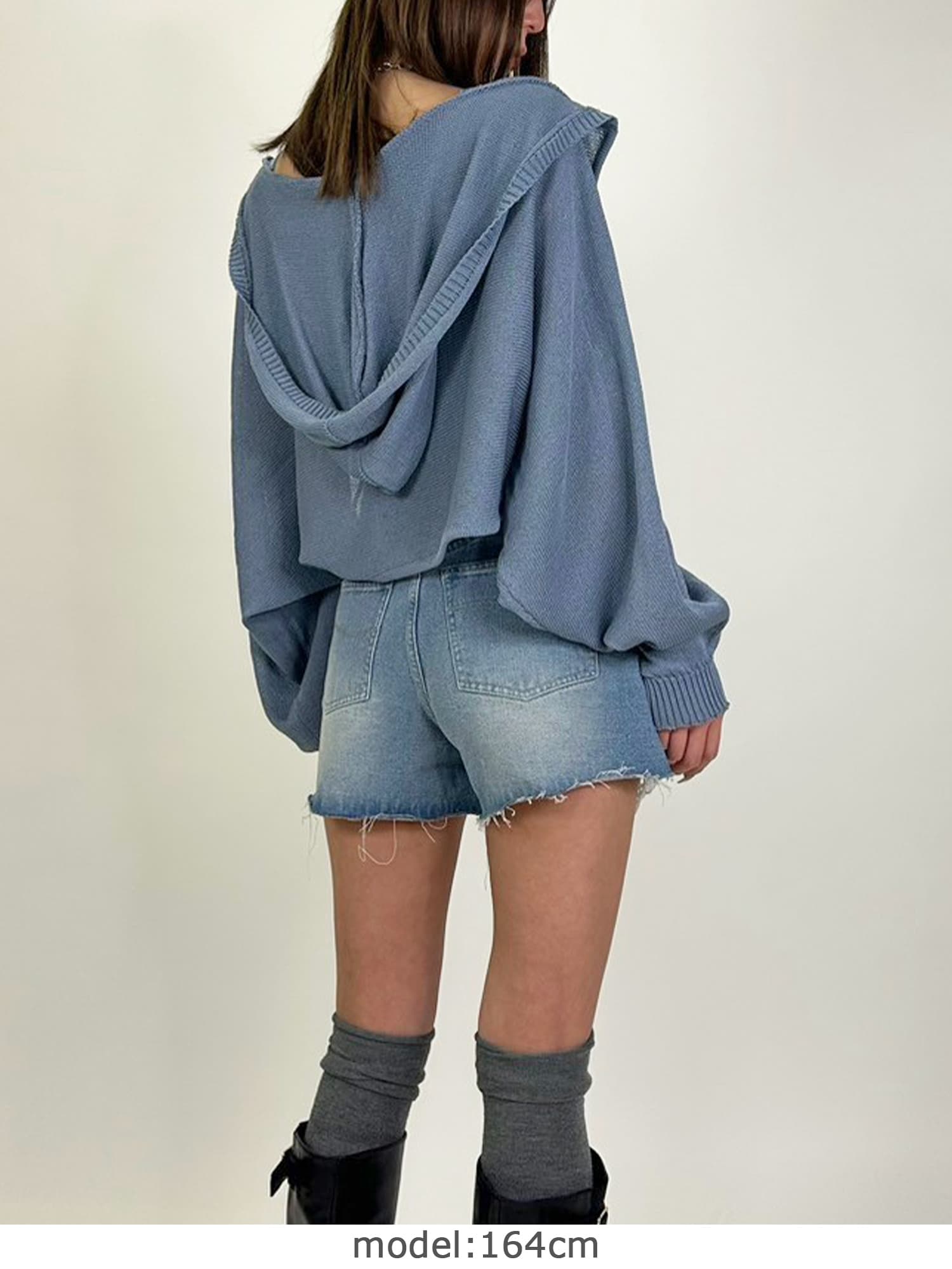シャリ感のある薄手で通気性の良い糸を使用しています。フード付なのでカジュアルなイメージですが、ボリュームのある袖で女性らしさもプラス。ジャスト丈なので、ミニボトムからフルレングスまで様々なシルエットのボトムと相性抜群です。