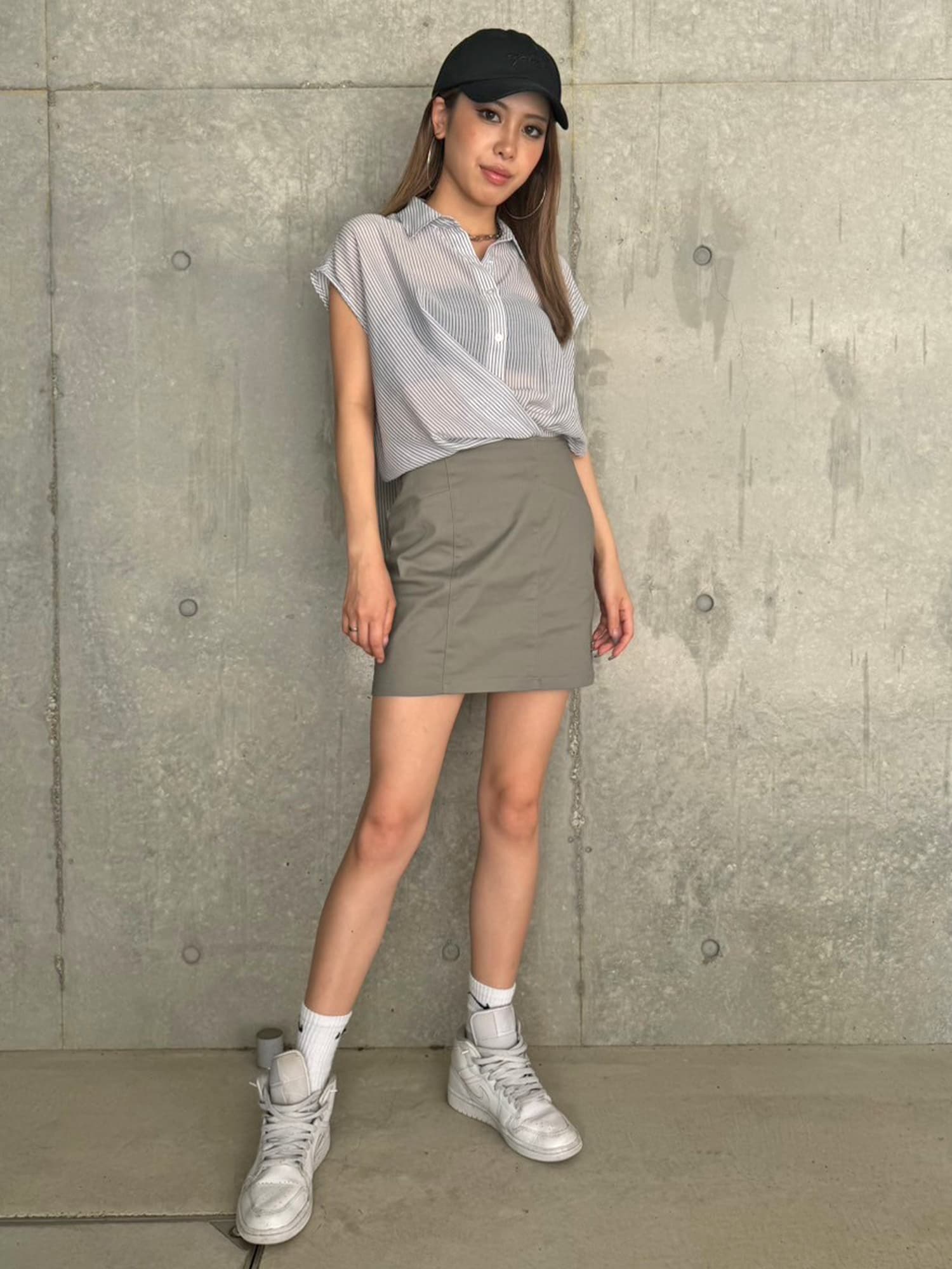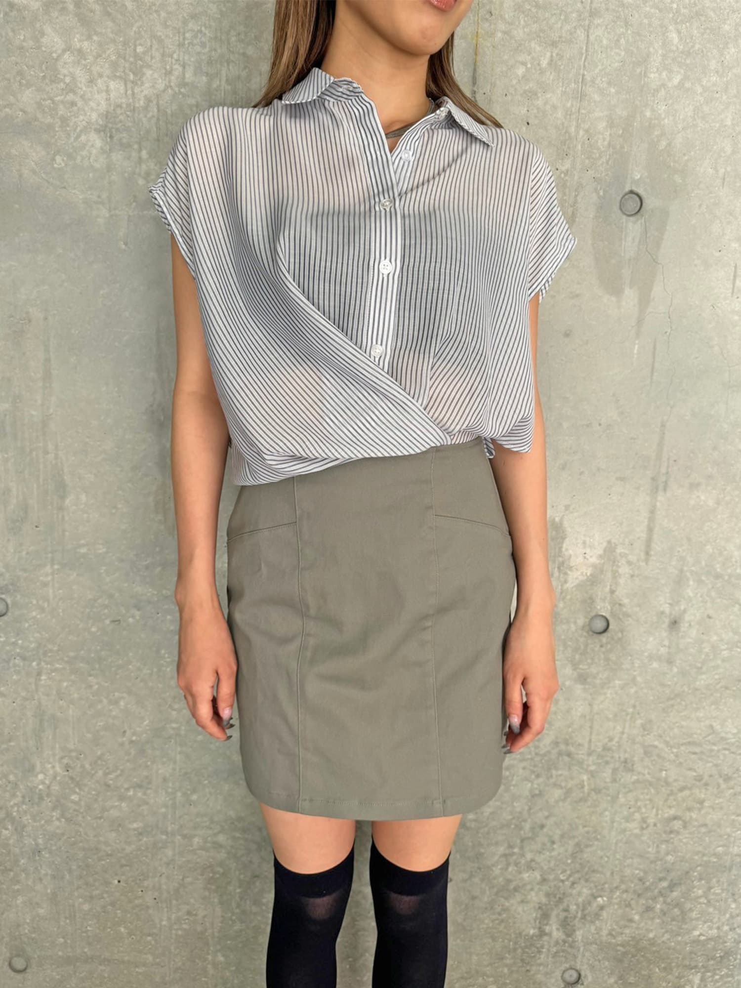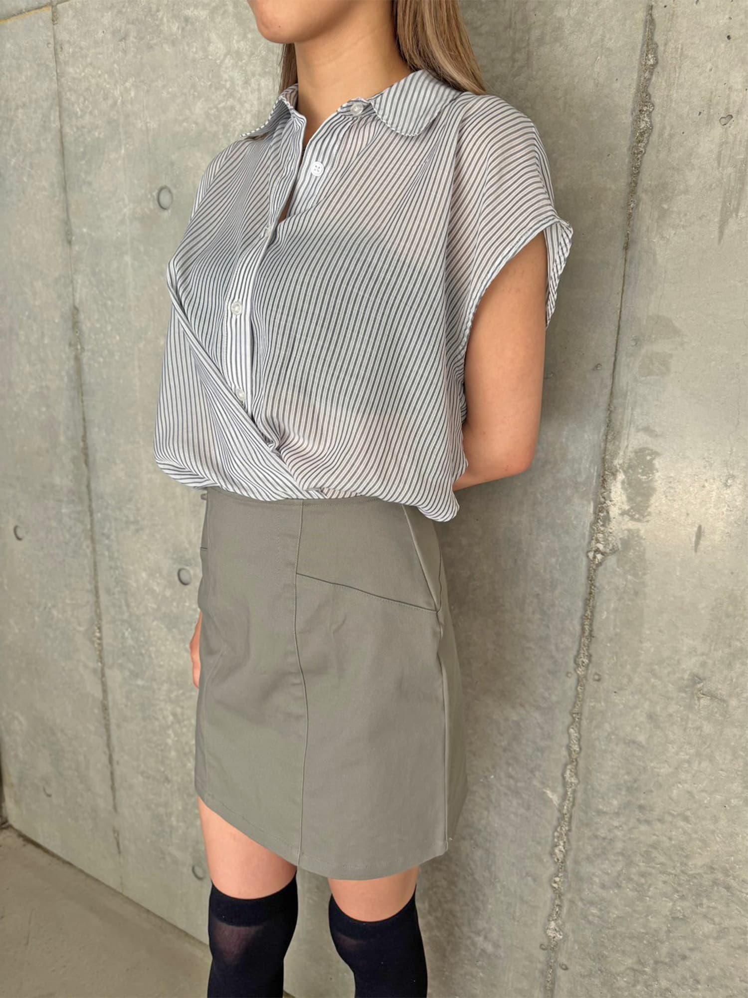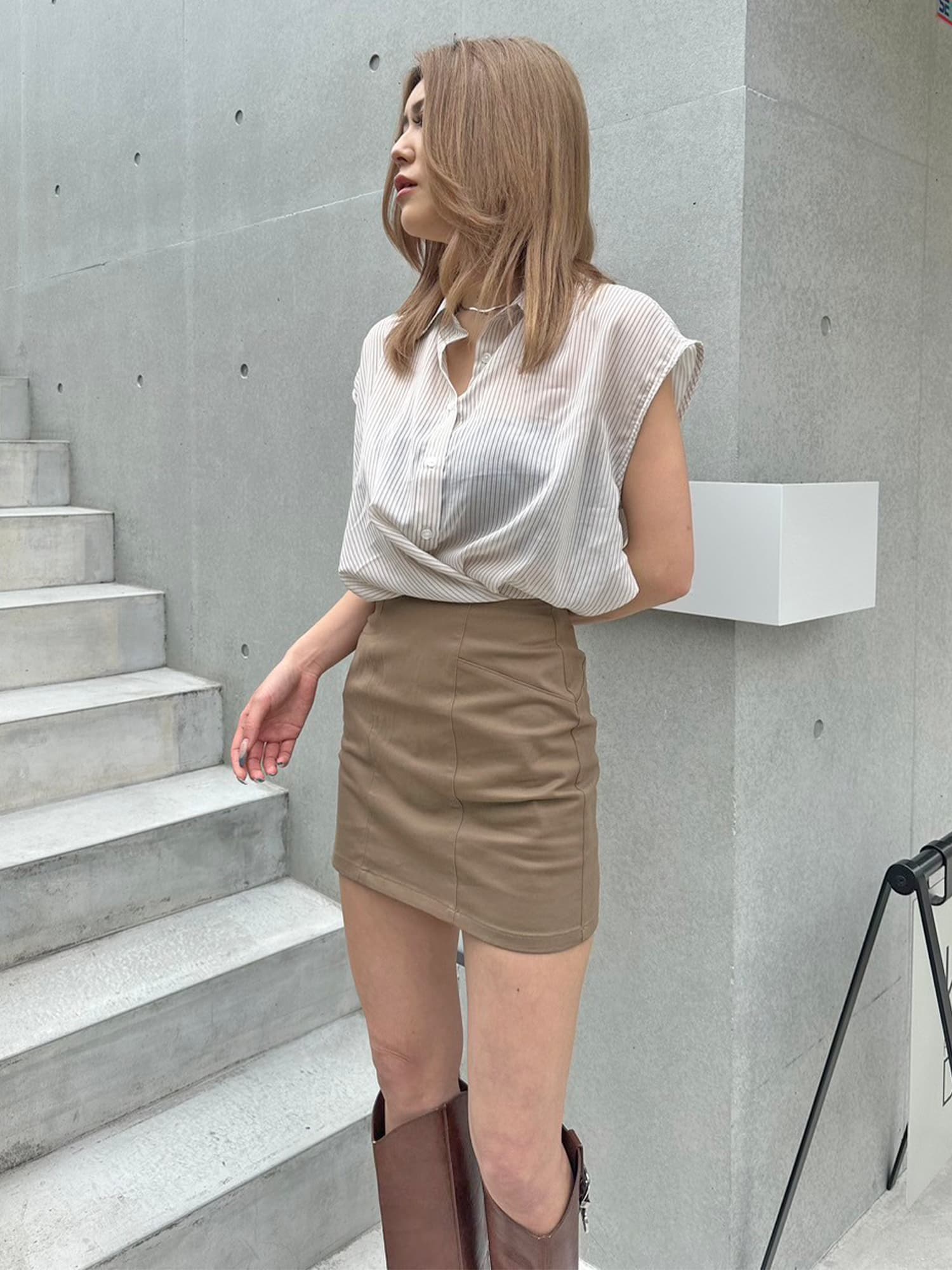 シャツの前裾をクロスさせたデザインで、前身頃部分のみスカートと繋がっています。シャツは軽くこの時期にぴったりな生地感で、ブラウジングさせているように見えるデザインなため程よいゆとりがあります。シャツの後ろは裾をINでもOUTでもお好みでアレンジしていただけるようにしました。スニーカーやサンダル+ソックス合わせでカジュアルなコーデもおススメ。小物次第で雰囲気を変えられるアイテムです。スカートのBackにファスナーが付いているので着脱は簡単です。