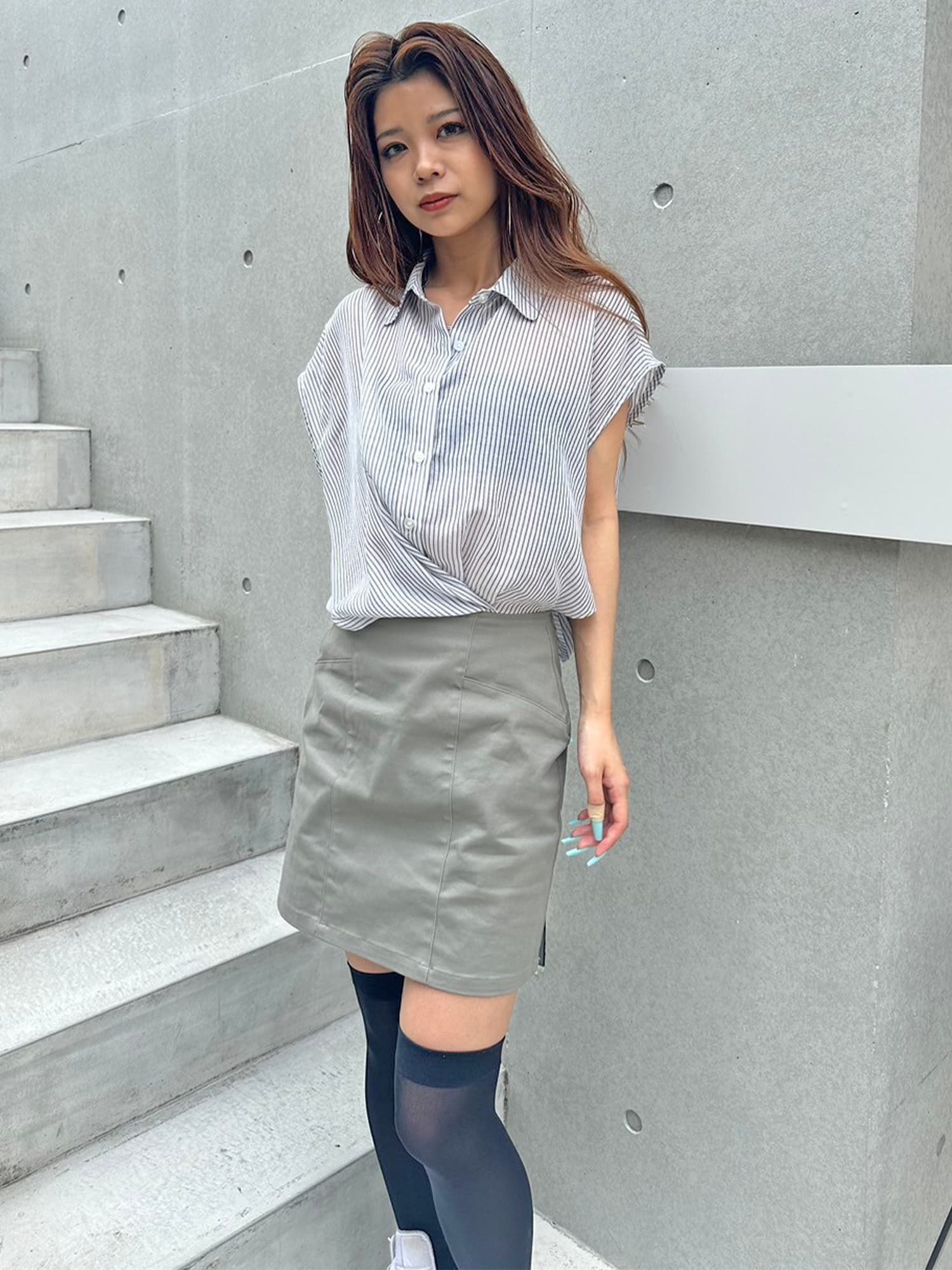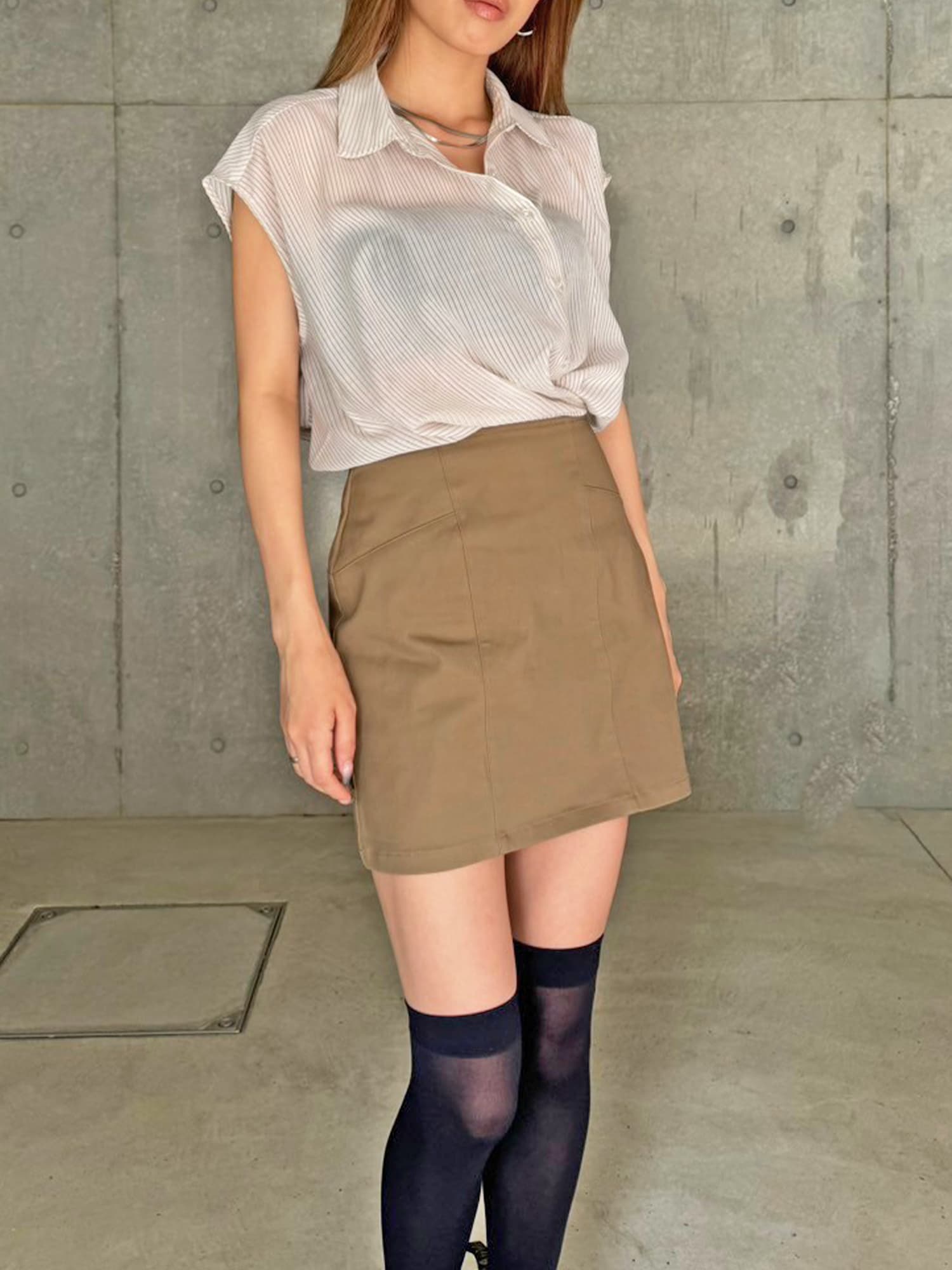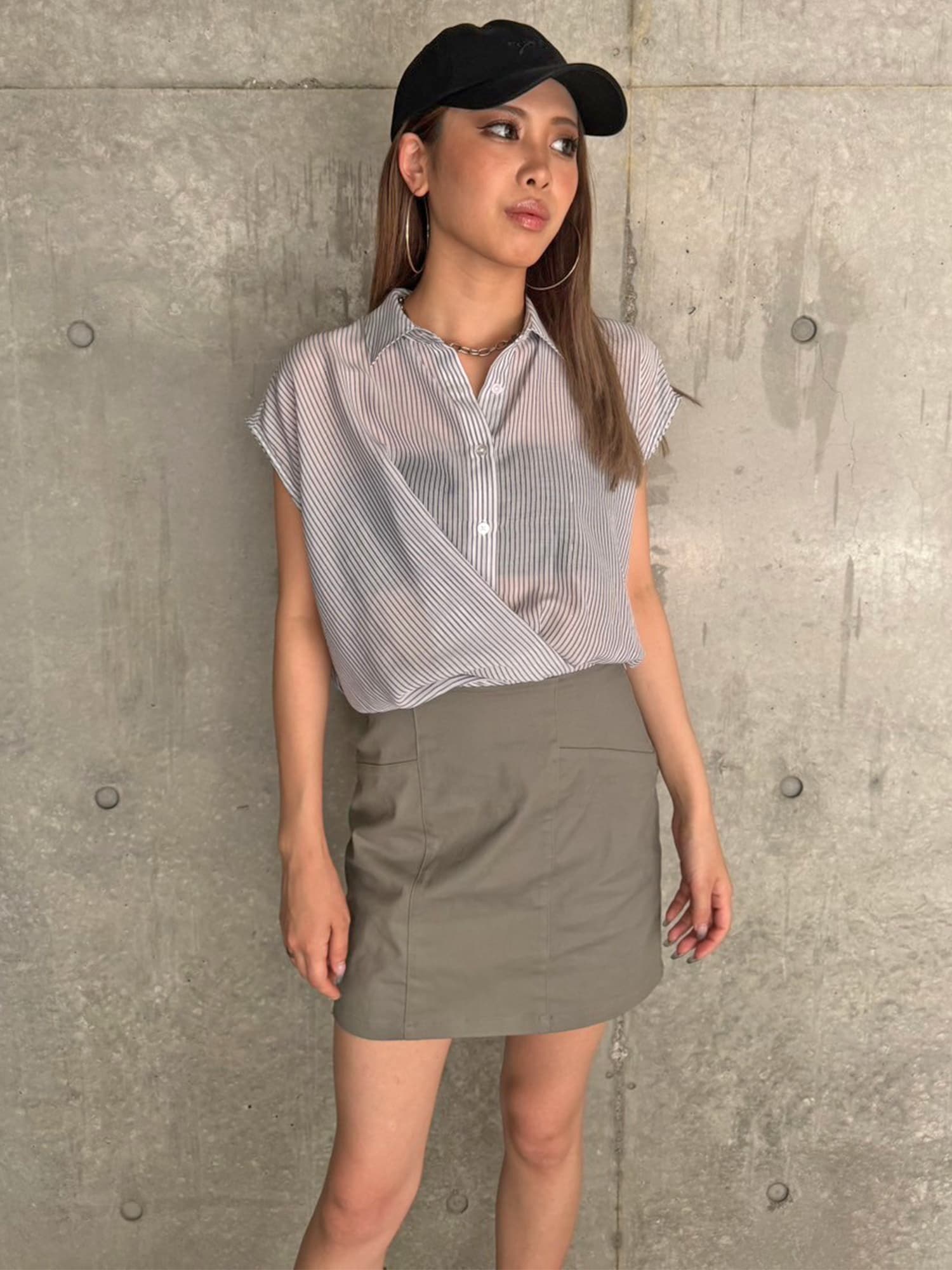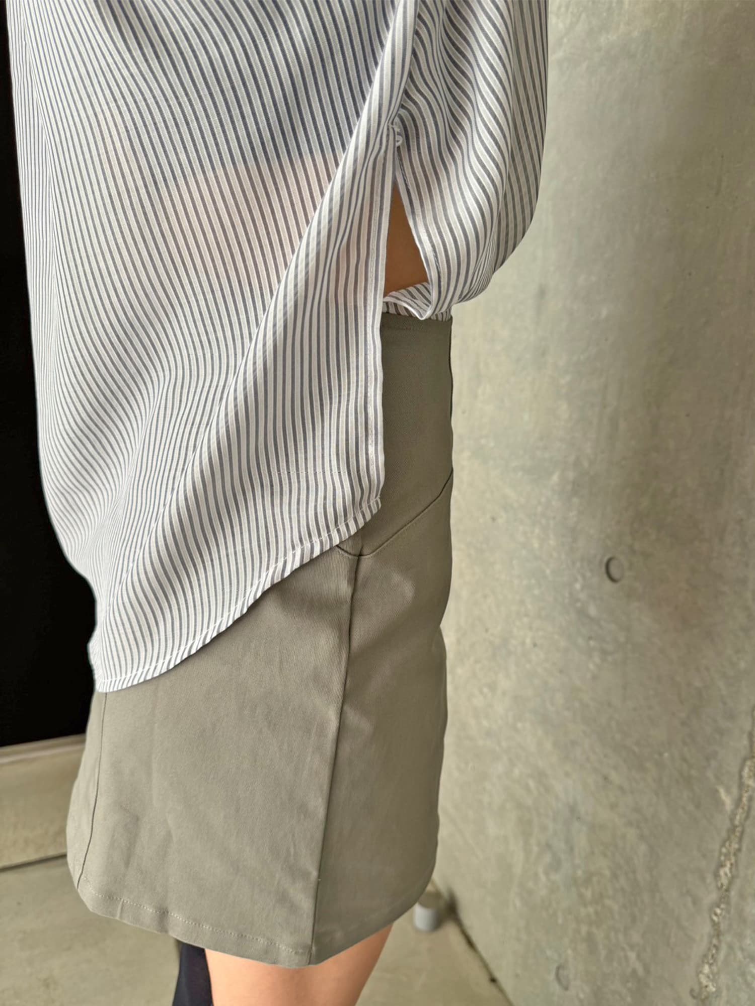 シャツの前裾をクロスさせたデザインで、前身頃部分のみスカートと繋がっています。シャツは軽くこの時期にぴったりな生地感で、ブラウジングさせているように見えるデザインなため程よいゆとりがあります。シャツの後ろは裾をINでもOUTでもお好みでアレンジしていただけるようにしました。スニーカーやサンダル+ソックス合わせでカジュアルなコーデもおススメ。小物次第で雰囲気を変えられるアイテムです。スカートのBackにファスナーが付いているので着脱は簡単です。
