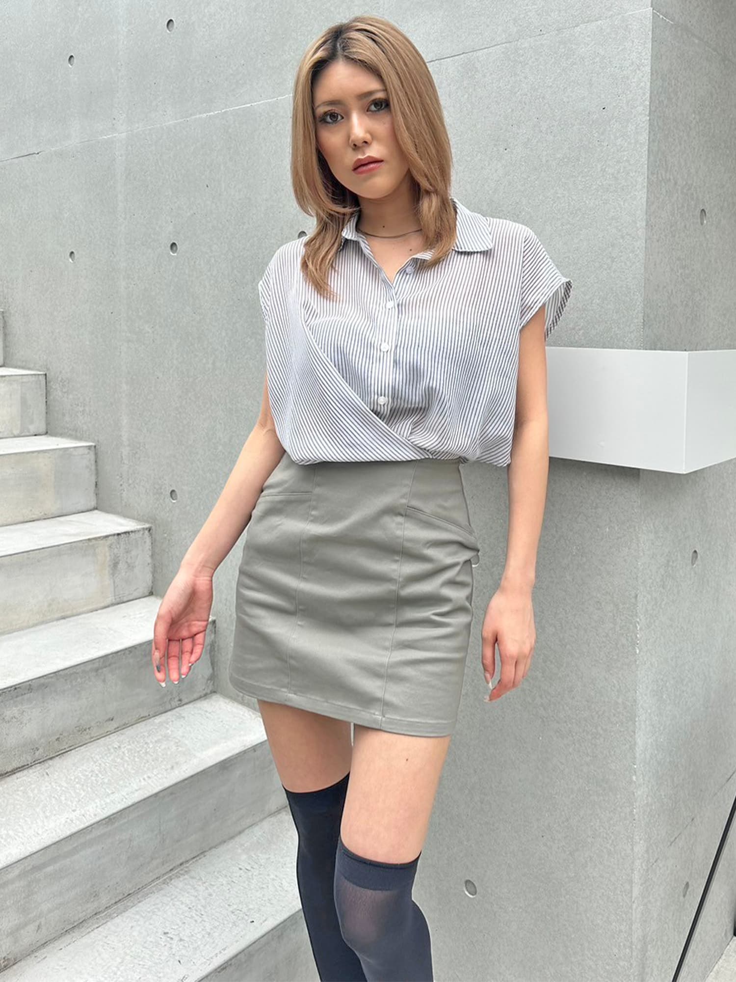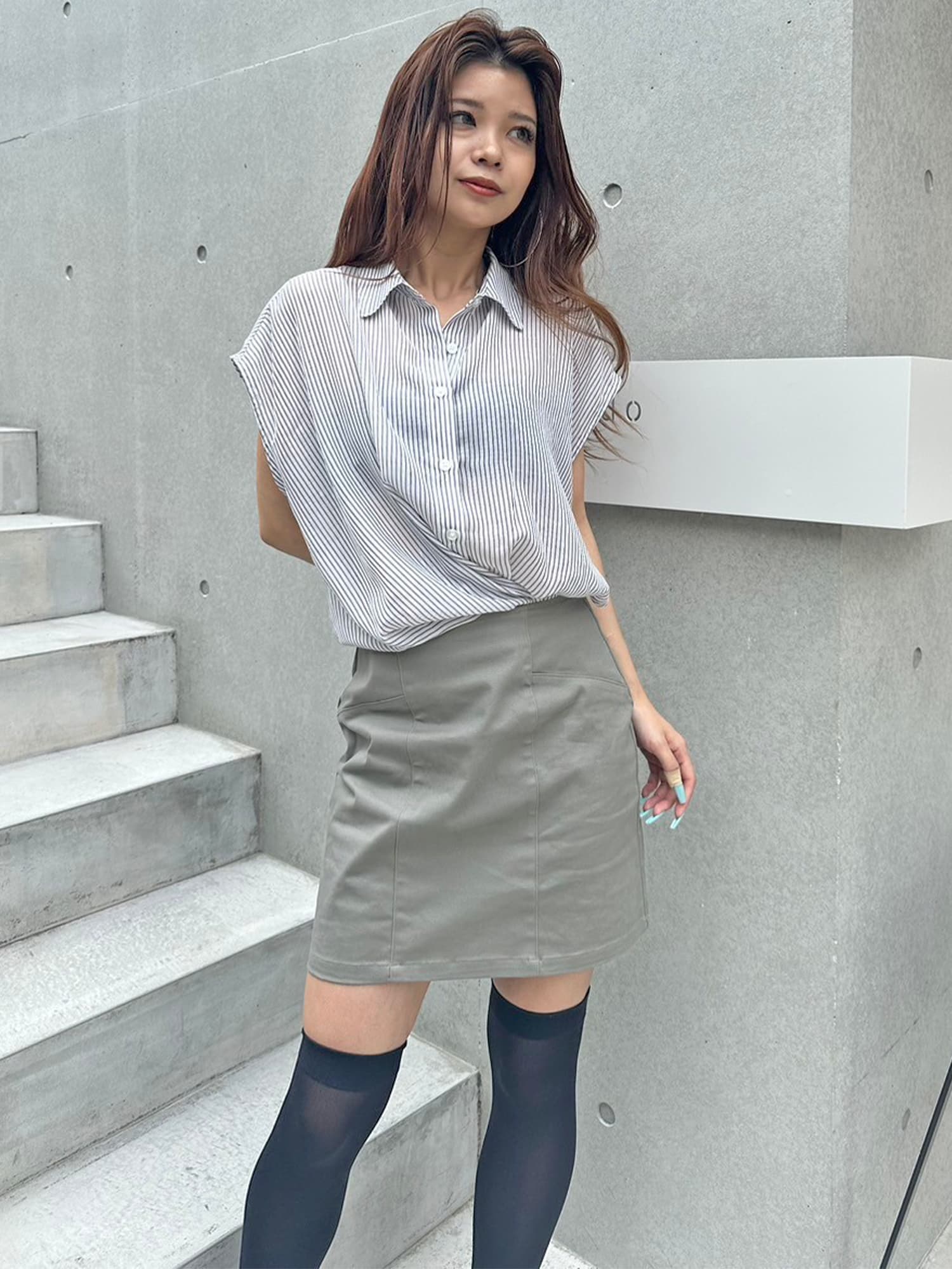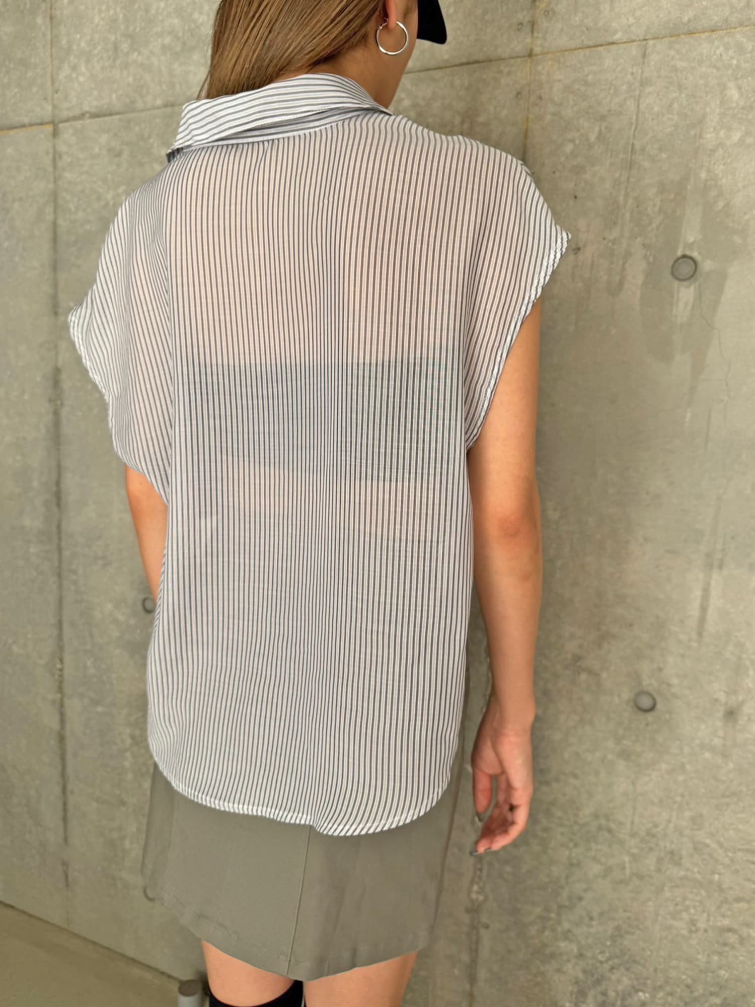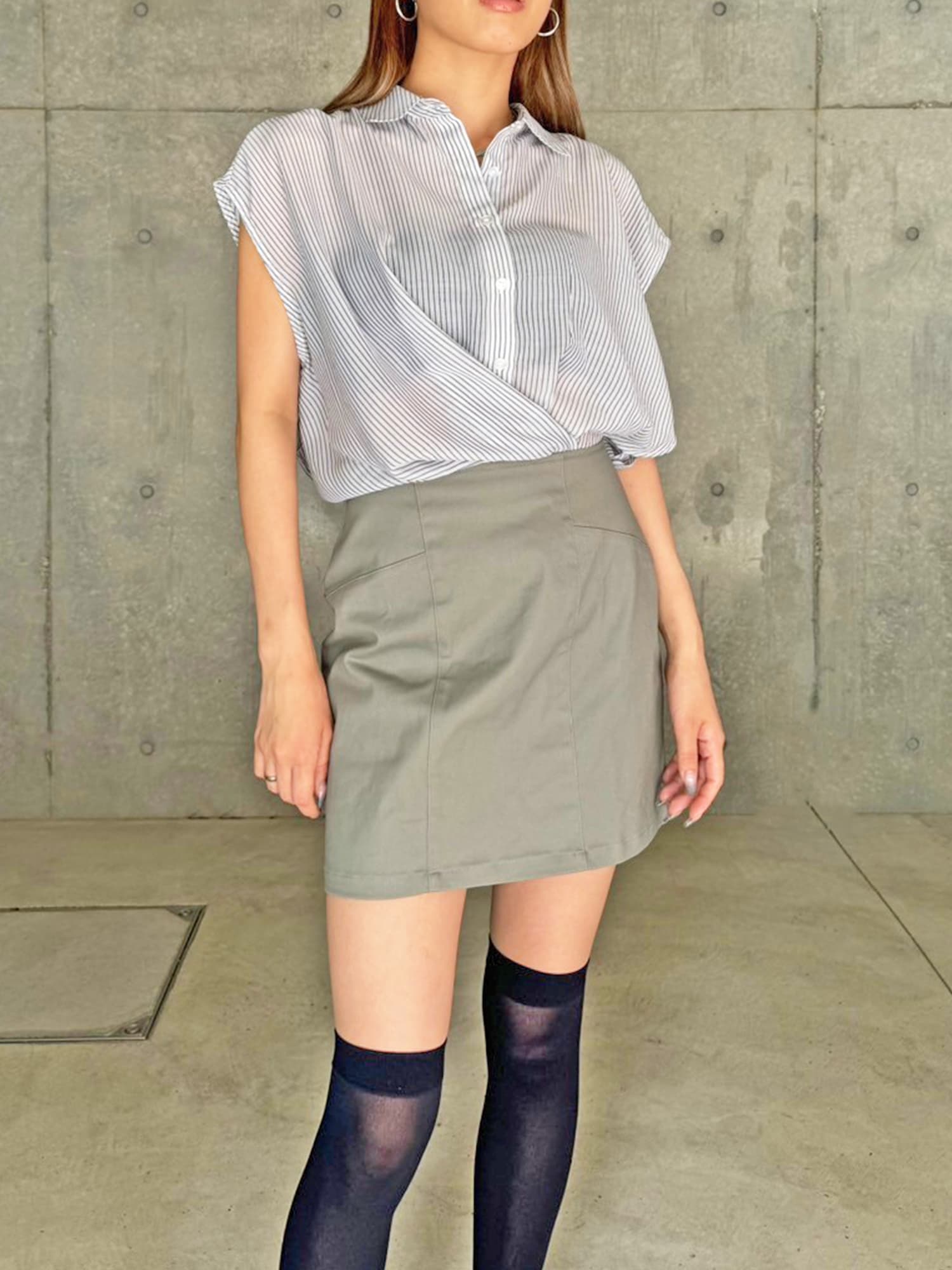 シャツの前裾をクロスさせたデザインで、前身頃部分のみスカートと繋がっています。シャツは軽くこの時期にぴったりな生地感で、ブラウジングさせているように見えるデザインなため程よいゆとりがあります。シャツの後ろは裾をINでもOUTでもお好みでアレンジしていただけるようにしました。スニーカーやサンダル+ソックス合わせでカジュアルなコーデもおススメ。小物次第で雰囲気を変えられるアイテムです。スカートのBackにファスナーが付いているので着脱は簡単です。