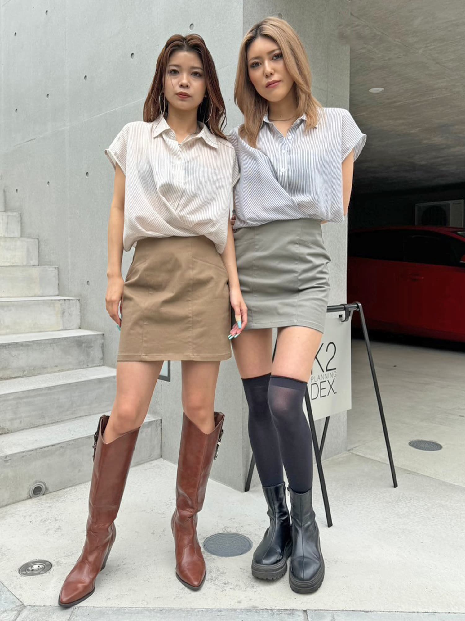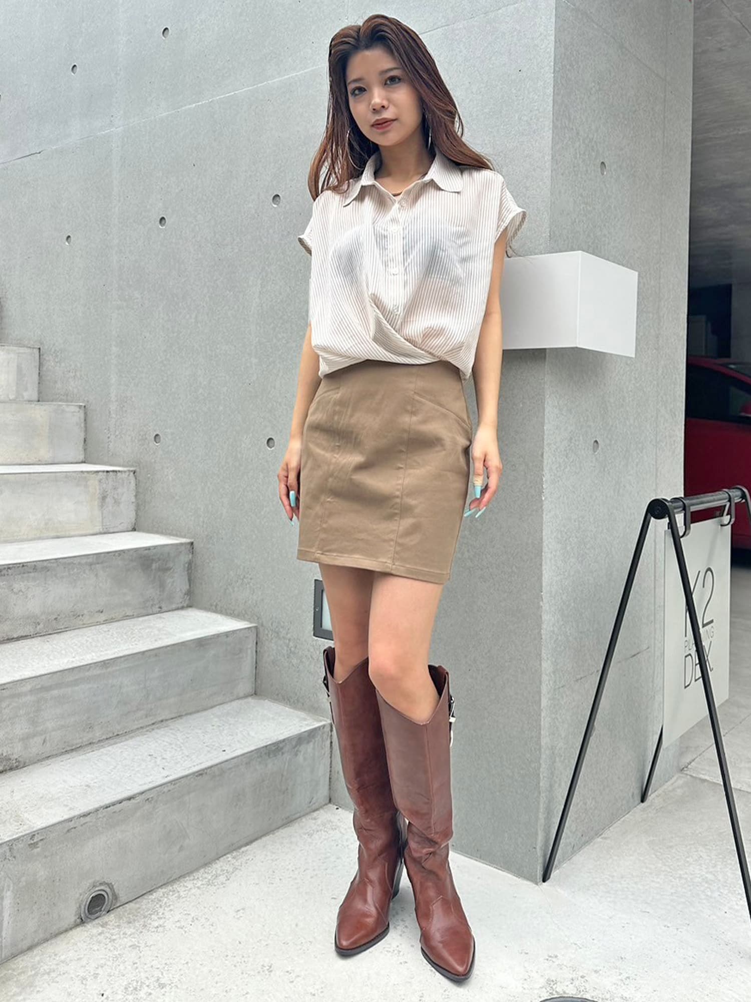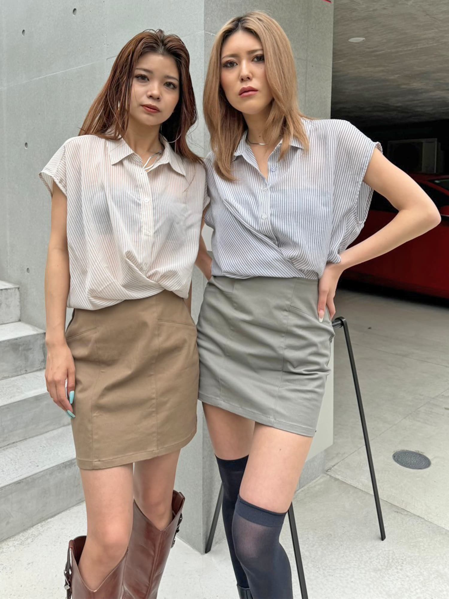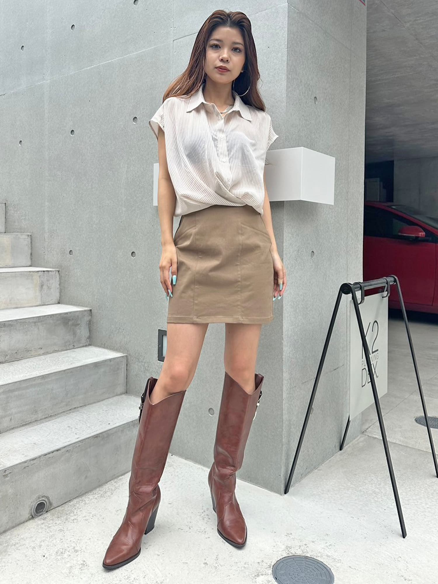 シャツの前裾をクロスさせたデザインで、前身頃部分のみスカートと繋がっています。シャツは軽くこの時期にぴったりな生地感で、ブラウジングさせているように見えるデザインなため程よいゆとりがあります。シャツの後ろは裾をINでもOUTでもお好みでアレンジしていただけるようにしました。スニーカーやサンダル+ソックス合わせでカジュアルなコーデもおススメ。小物次第で雰囲気を変えられるアイテムです。スカートのBackにファスナーが付いているので着脱は簡単です。