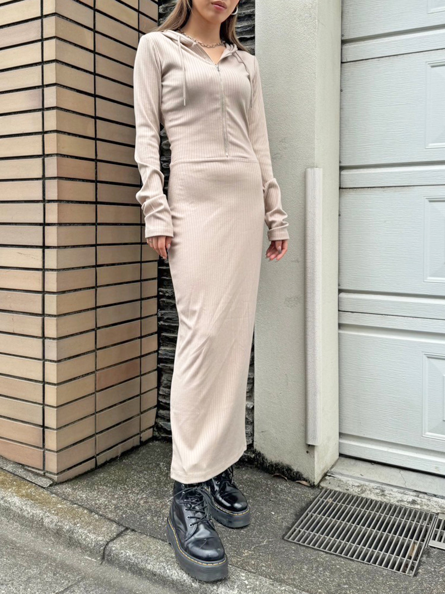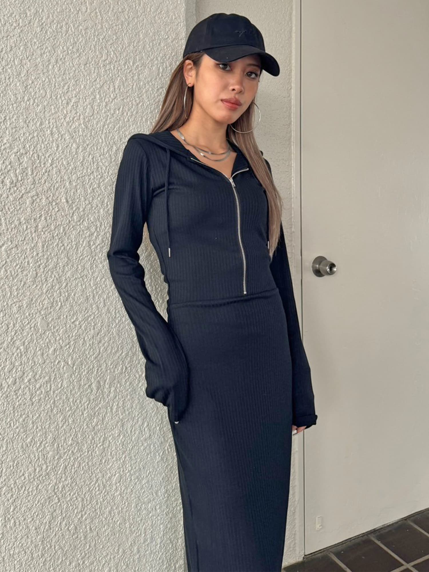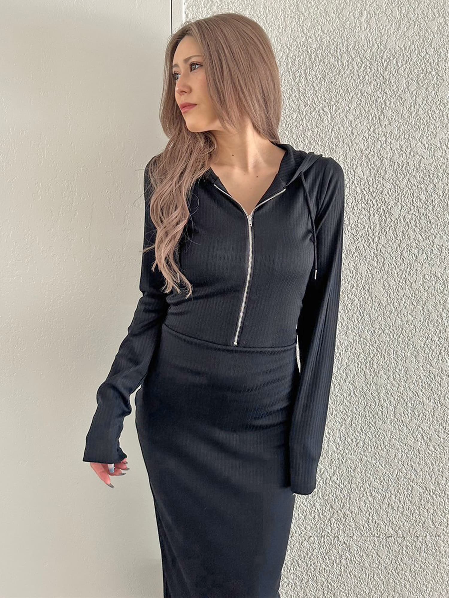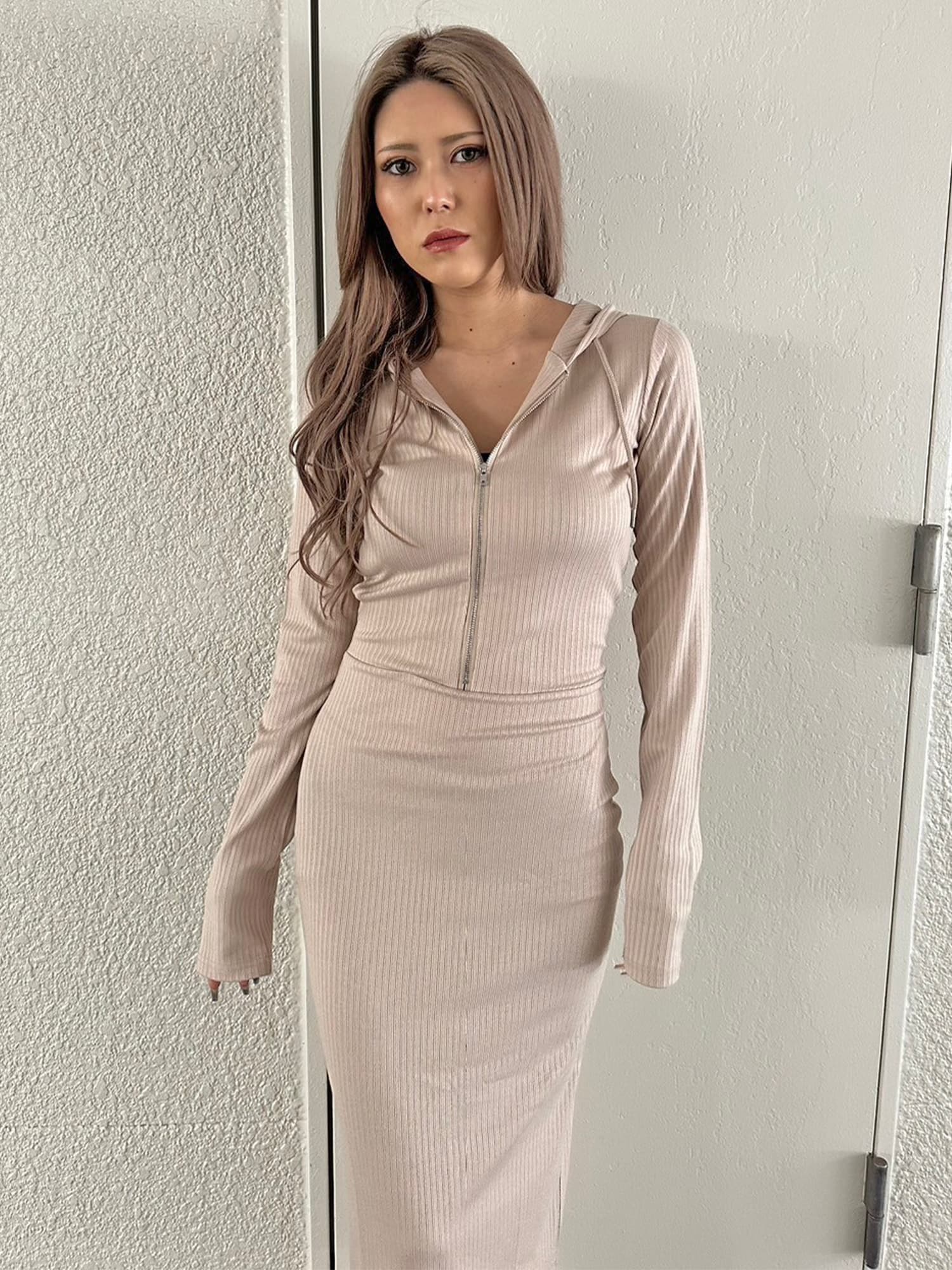 - フロントジップリブフーディワンピース