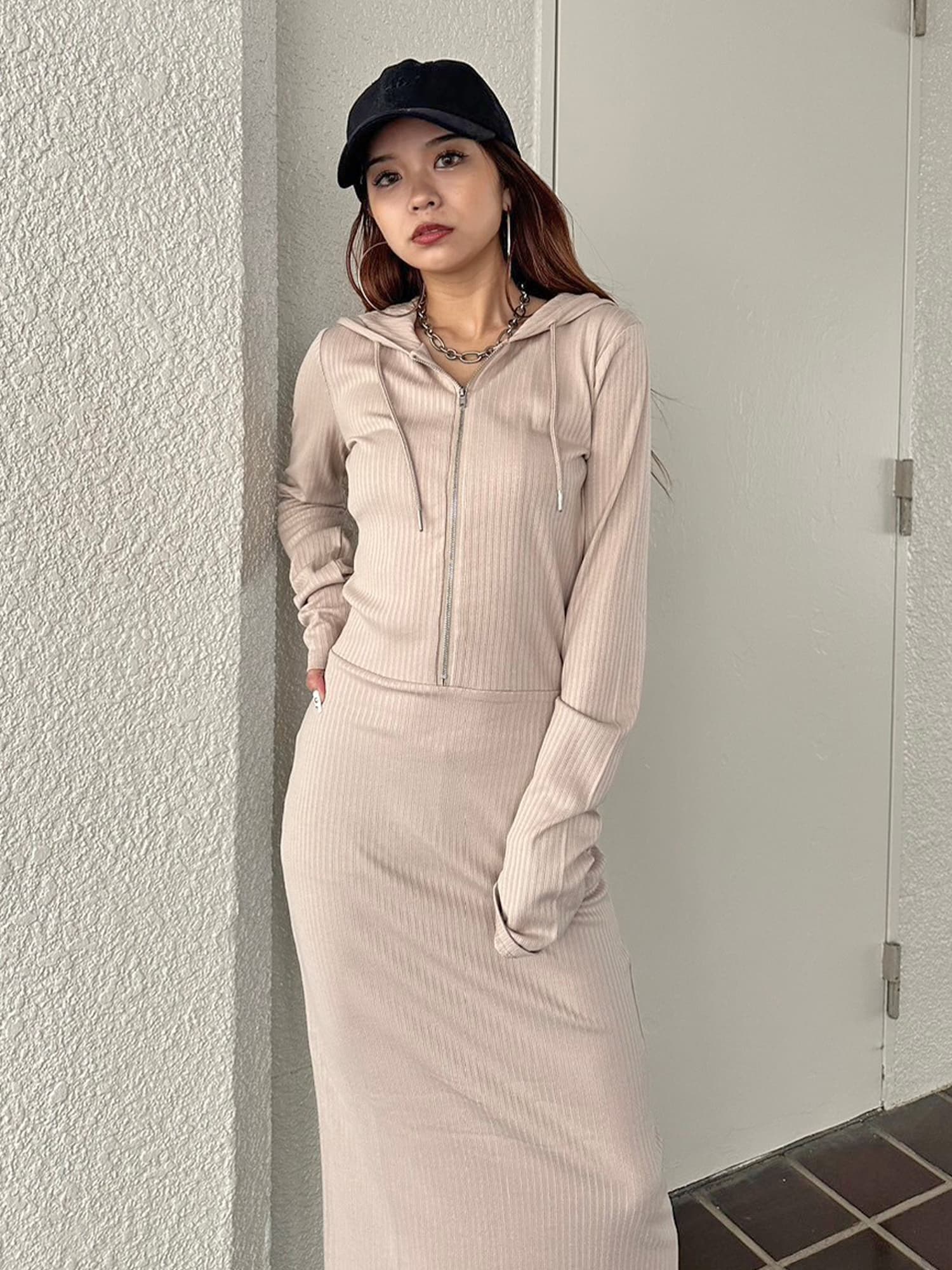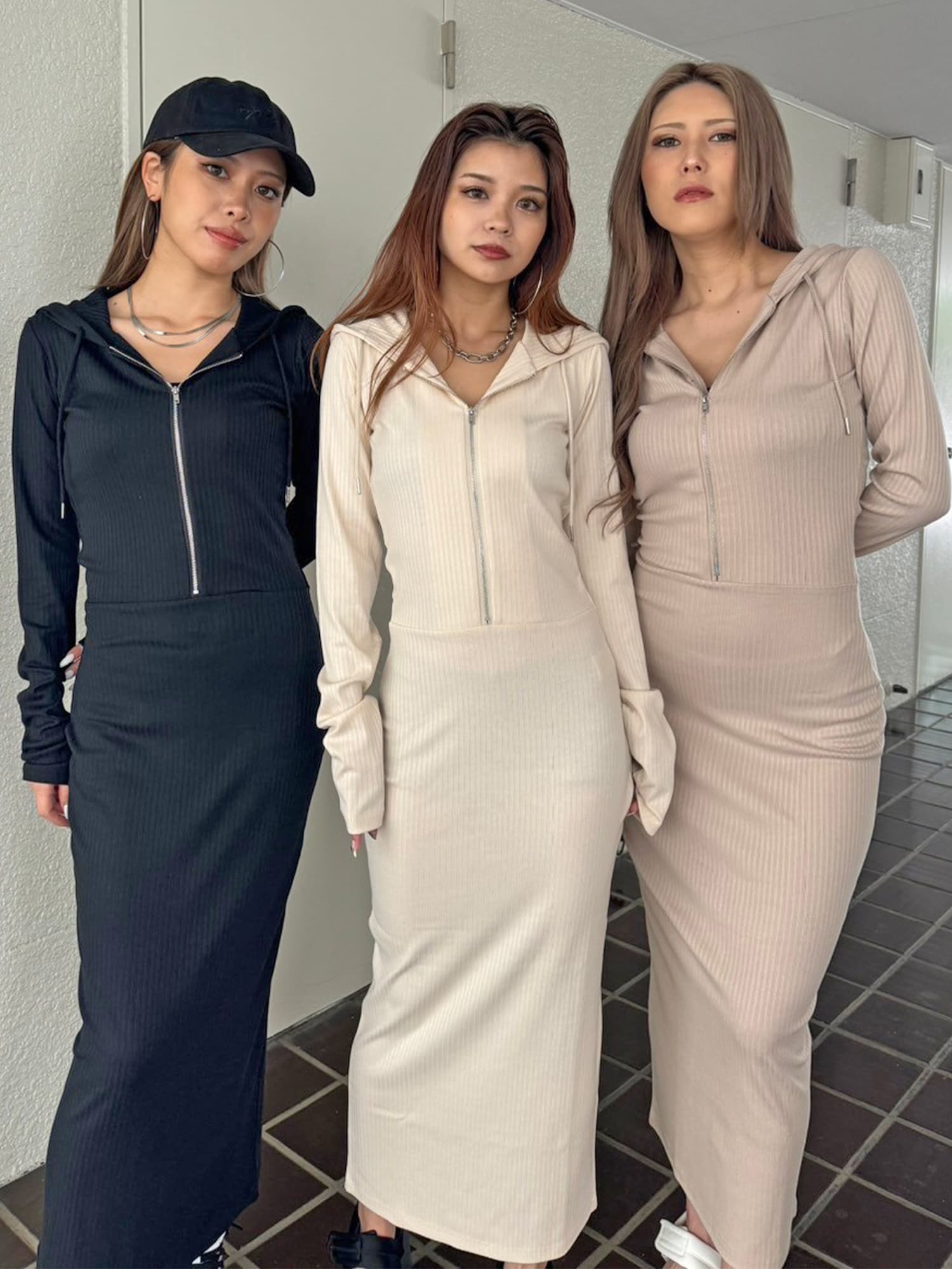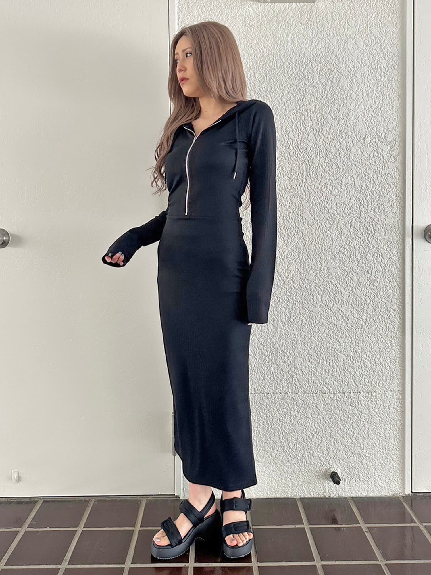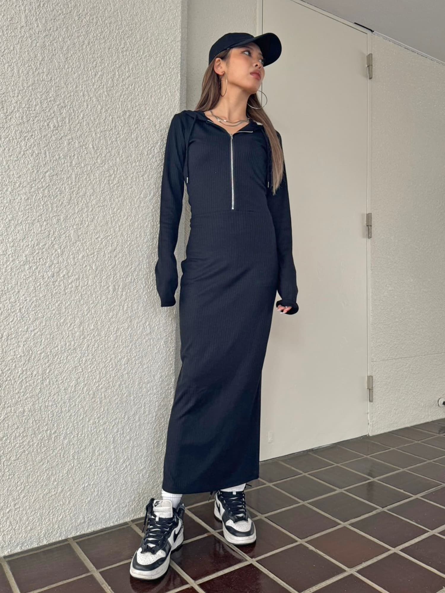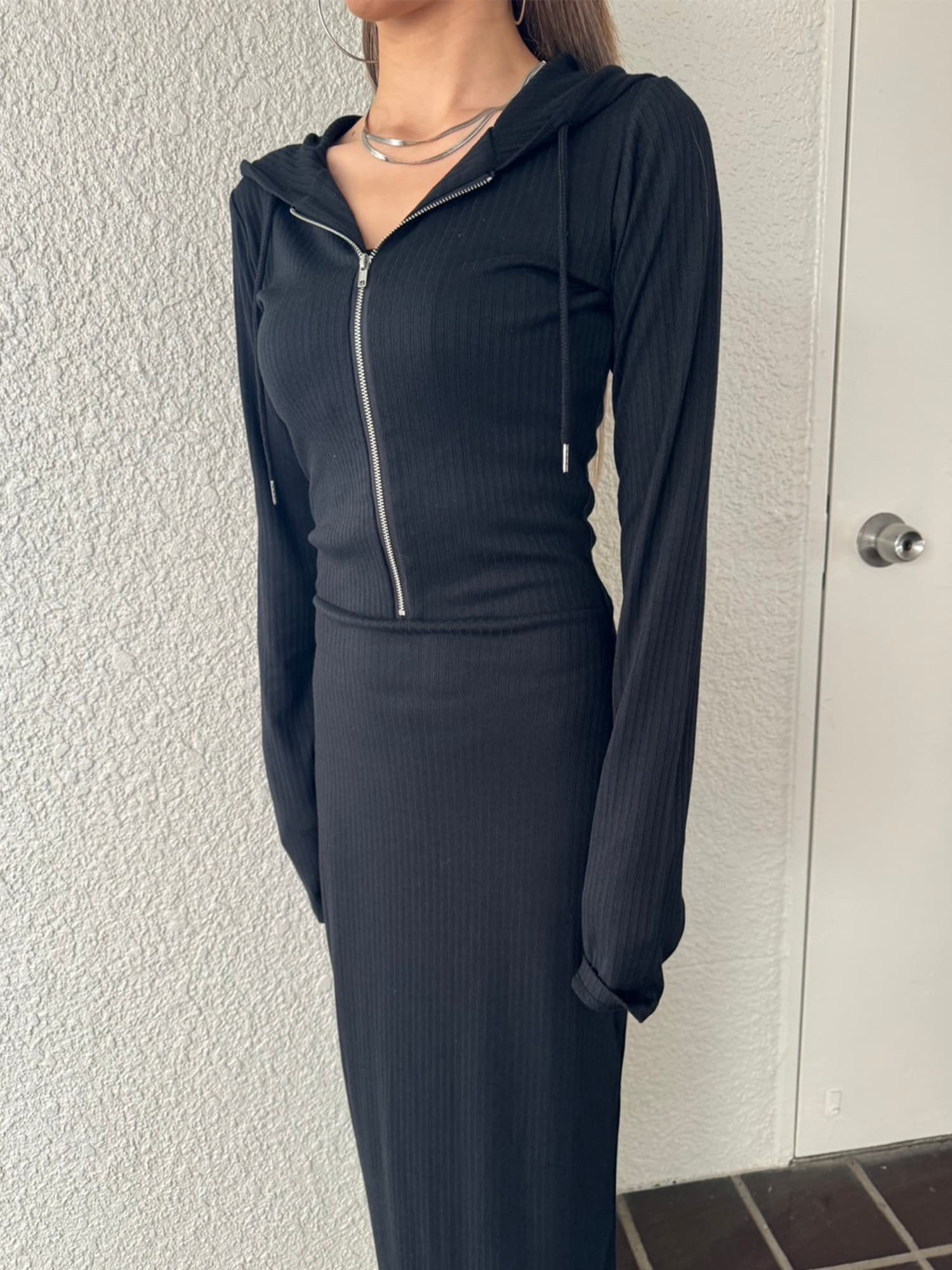 - フロントジップリブフーディワンピース
