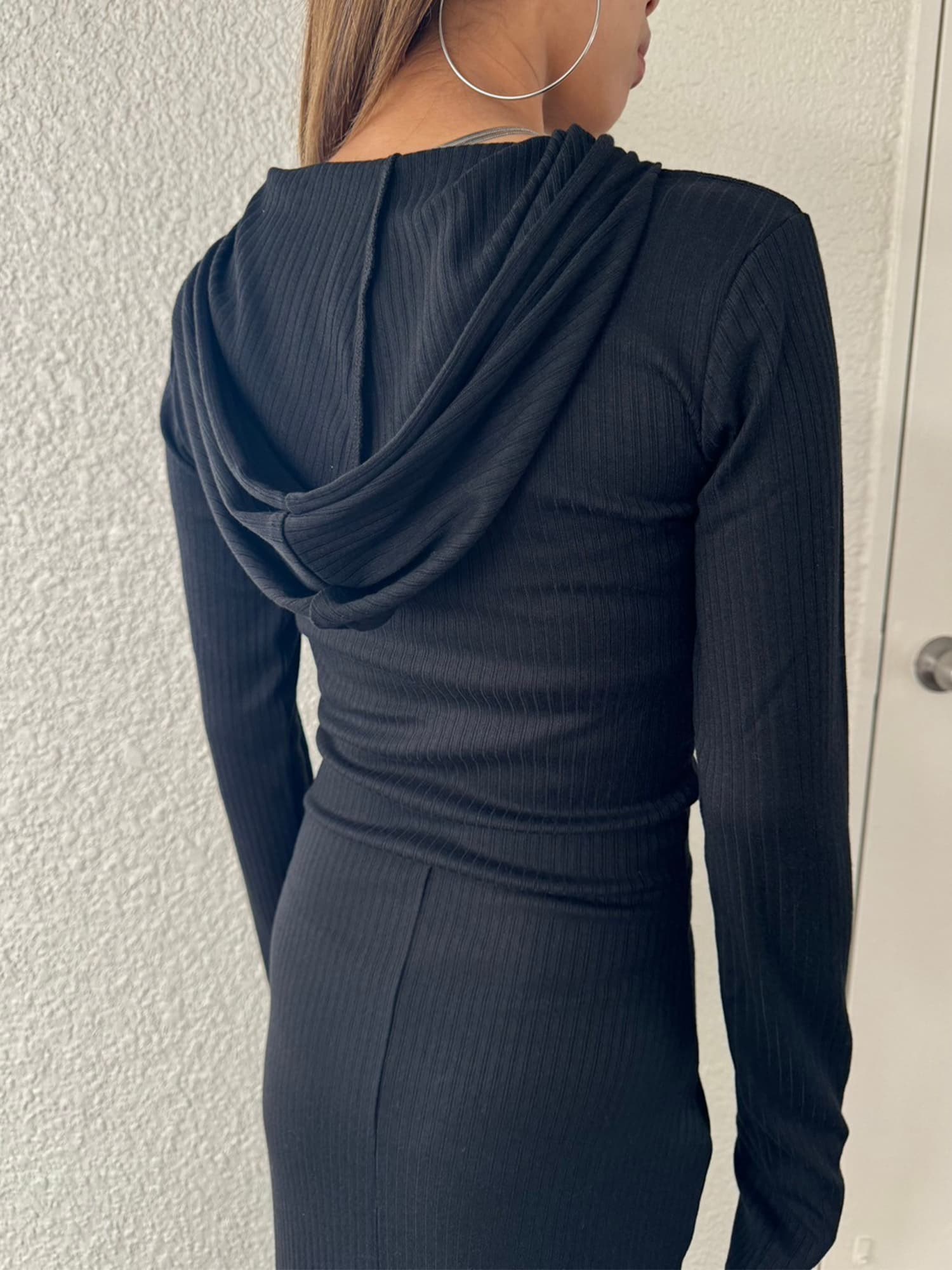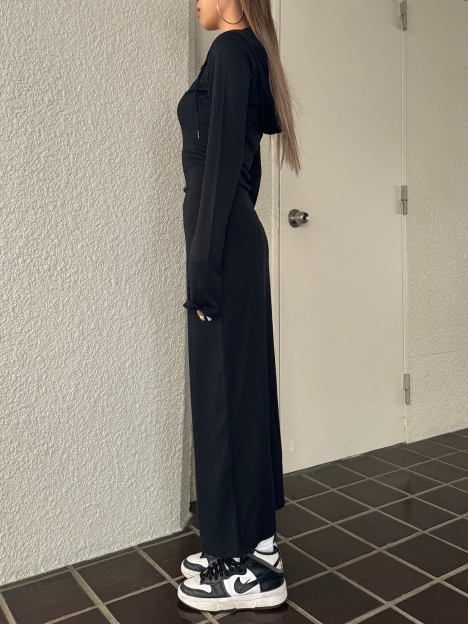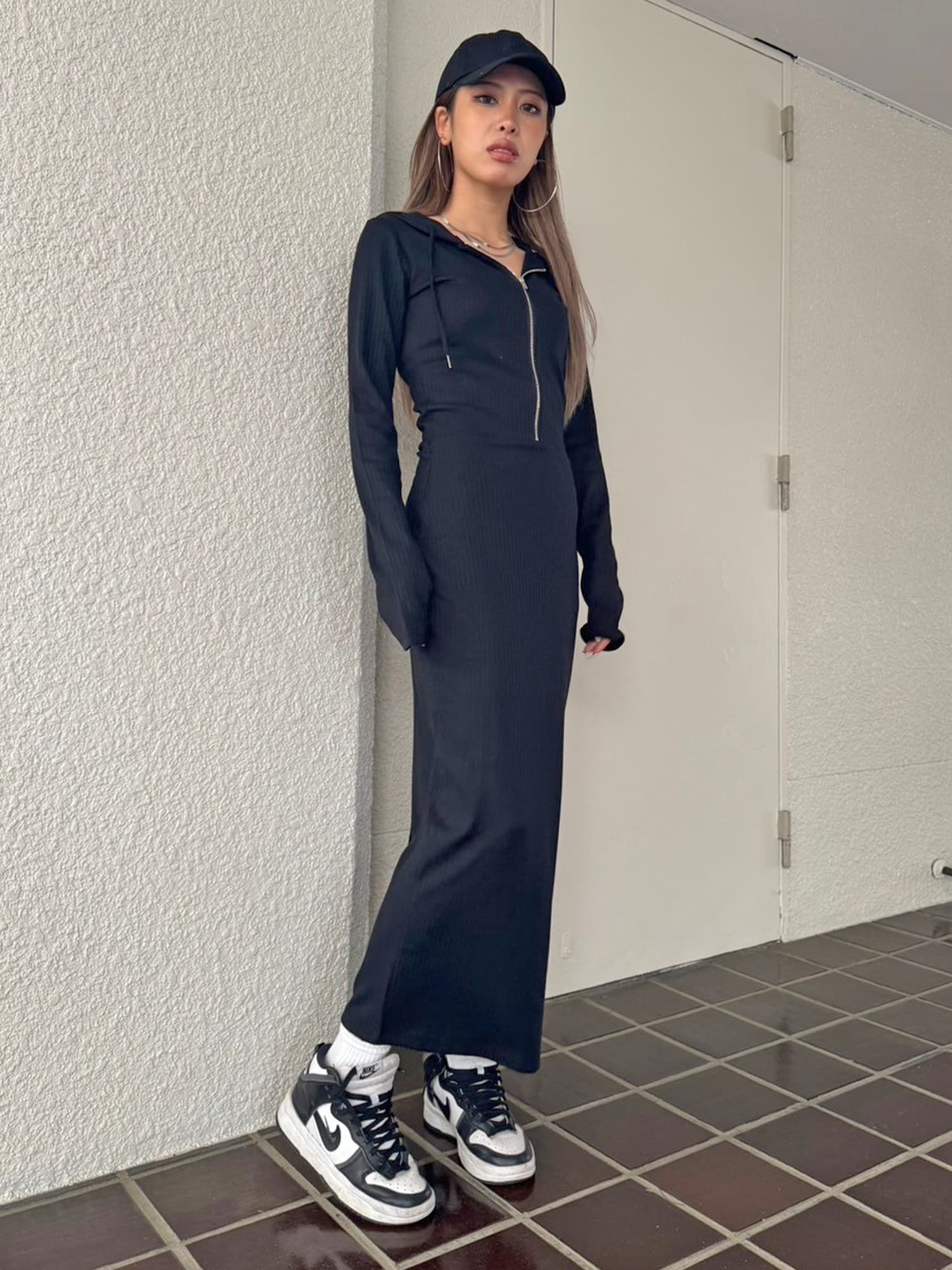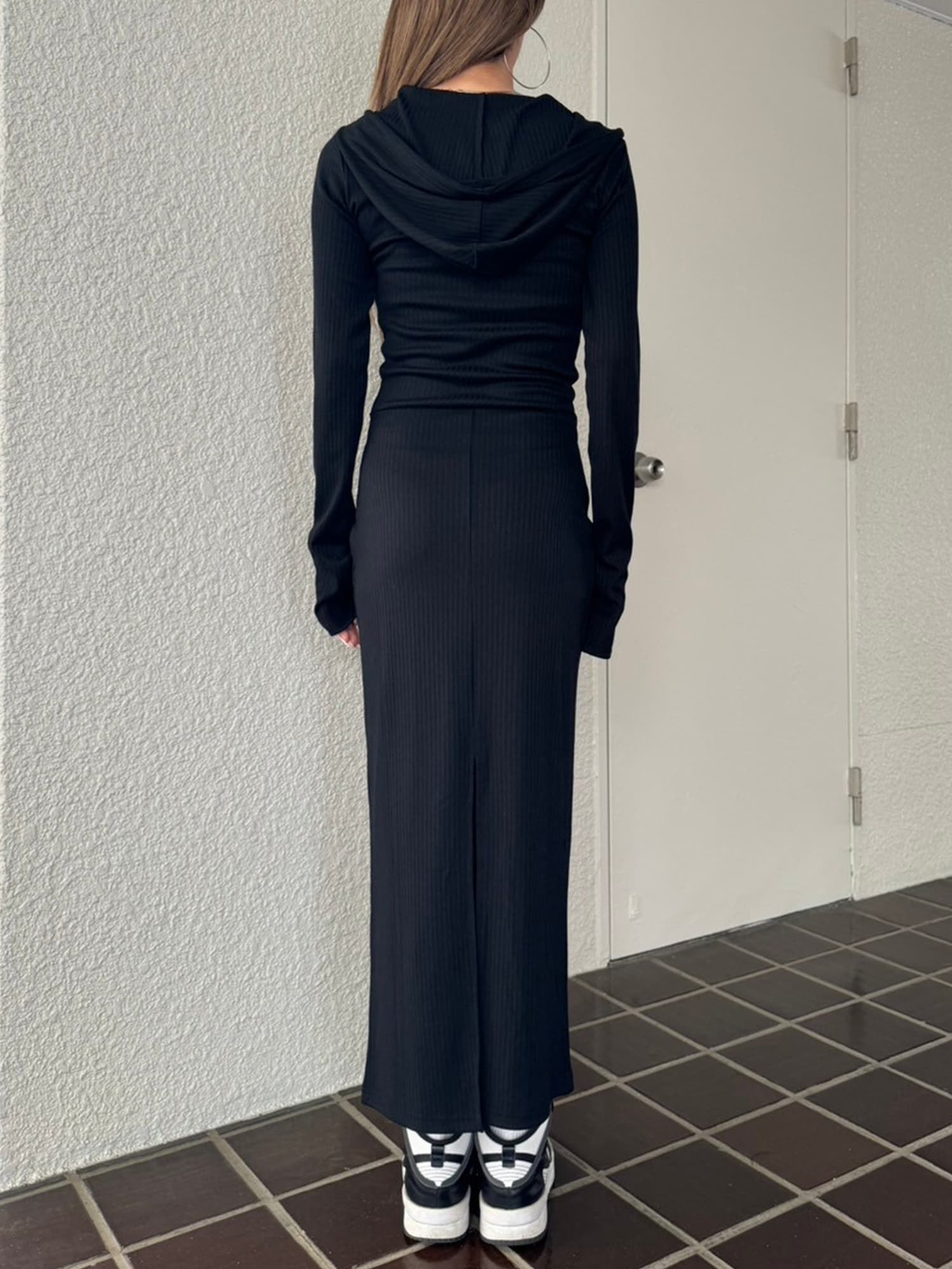- フロントジップリブフーディワンピース