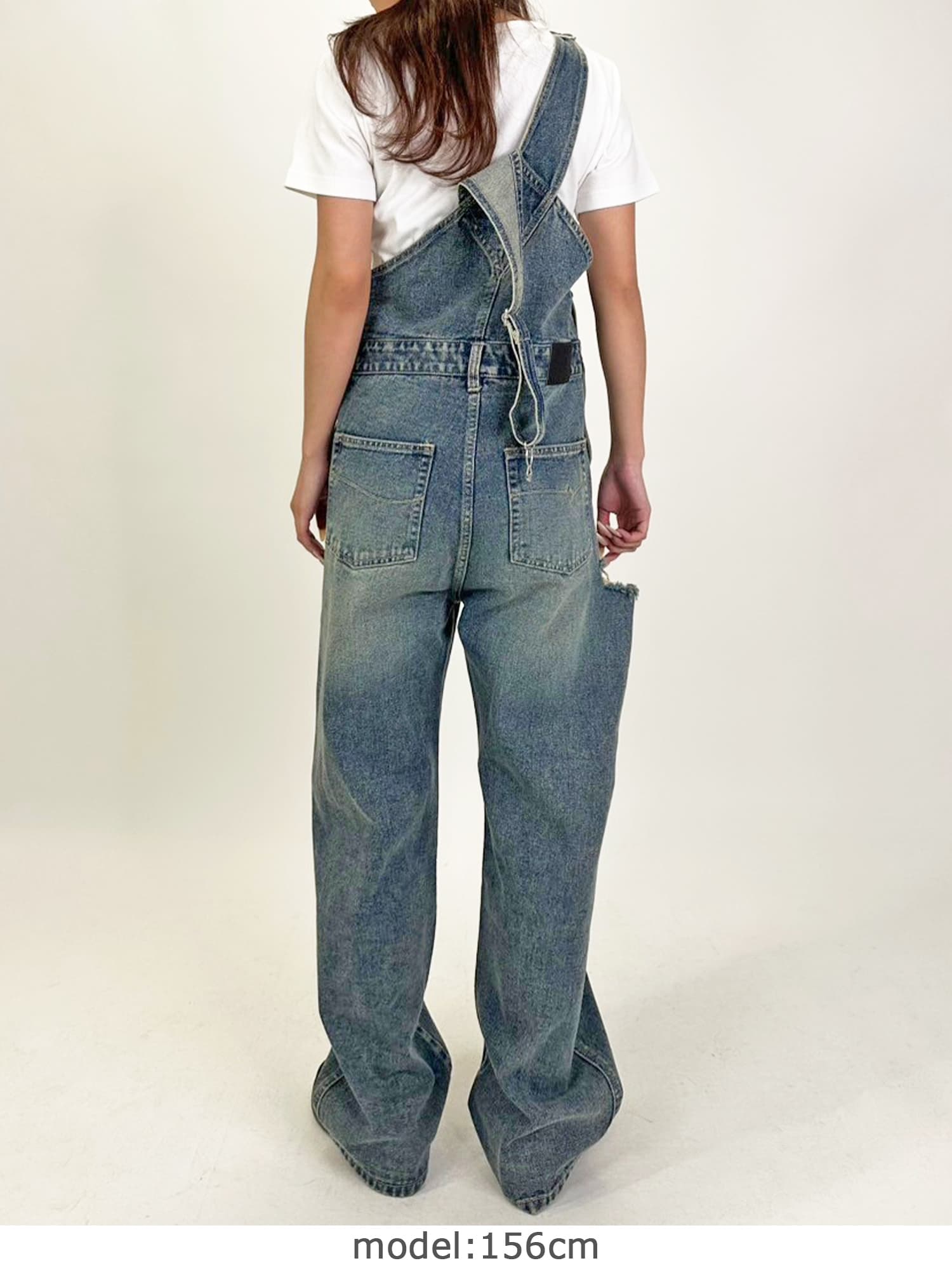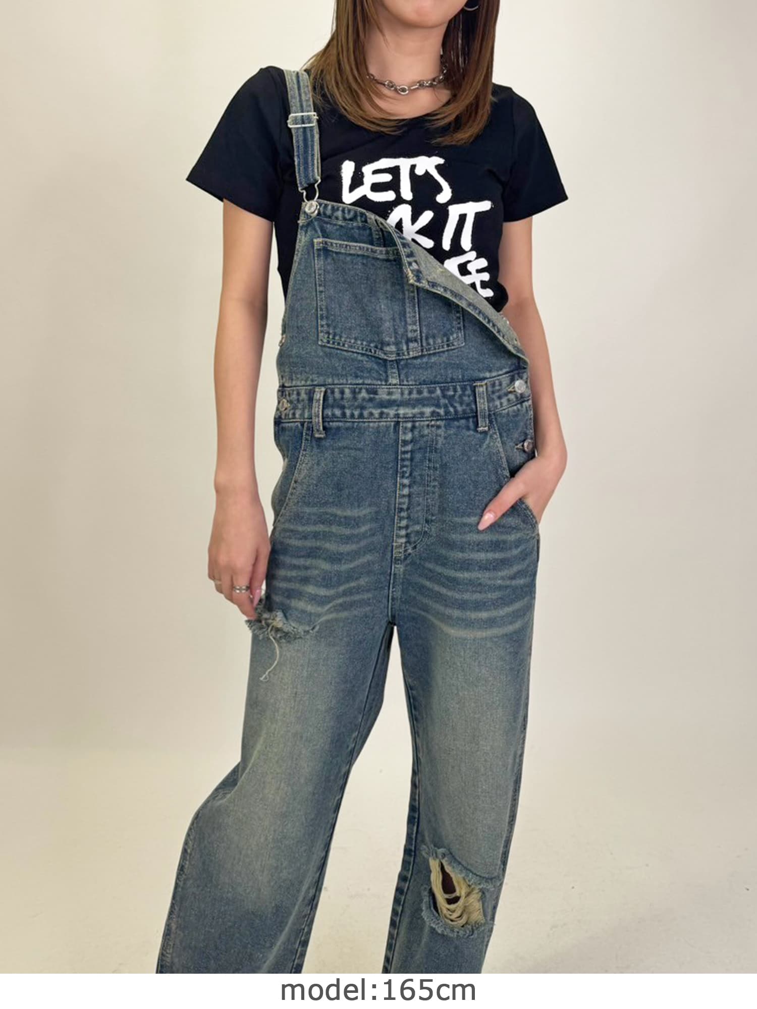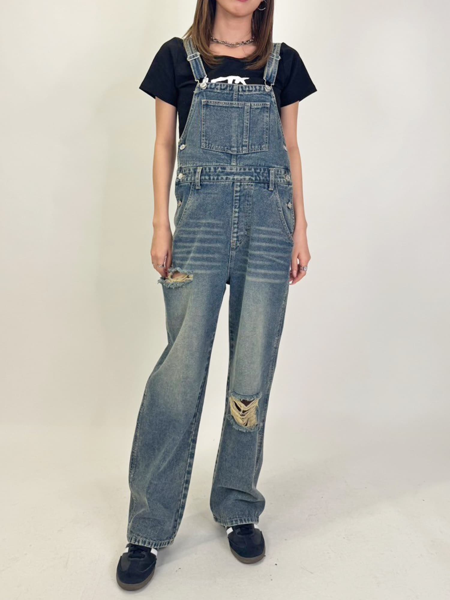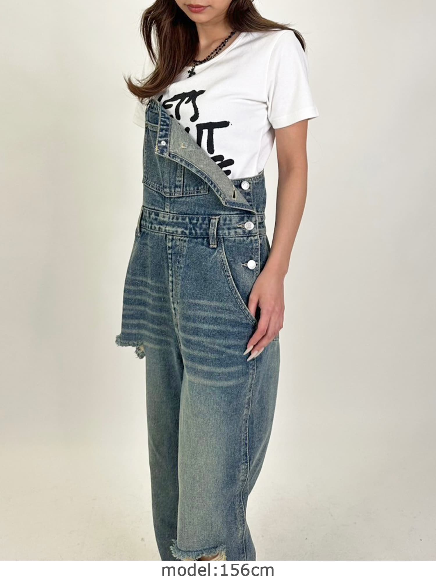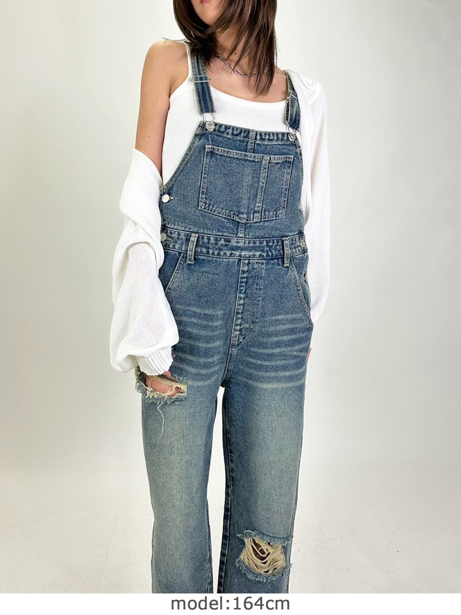 足元にボリュームを出したい場合は、肩紐のアジャスターで調整し下げることでルーズな着こなしに。カジュアルなイメージのオーバーオールでも、モモに施された大胆なダメージでセクシーさを忘れません。