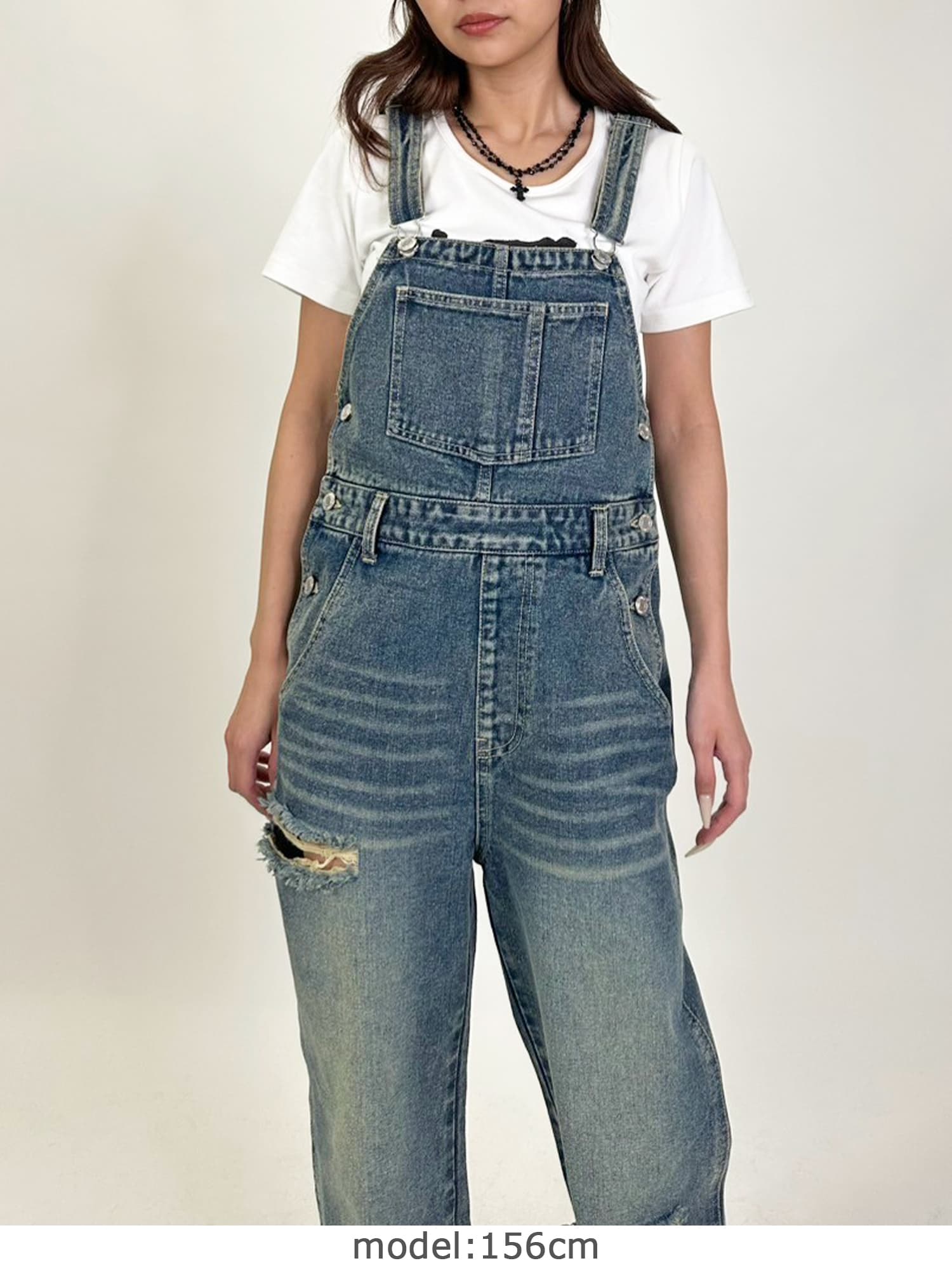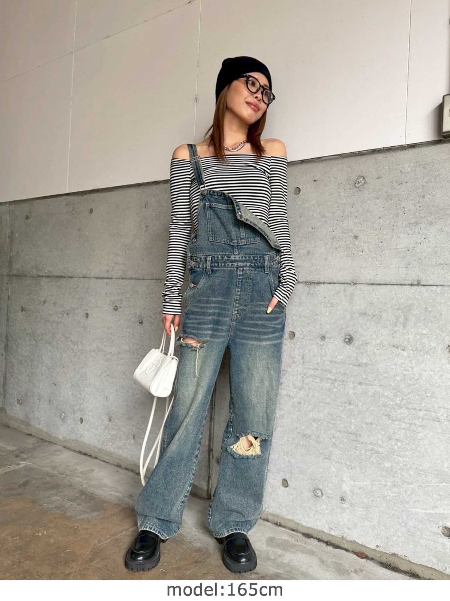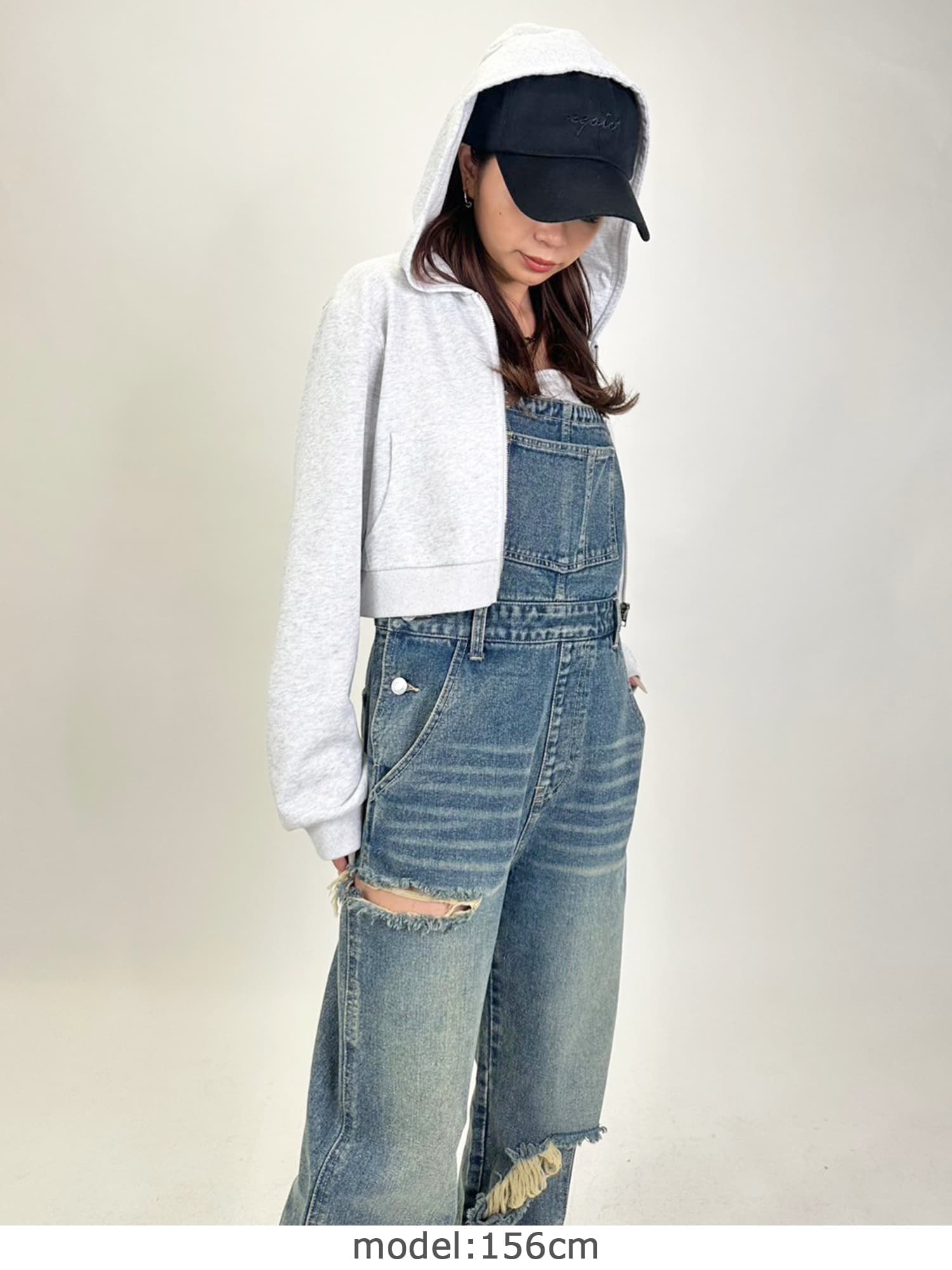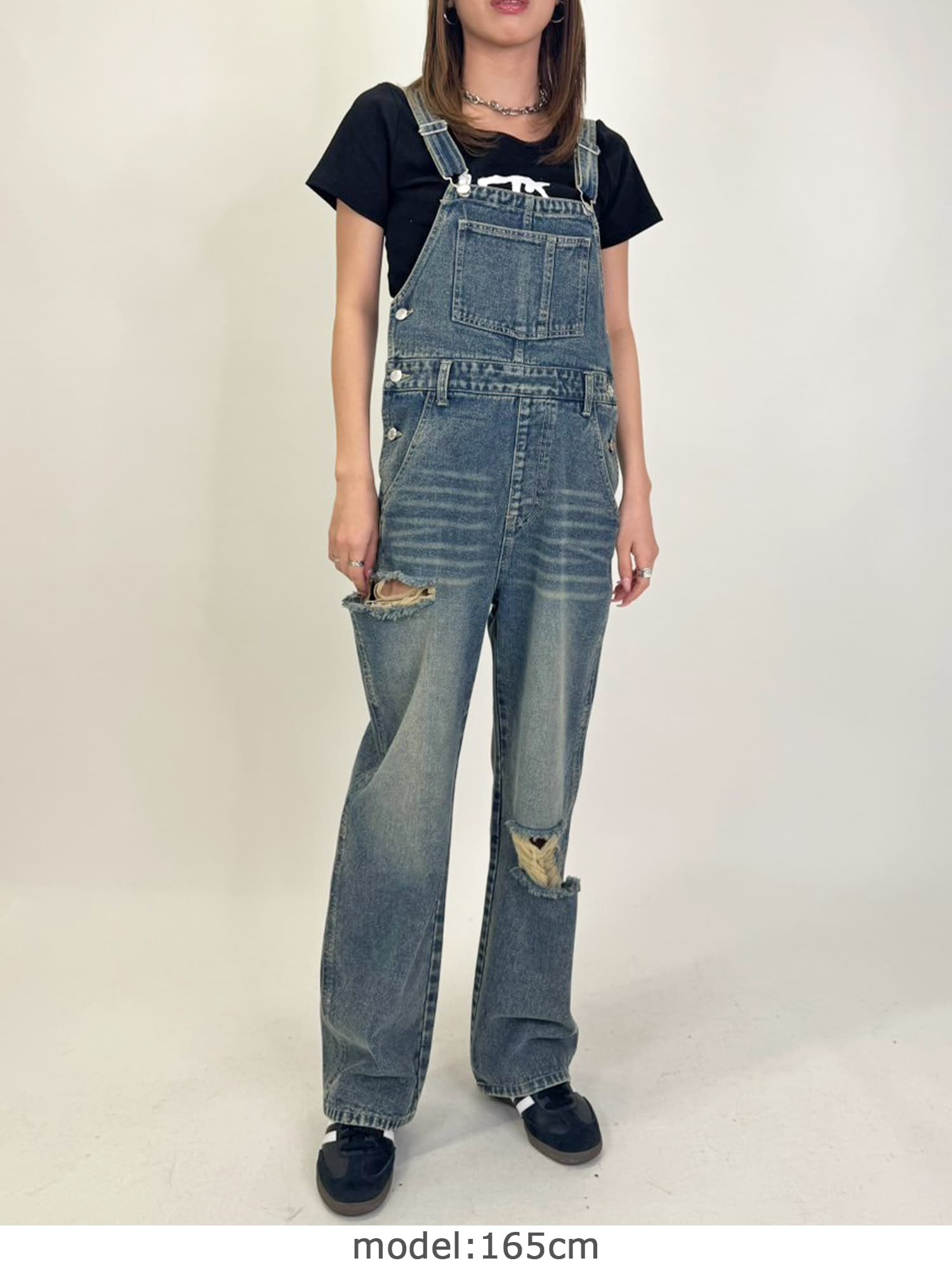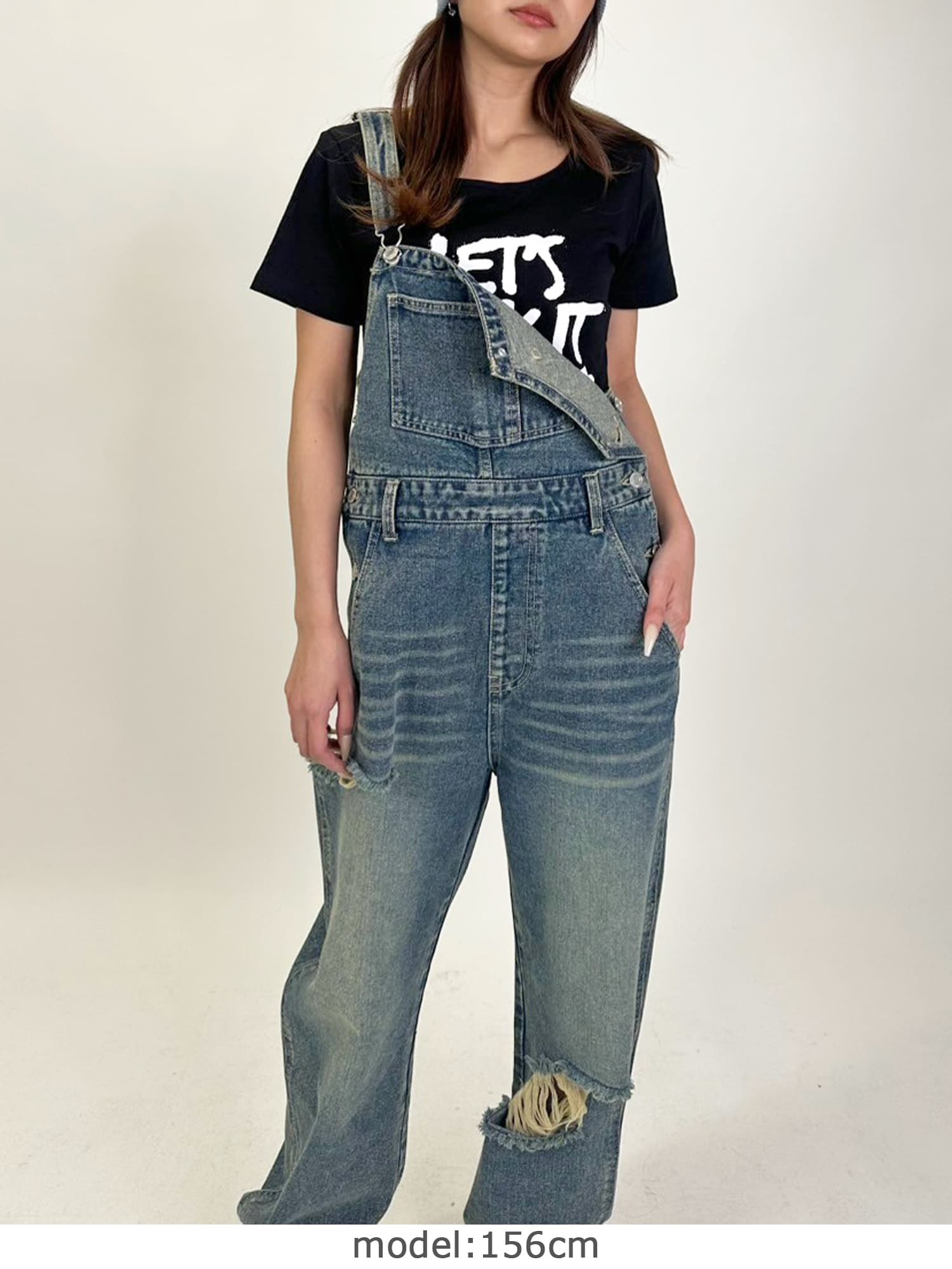 足元にボリュームを出したい場合は、肩紐のアジャスターで調整し下げることでルーズな着こなしに。カジュアルなイメージのオーバーオールでも、モモに施された大胆なダメージでセクシーさを忘れません。