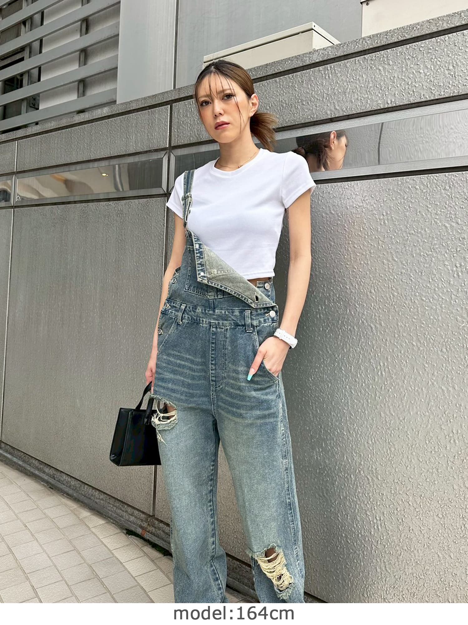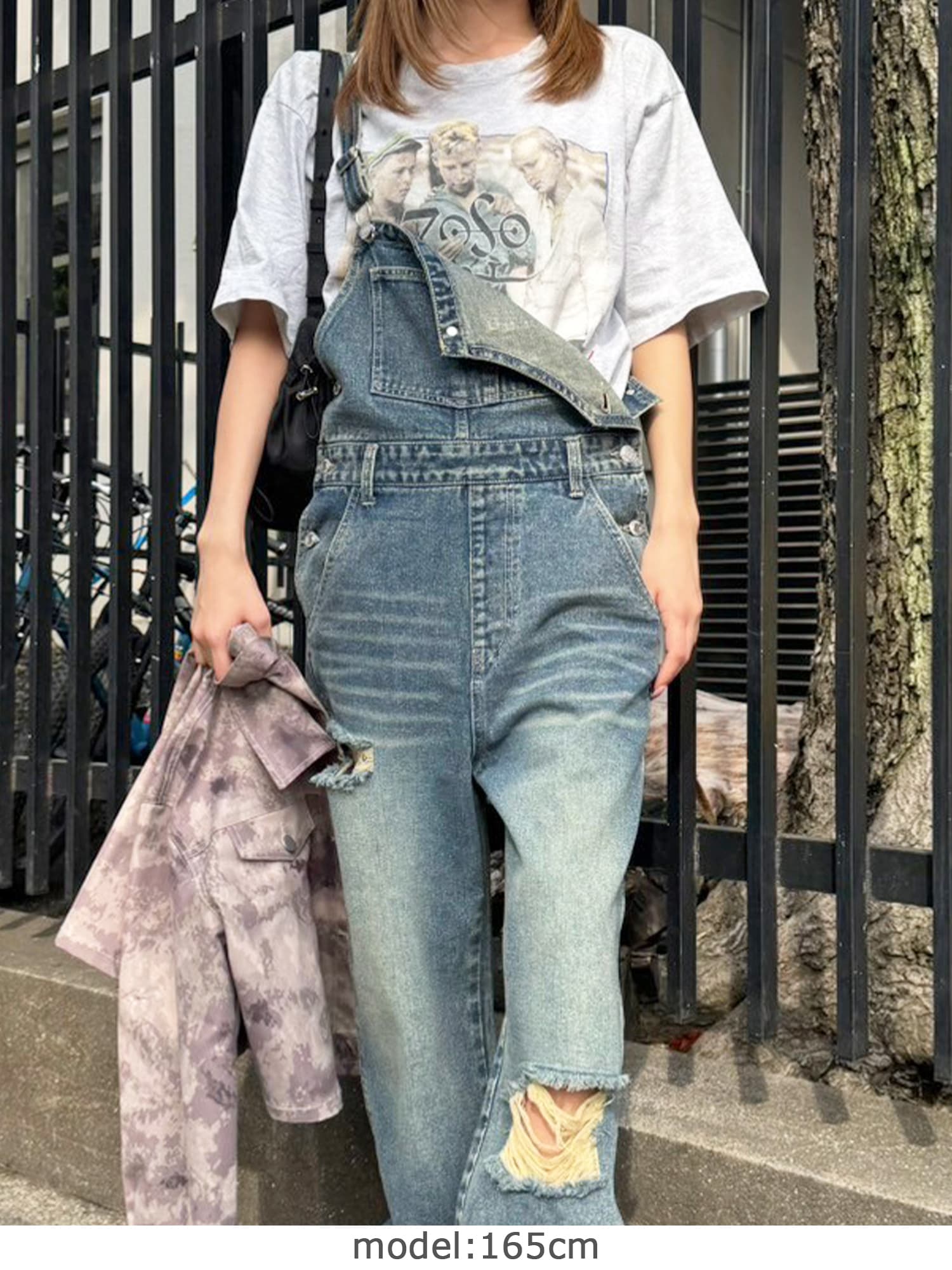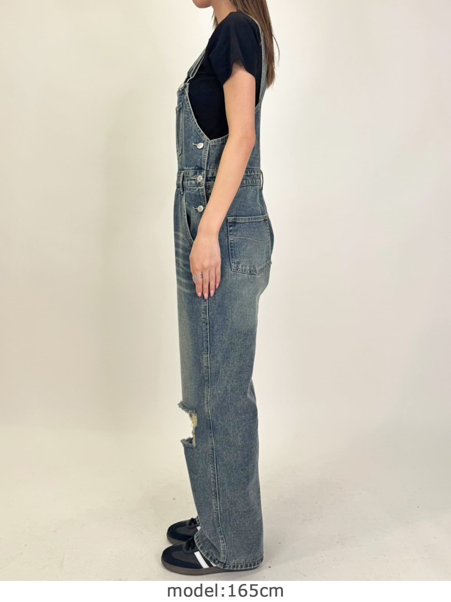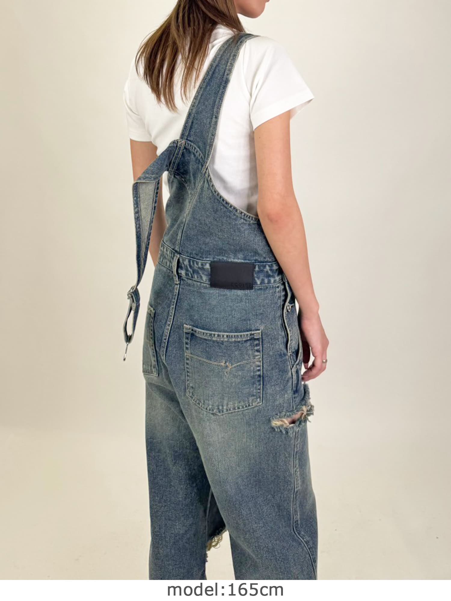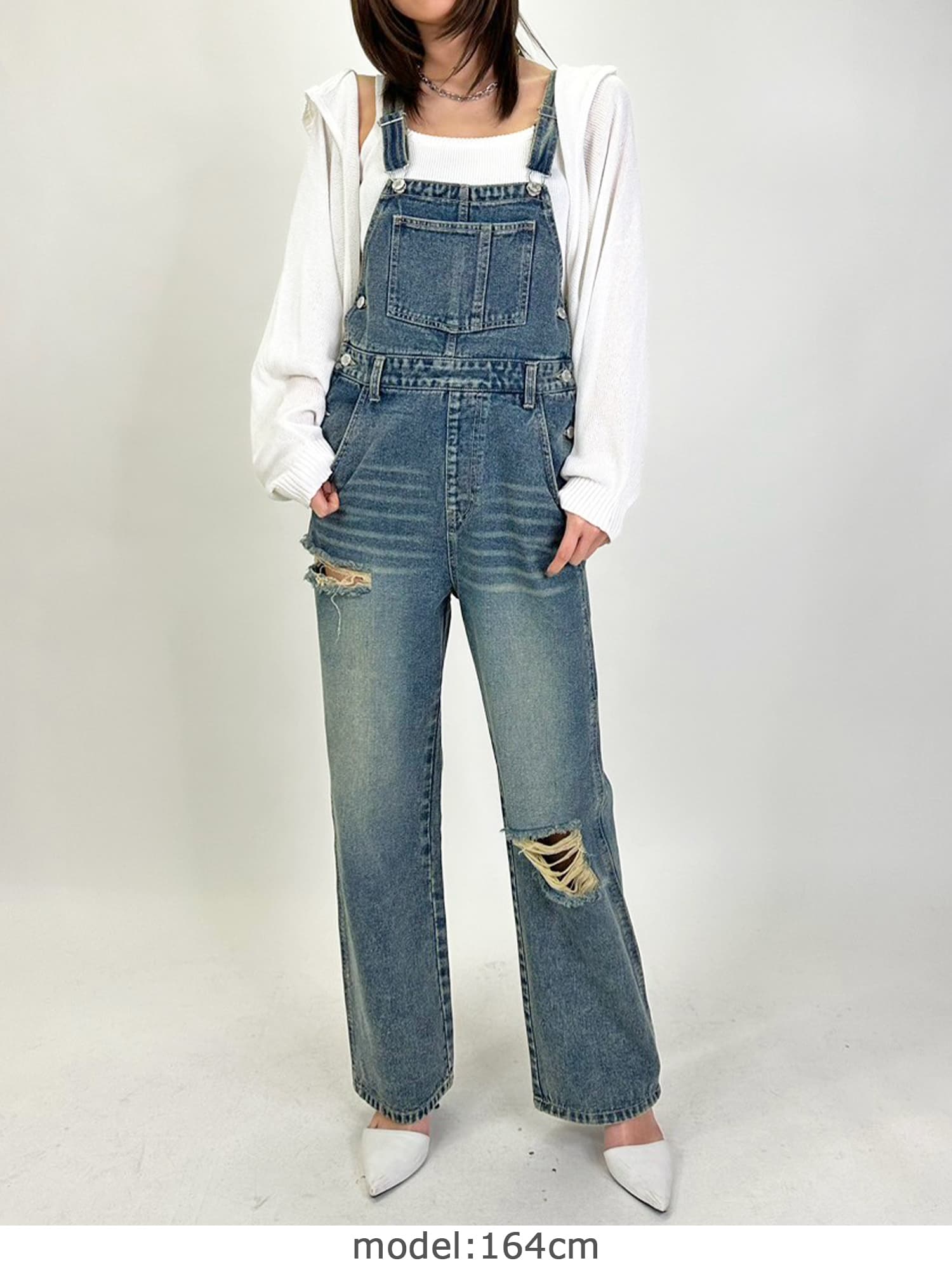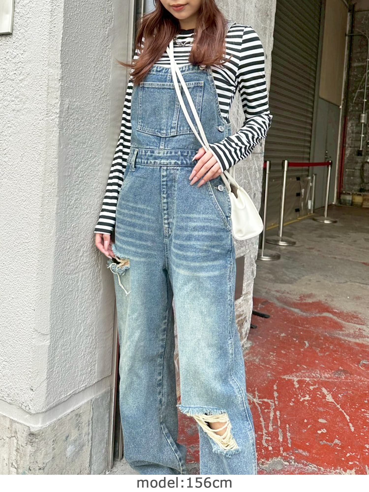 足元にボリュームを出したい場合は、肩紐のアジャスターで調整し下げることでルーズな着こなしに。カジュアルなイメージのオーバーオールでも、モモに施された大胆なダメージでセクシーさを忘れません。
