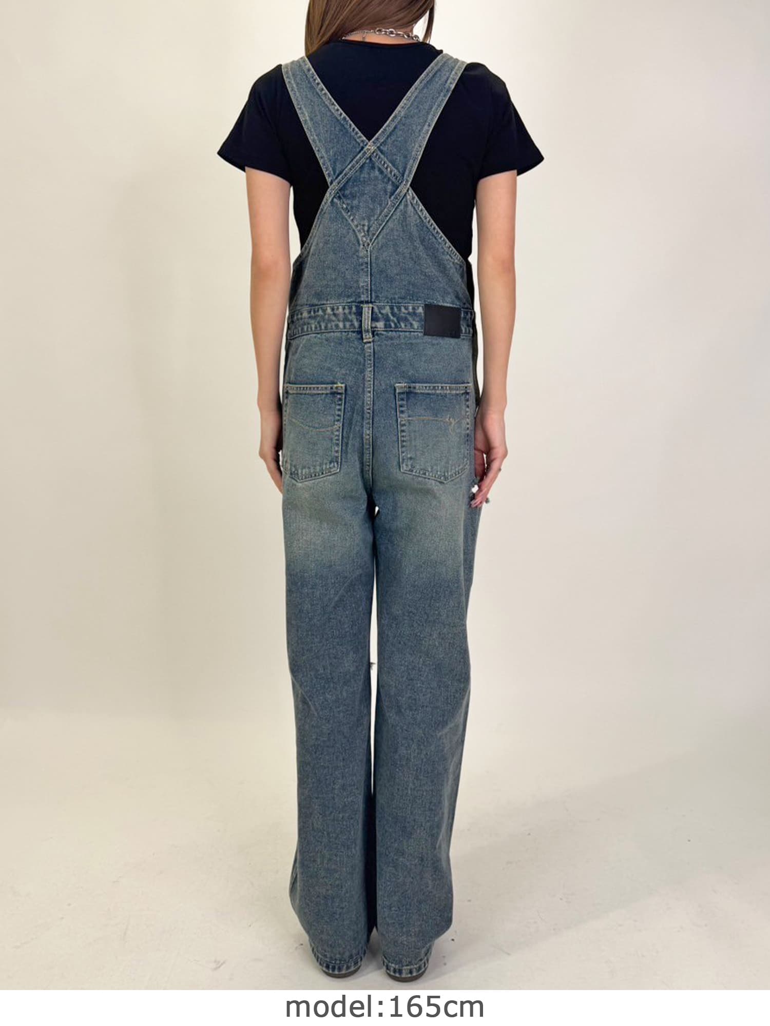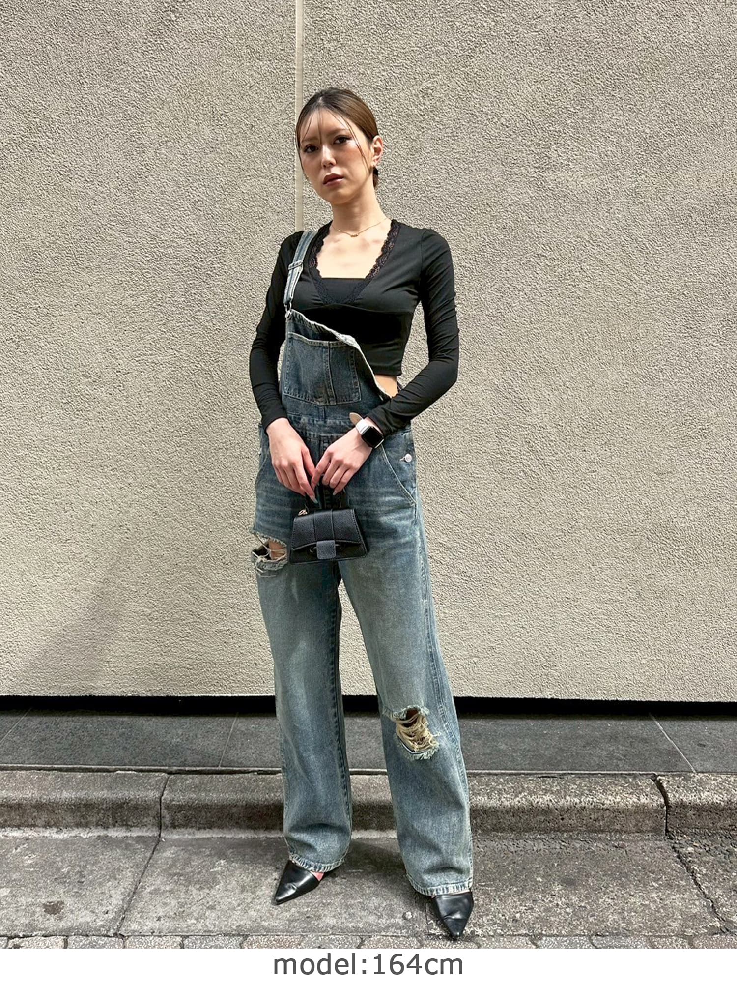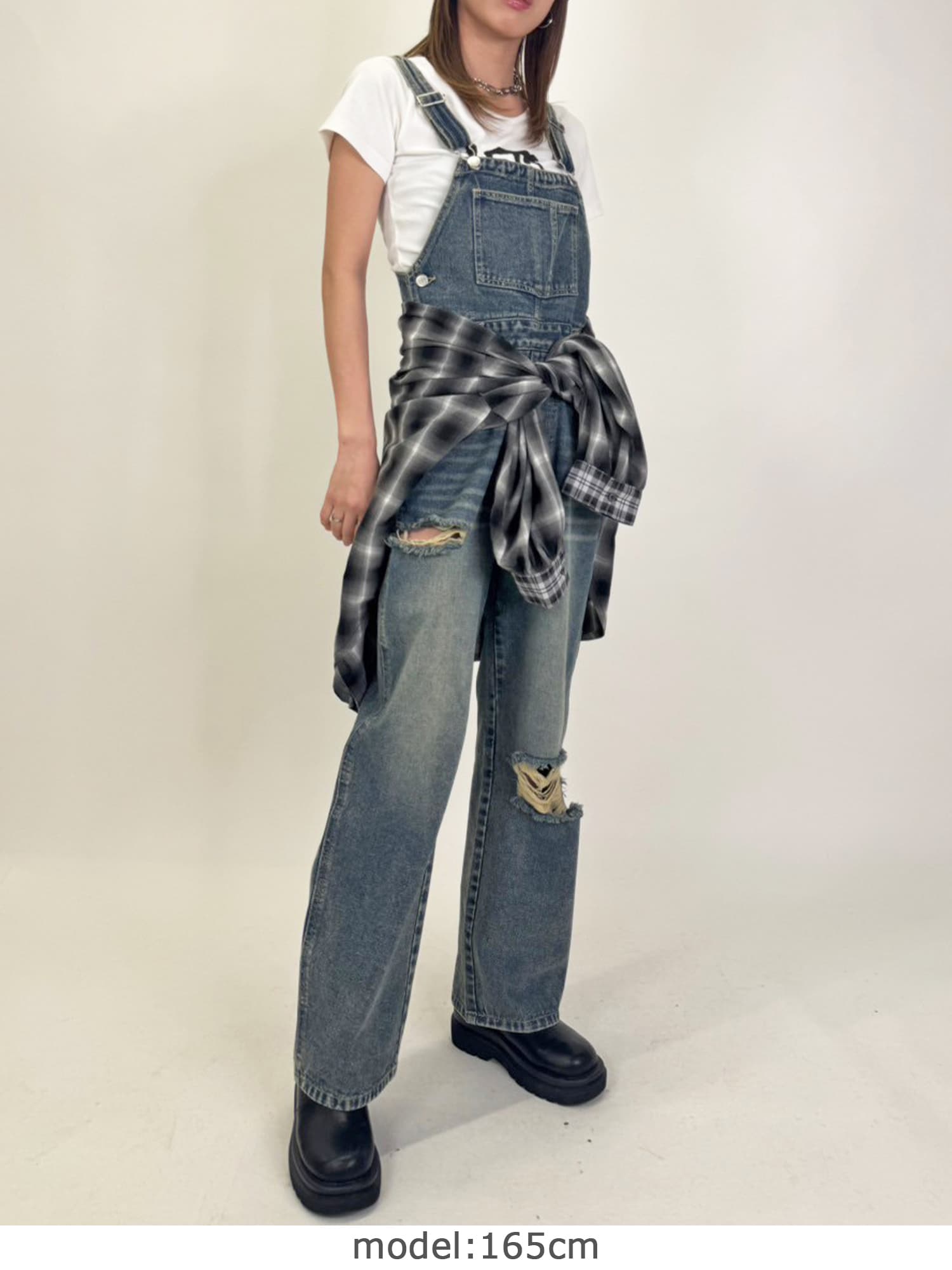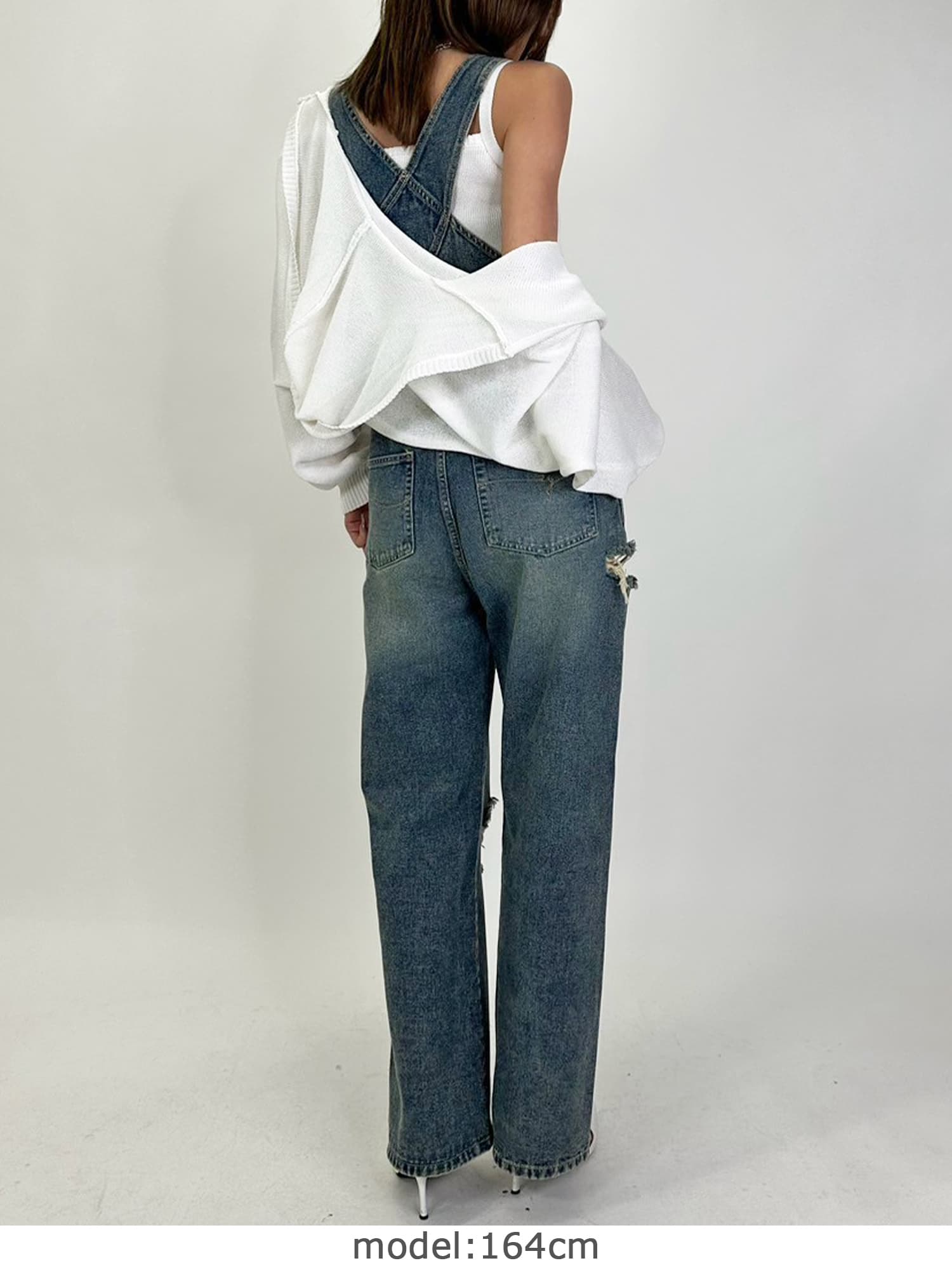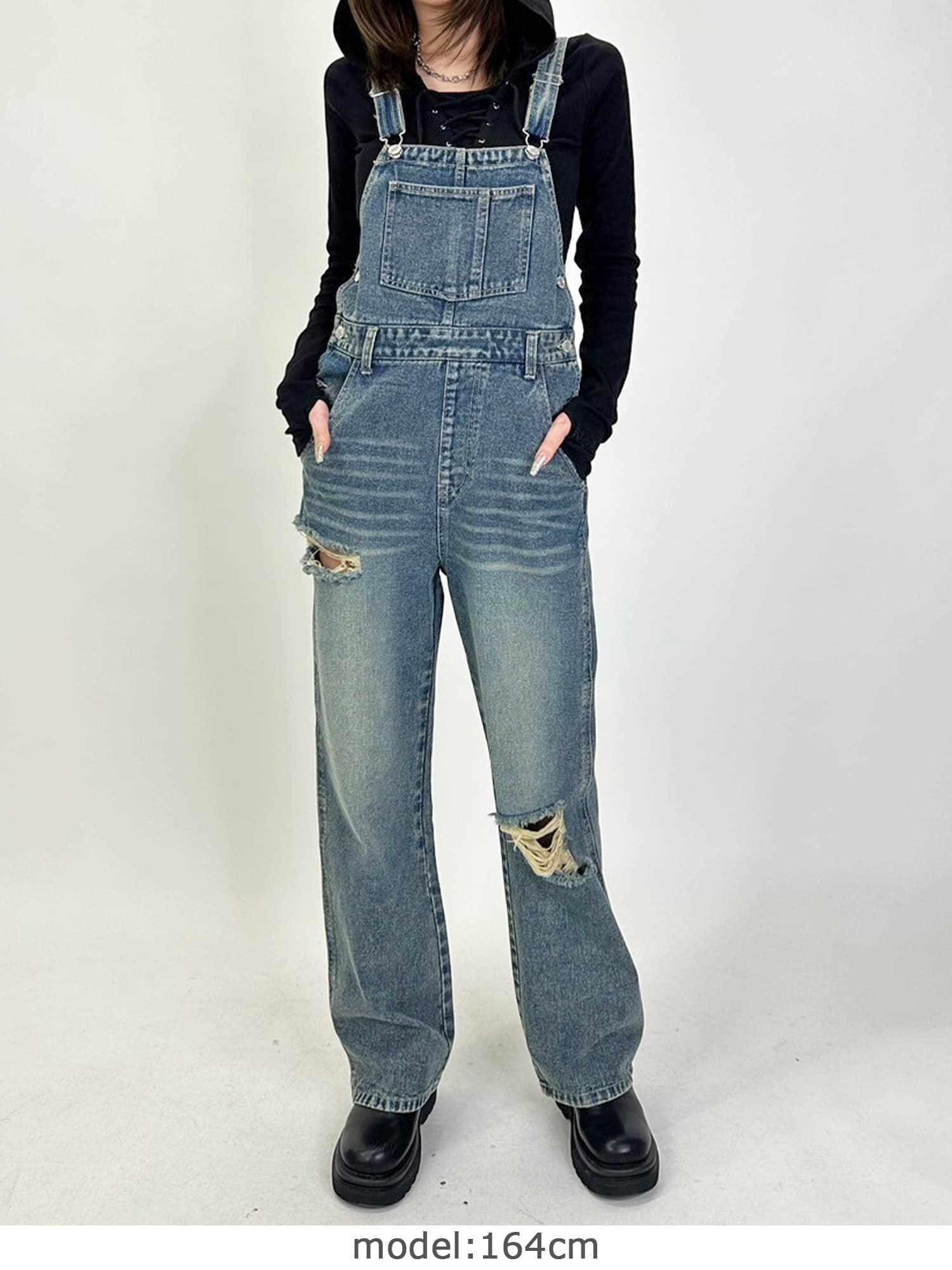 足元にボリュームを出したい場合は、肩紐のアジャスターで調整し下げることでルーズな着こなしに。カジュアルなイメージのオーバーオールでも、モモに施された大胆なダメージでセクシーさを忘れません。