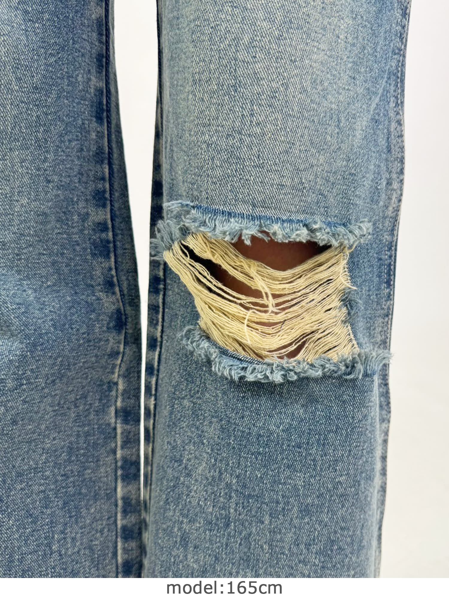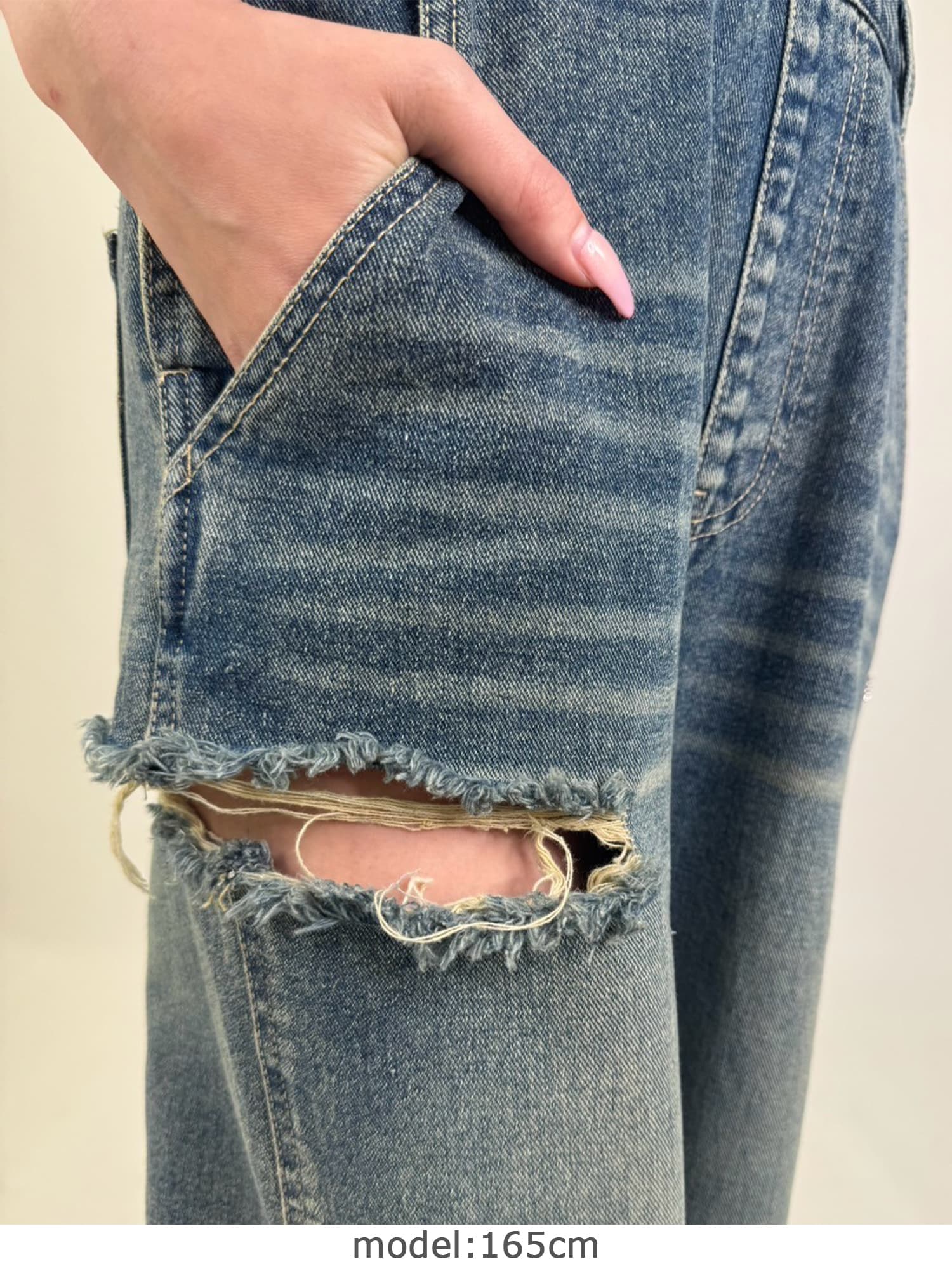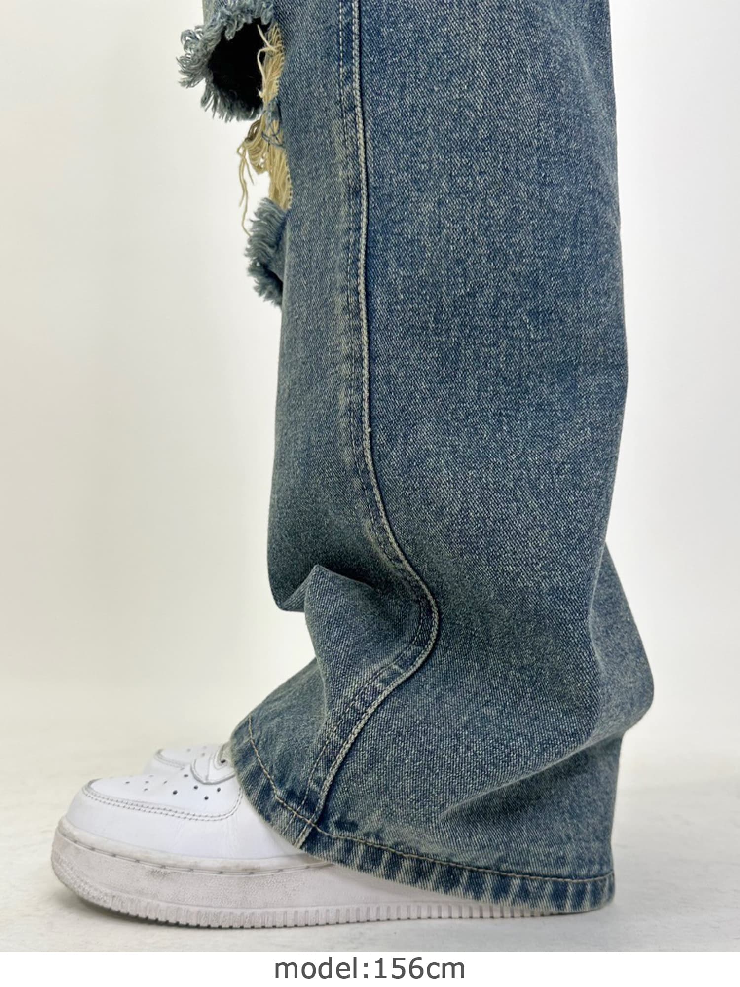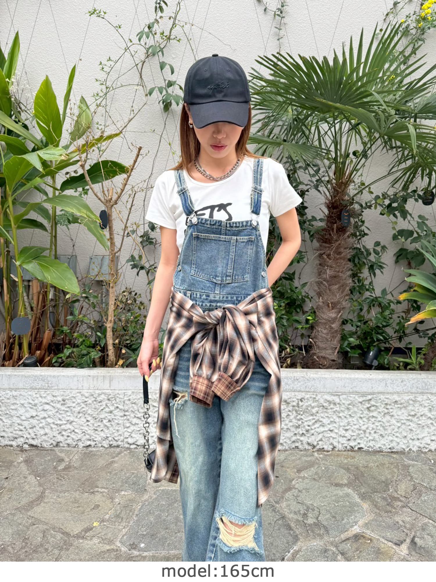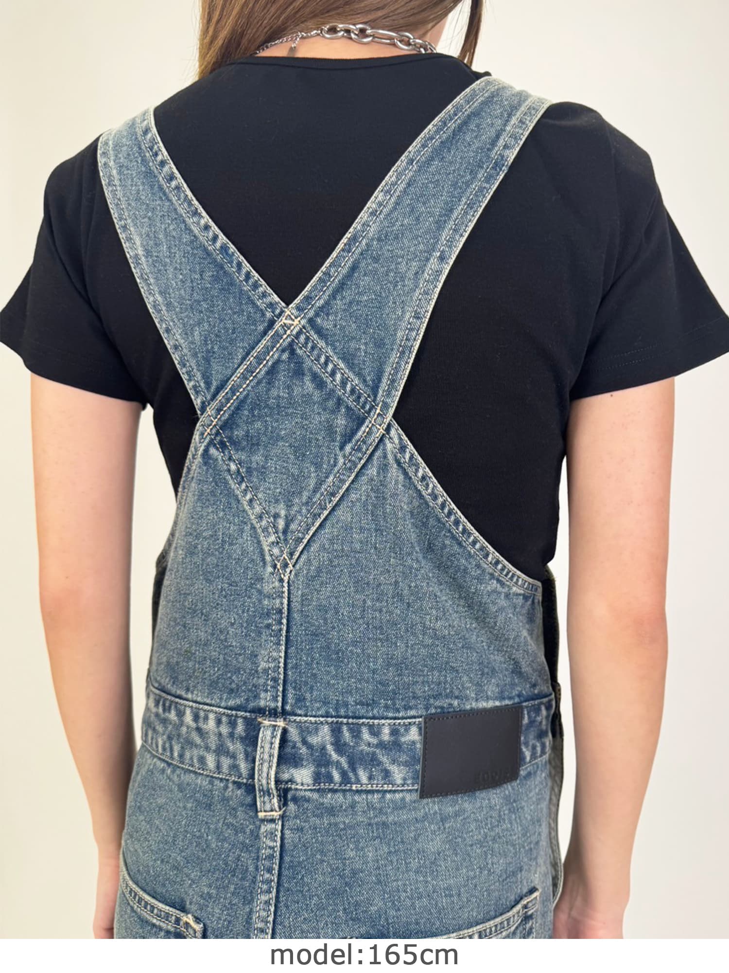 足元にボリュームを出したい場合は、肩紐のアジャスターで調整し下げることでルーズな着こなしに。カジュアルなイメージのオーバーオールでも、モモに施された大胆なダメージでセクシーさを忘れません。